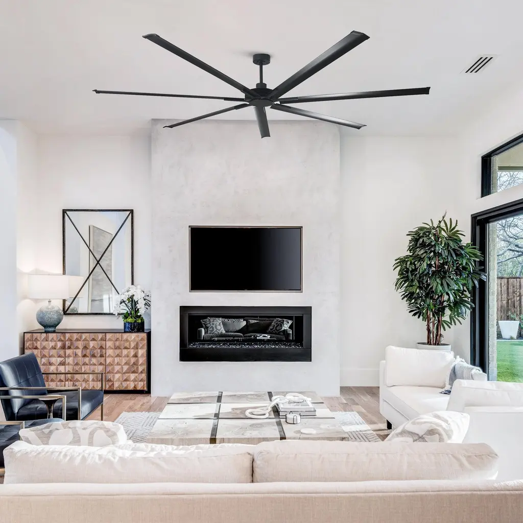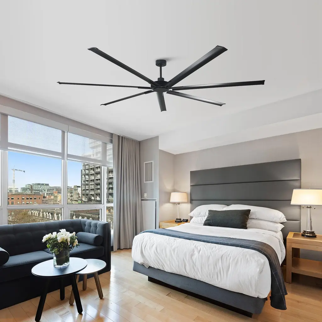 This 84-inch/100-inch industrial extra-large size ceiling fan with a remote control function is designed for large indoor spaces. The 7-blade aluminum reversible fan blades perfectly complement the sophisticated urban edge. The suspension system supports 11-degree ceiling installation. Equipped with an 8-inch/12-inch boom for easy installation and use. It also comes with a 6-speed remote control. The maximum air volume value is 11200CFM/11500CFM. In summer, the air of this ceiling fan flows downward, producing a refreshing breeze. This ceiling fan reverses the flow in winter, spreading warm air evenly throughout the room.