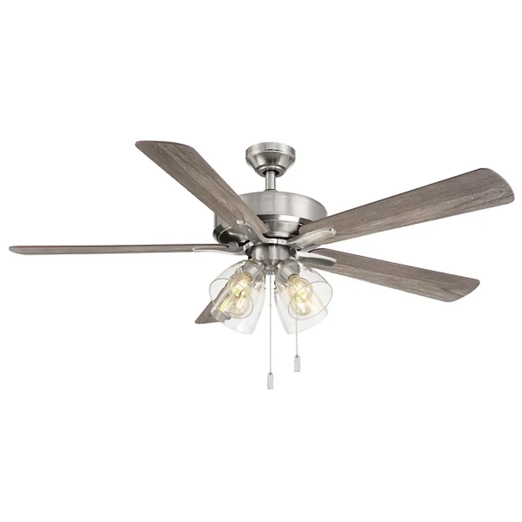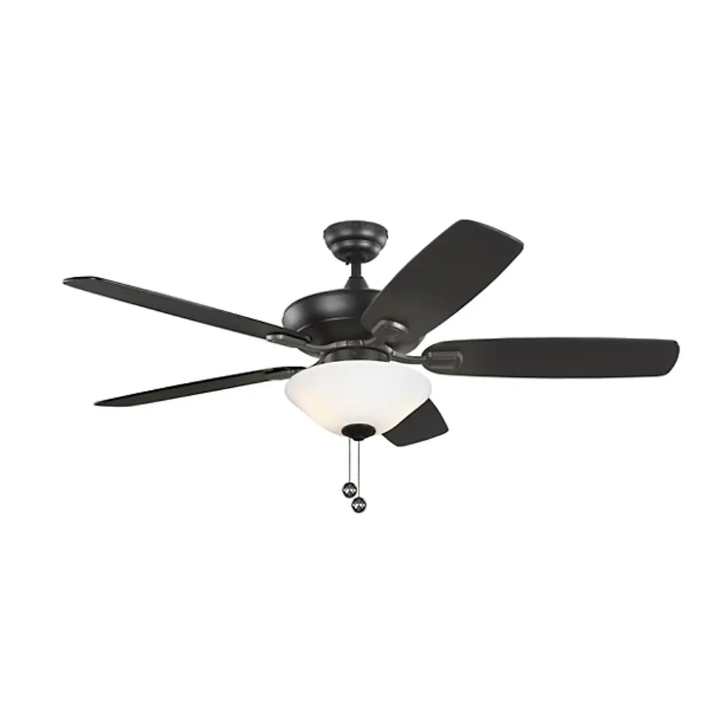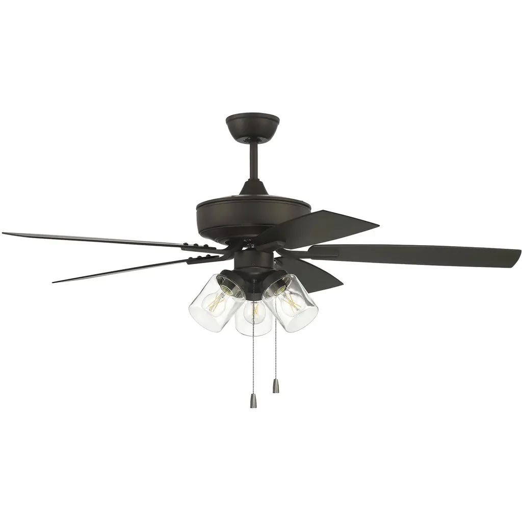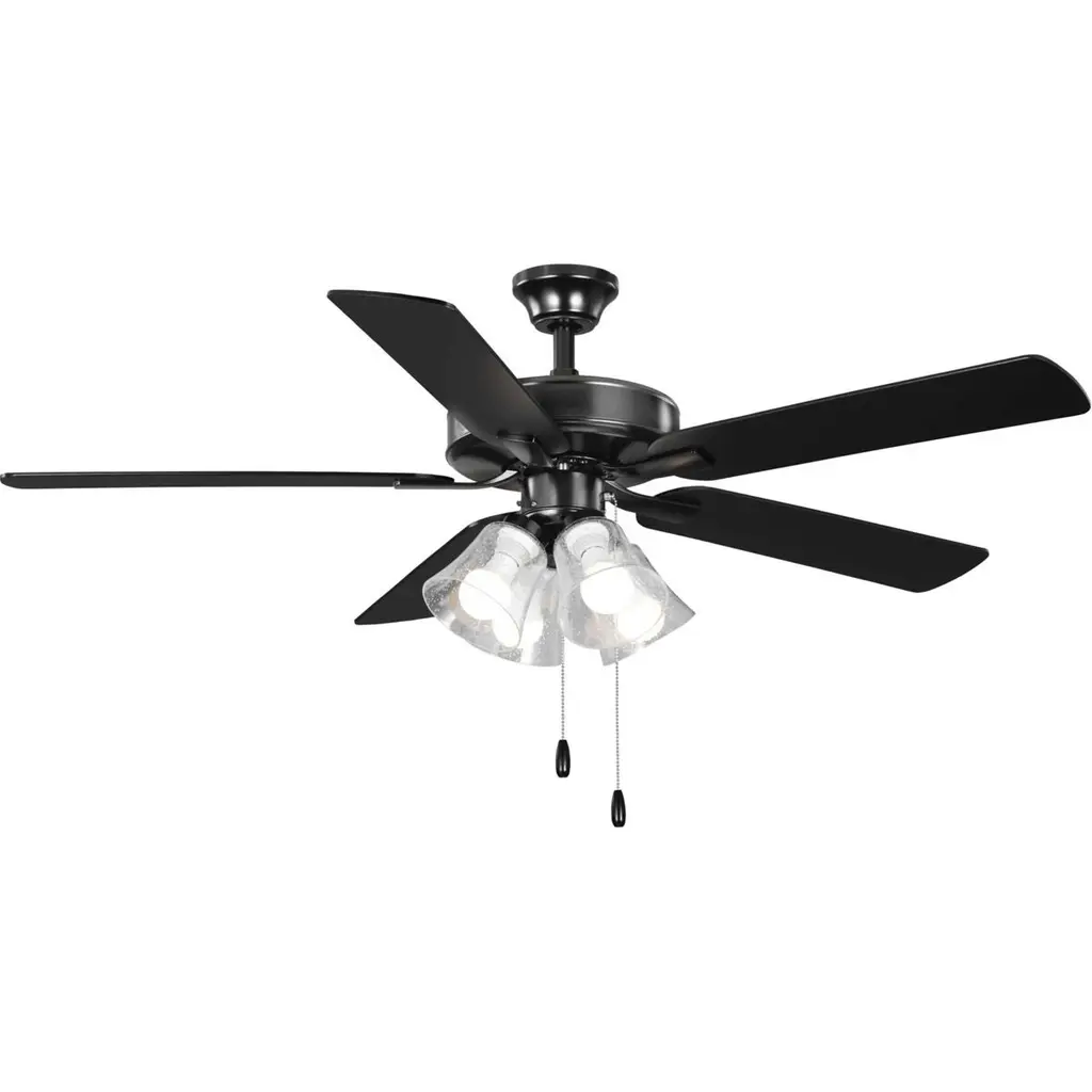 The AirPro 52” 5-blade ceiling fan refreshes interiors with a sleek, modern form coated in a contemporary Matte Black finish. Five clean-lined fan blades extend outward from a streamlined motor housing that contains a powerful AC motor. Its versatile yet timeless design makes it ideal for a wide range of interior décor styles. The fan has an AC motor and is rated for maximum efficiency. A Unipack option packages the light kit so that it ships with the fan, eliminating both the need to order the light kit separately and having the light kit shipped separately from the fan. Four clear seeded glass shades offer beauty and style. Four medium based LED lamps (8.5-Watt, 80CRI, 3000K) are included. An accessory wall and remote control can be added (sold separately). The fan can be installed on a flat or sloped ceiling. The blade arms have Captive Screws allowing for easier installation.