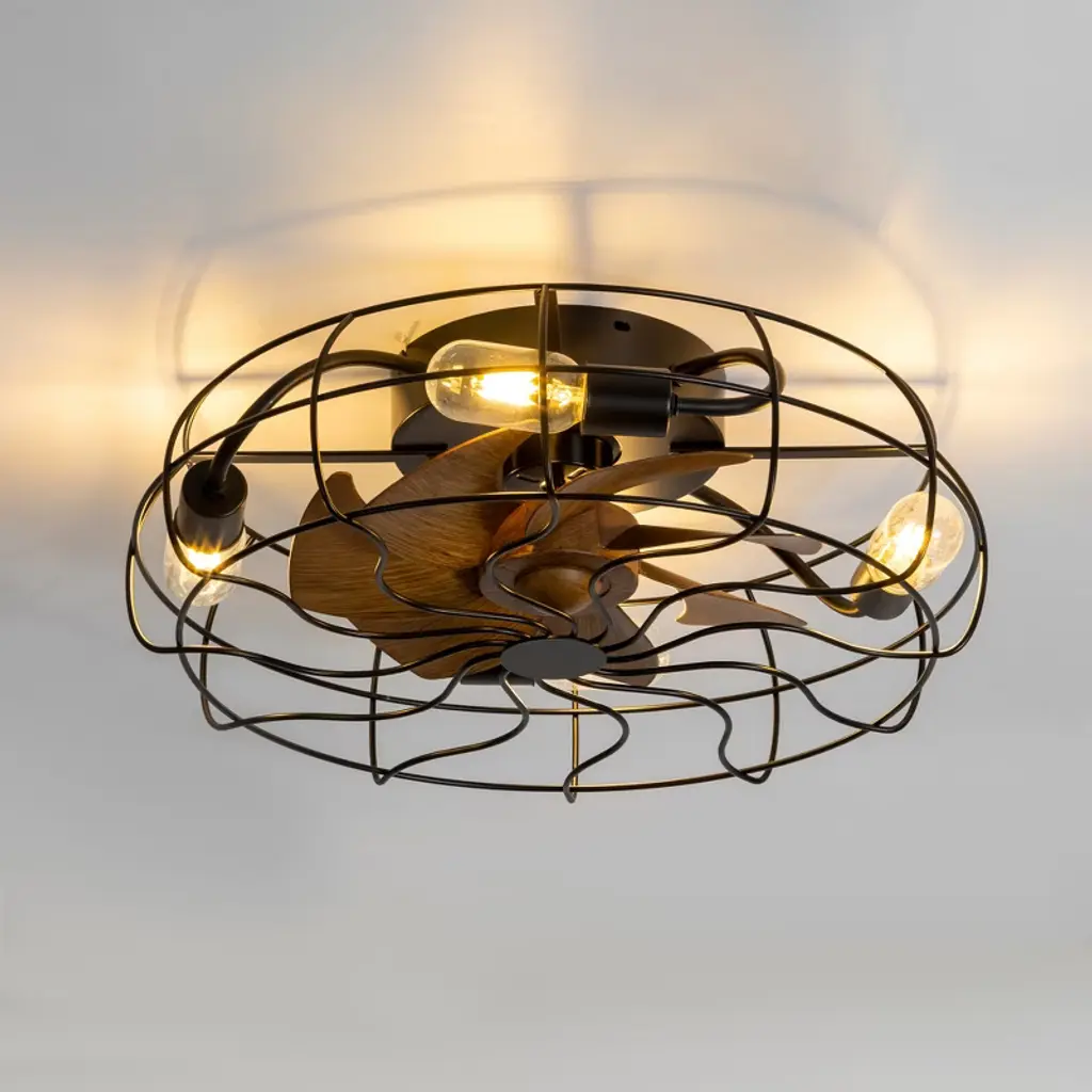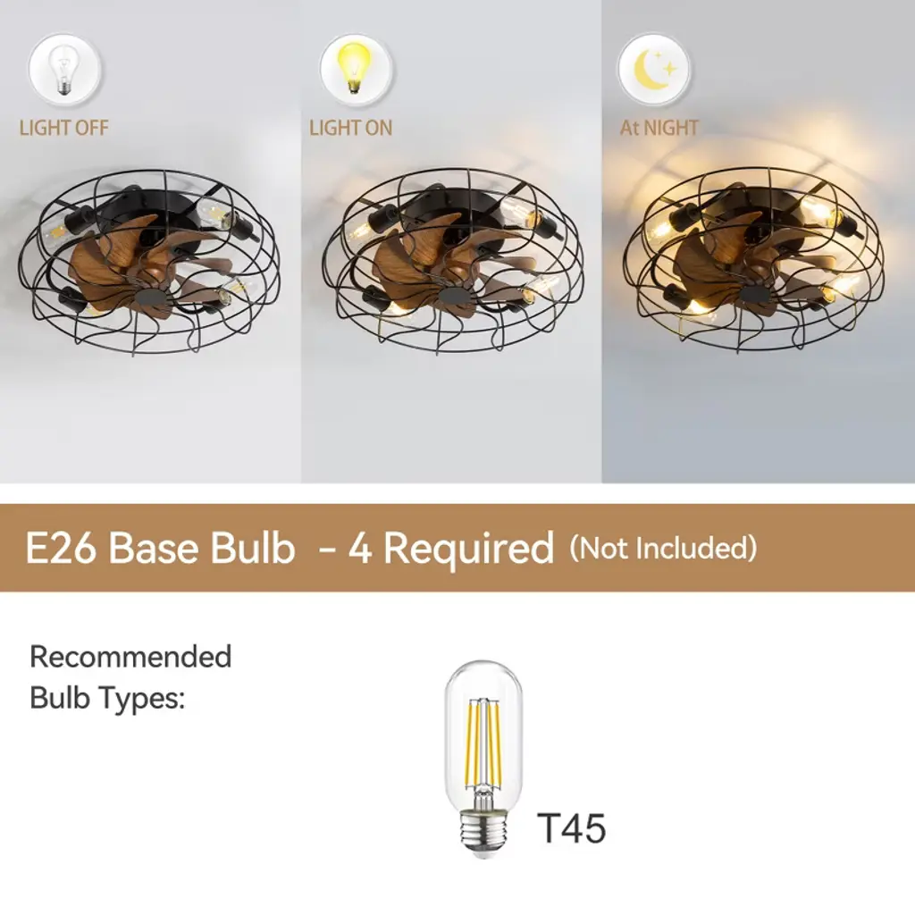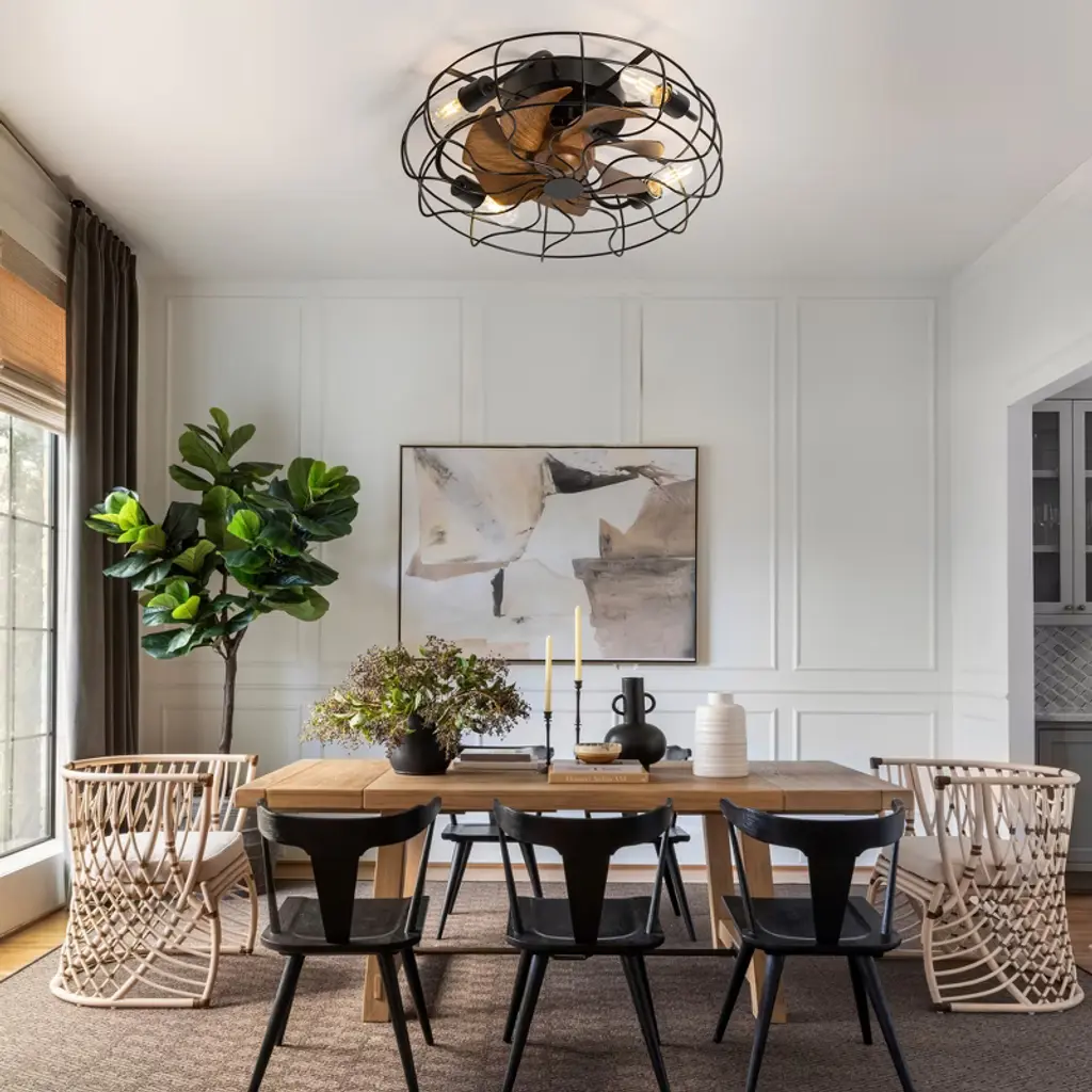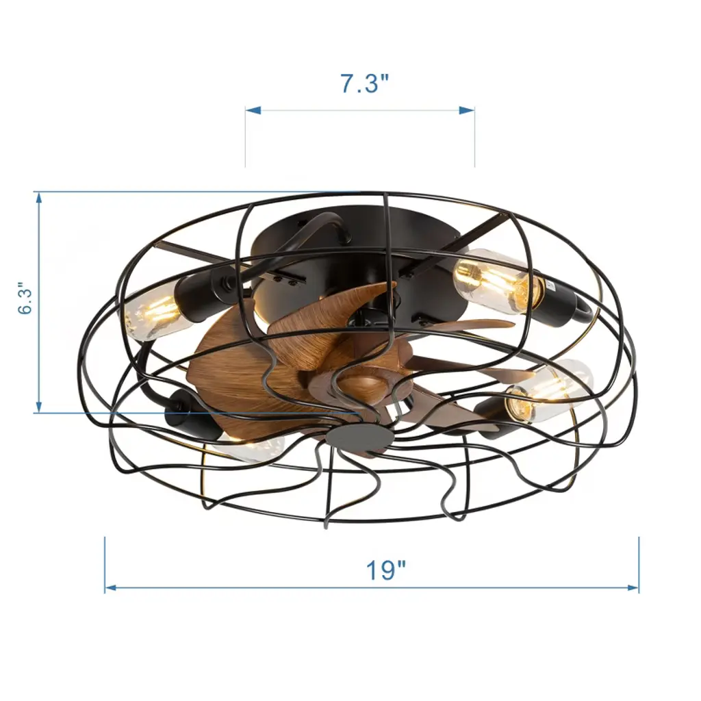 This 19 inch matte black cage shaped circular iron mesh lampshade blends different industrial and retro elements, understated yet luxurious.Configure 4 T45 lamp sockets to provide you with good lighting (bulbs not included),and the memory function can maintain the previous wind speed setting within 15 seconds of power failure.The remote control provides 6 wind speed settings,which can be switched to different gears according to needs to ensure comfort during use. At the same time,the built-in strong DC motor not only has high power, but also runs fast without noise,creating a quiet and comfortable sleeping environment.
