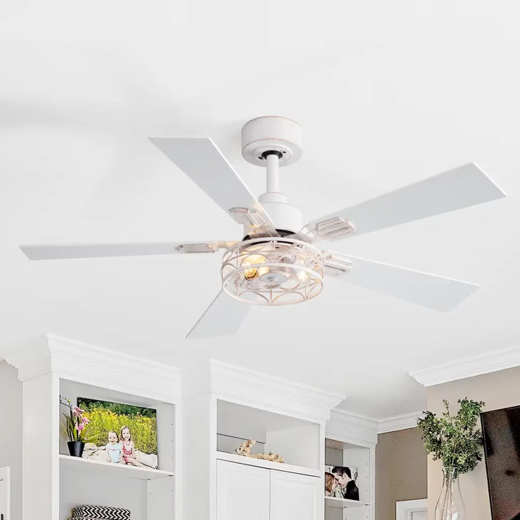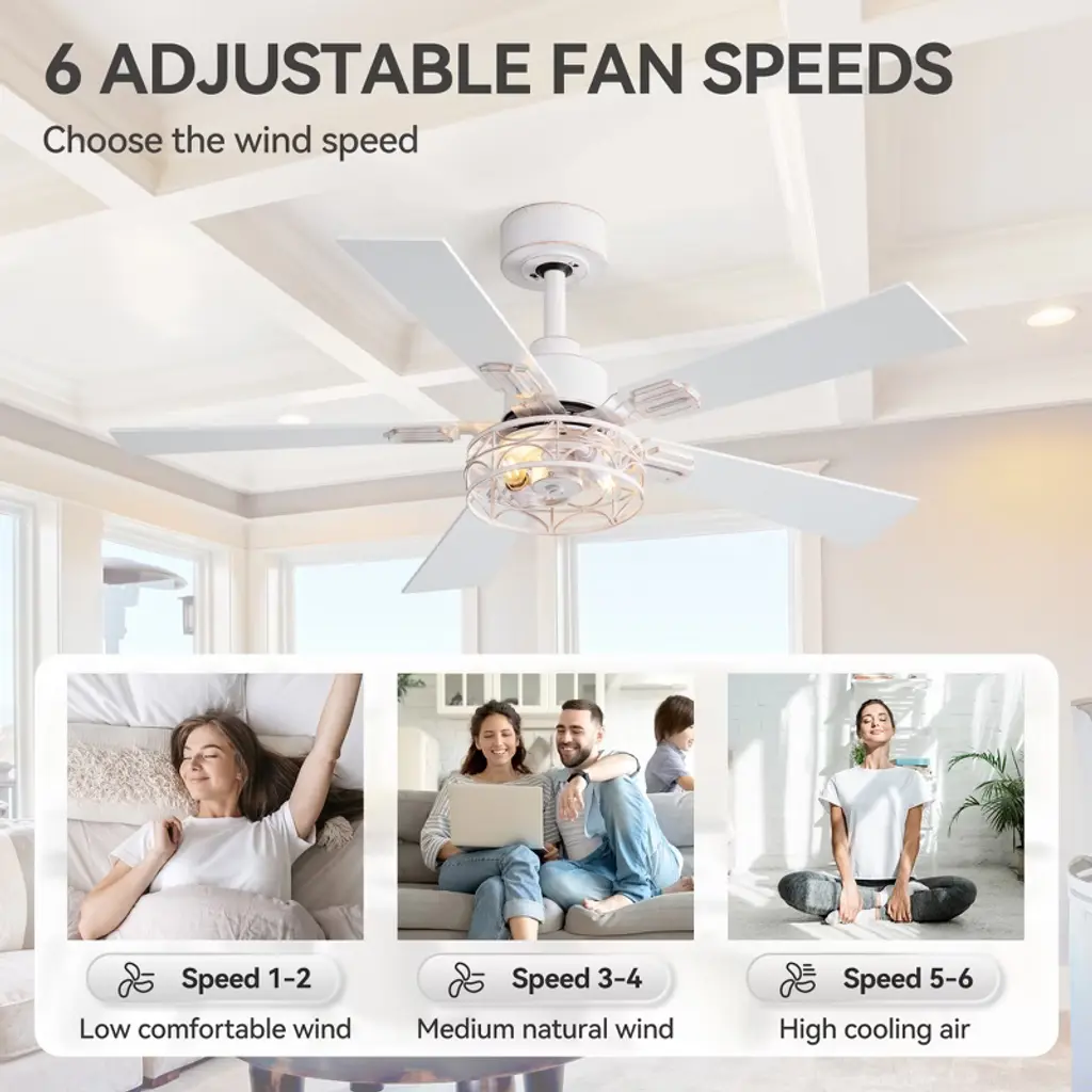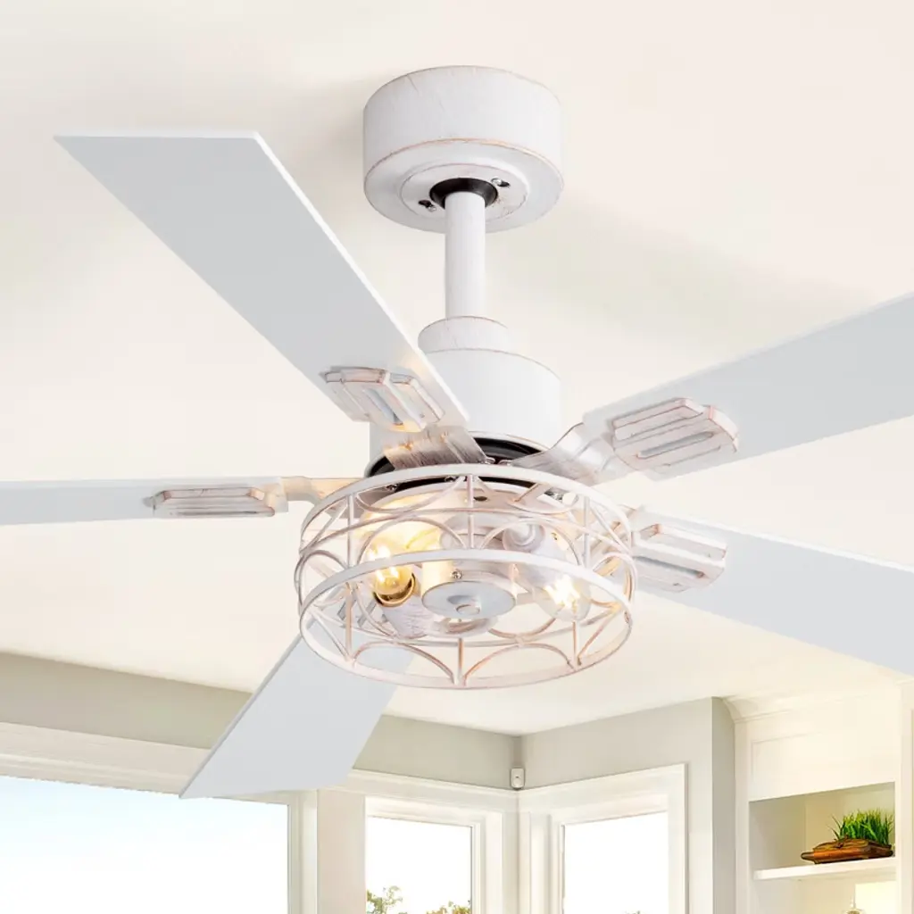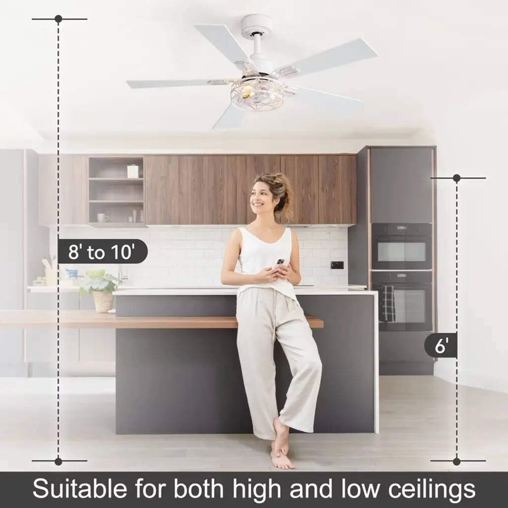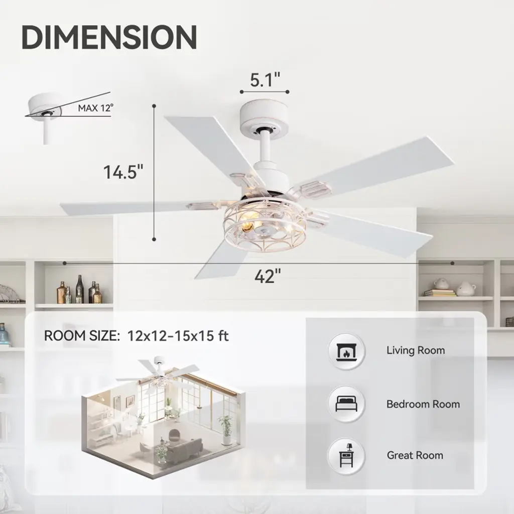 Elegant Function Meets Compact Power — Modern 42" Ceiling Fan in Brushed White Gold. Bring a fresh, modern upgrade to your space with this 42-inch ceiling fan in a sophisticated brushed white gold finish. Designed for smaller rooms, this fan features five sleek plywood blades for balanced airflow and stylish presence. The reversible, whisper-quiet motor provides year-round comfort — offering cool breezes in summer and warm air circulation in winter.Compatible with two E12 base bulbs (not included), the fan gives you flexibility in lighting style and brightness. The remote control allows for easy operation, while the light memory function ensures your preferred brightness returns with every use.