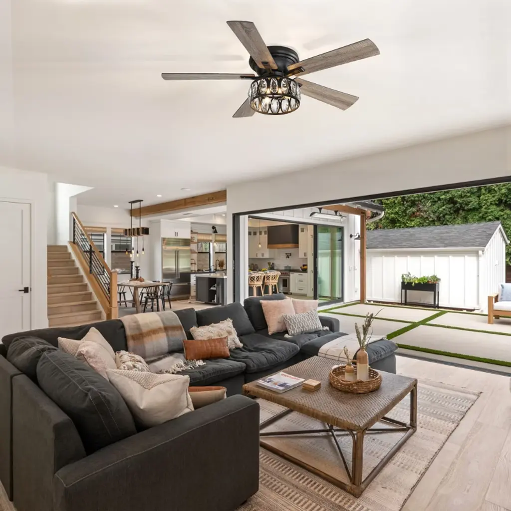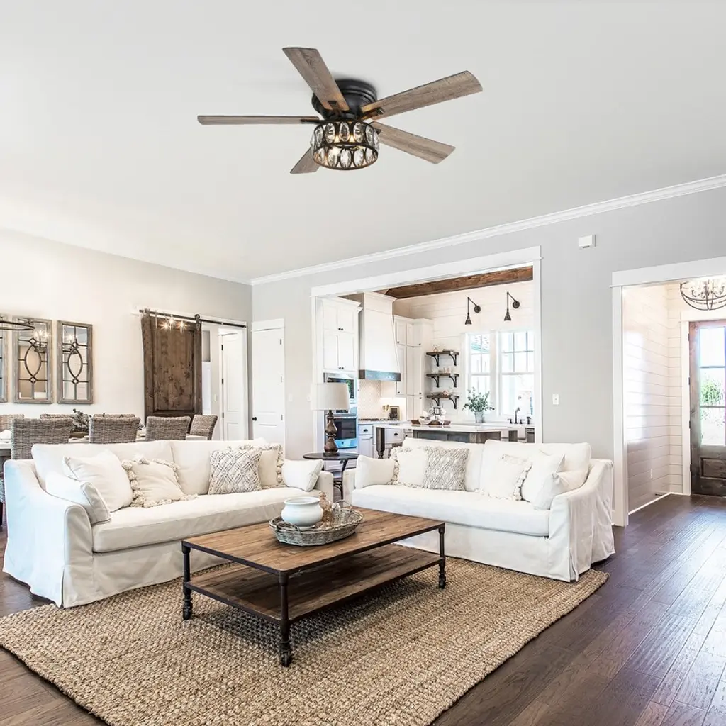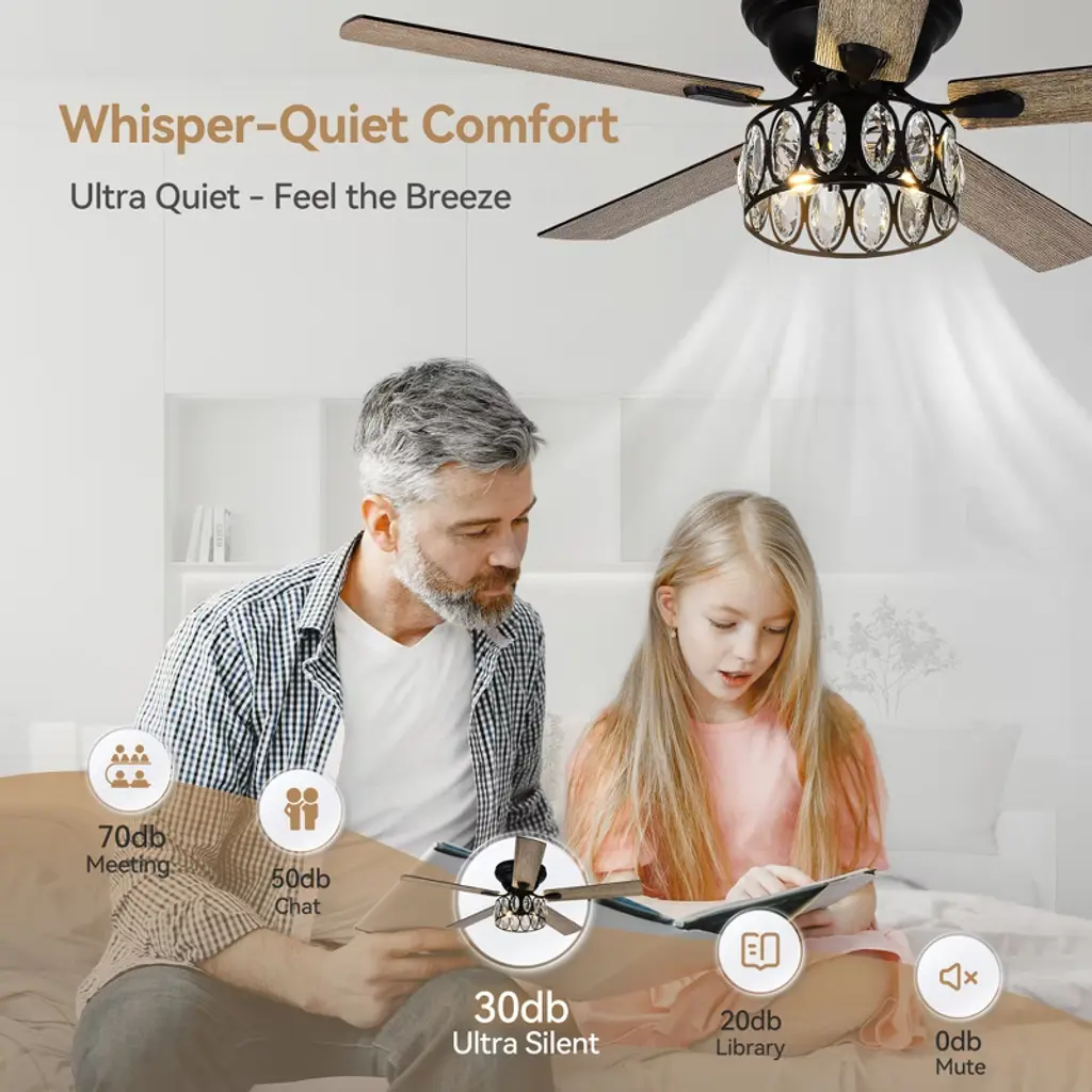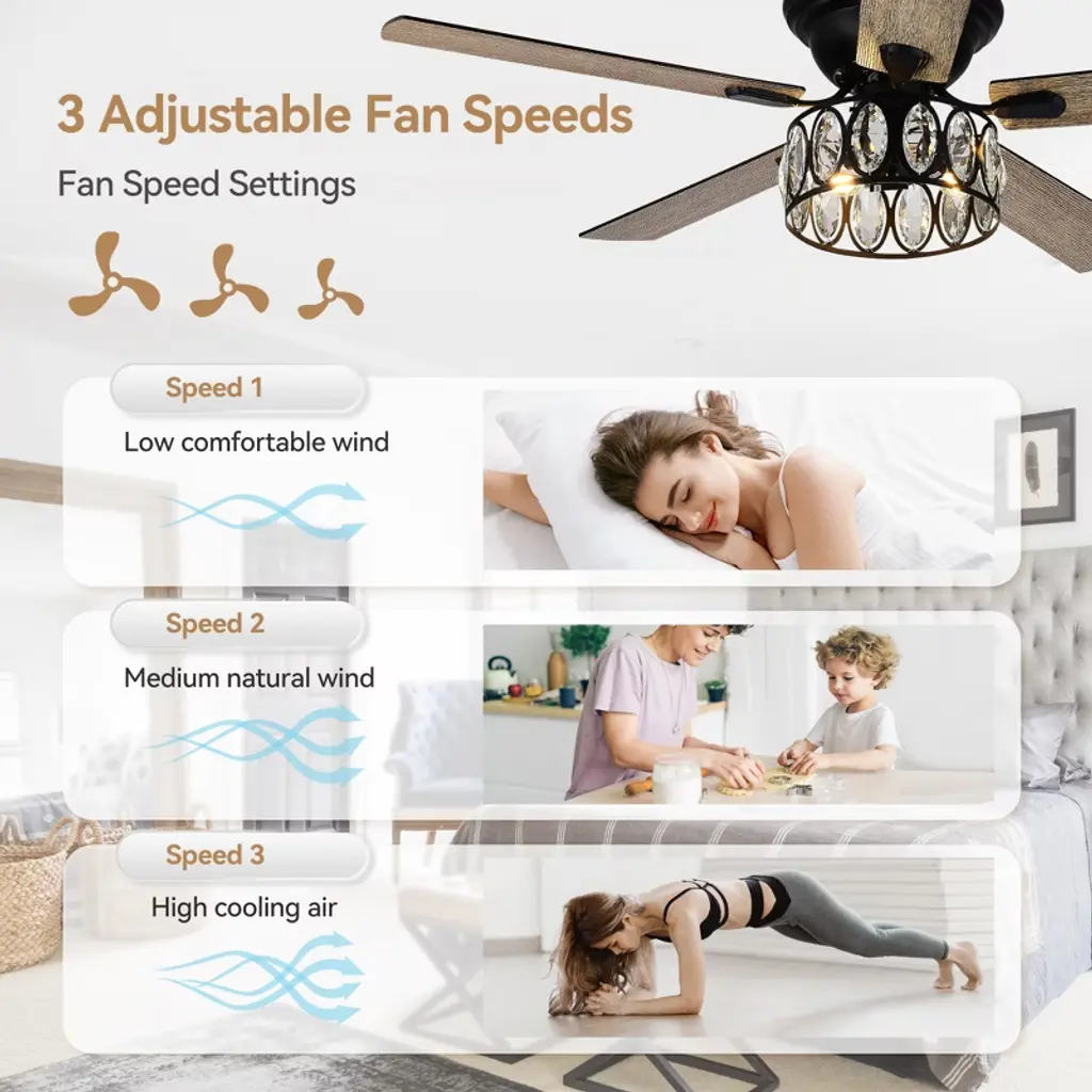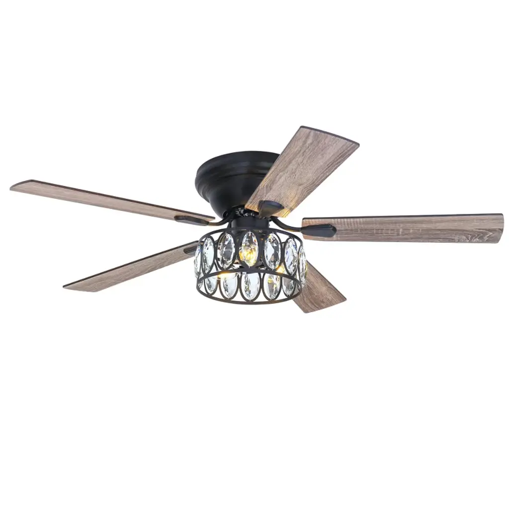 This stunning crystal ceiling fan features five wood-grain blades, a sleek motor housing, and three E12 bulbs, offering a beautiful industrial design. Its flush-mount installation makes it perfect for rooms with low ceilings. Equipped with a quiet, reversible motor, it helps reduce energy costs while providing year-round comfort. The crystal shade, elegant finish, and 52-inch blade span create a striking look. Plus, a convenient remote control (battery not included) is included for easy operation.
