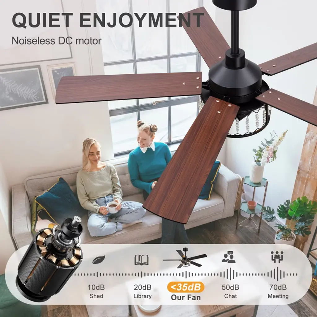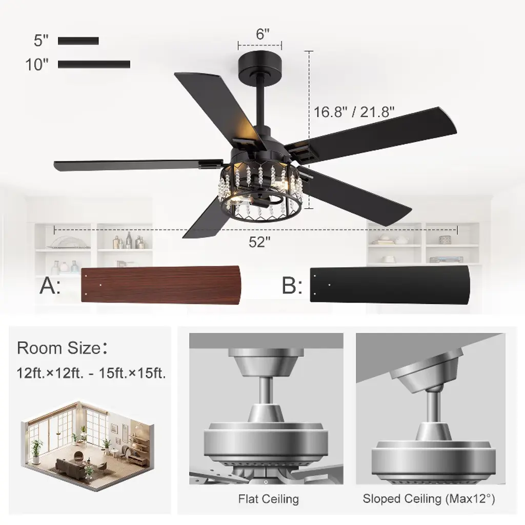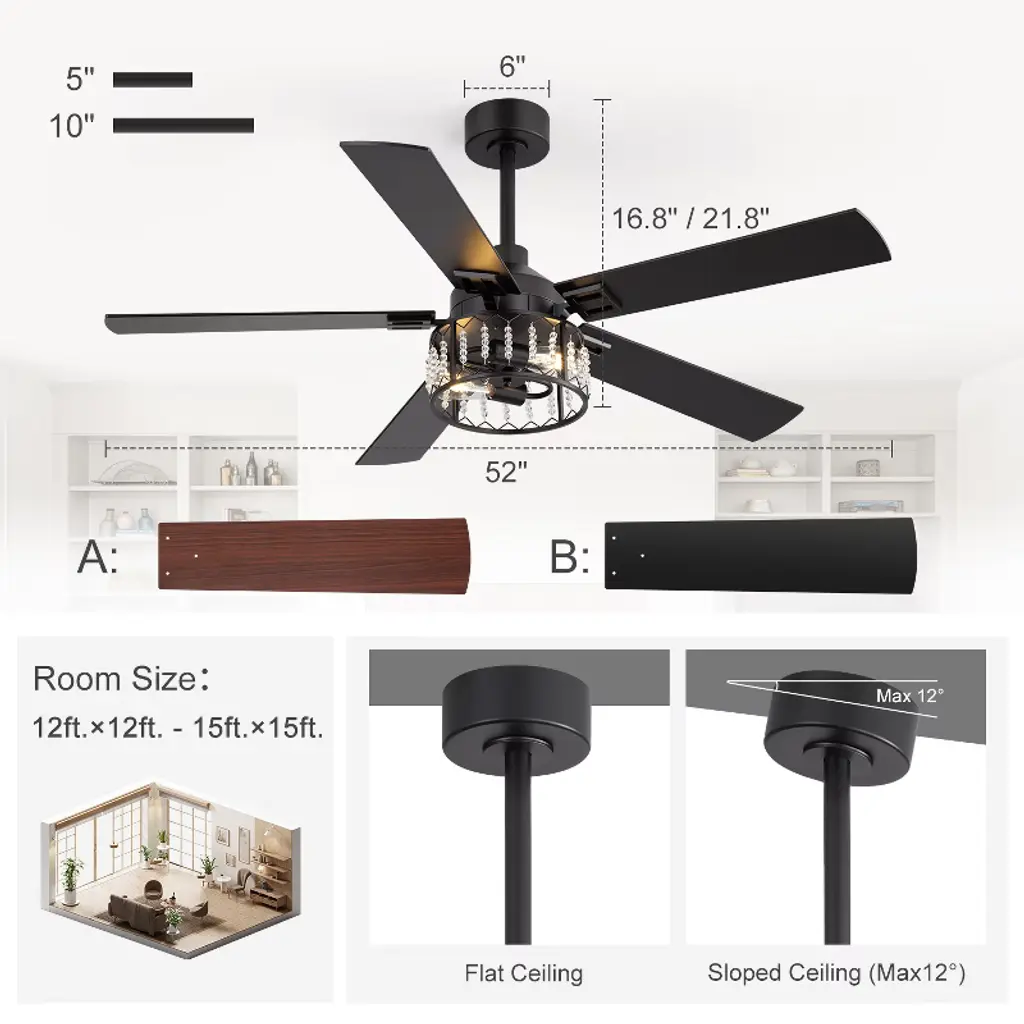This ceiling fan is a great blend of style and function.The fan's Matte Black body is sleek and can match various home decors.Its 5 plywood blades in black with wood-grain look warm and natural.It has 2 E26 bulb sockets(bulbs not included).The memory function keeps the previous settings after a 15-second power cut.The DC motor has strong wind power and good wind output.The remote control provides 6 wind speed settings to ensure comfort during use.This ceiling fan is equipped with 2 Downrods(5inch,10inch).it offers high value, making your home more comfortable and stylish.