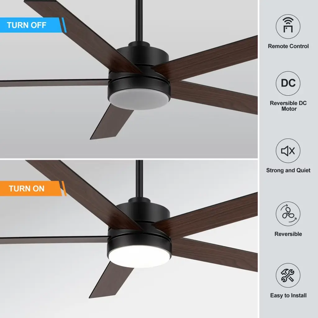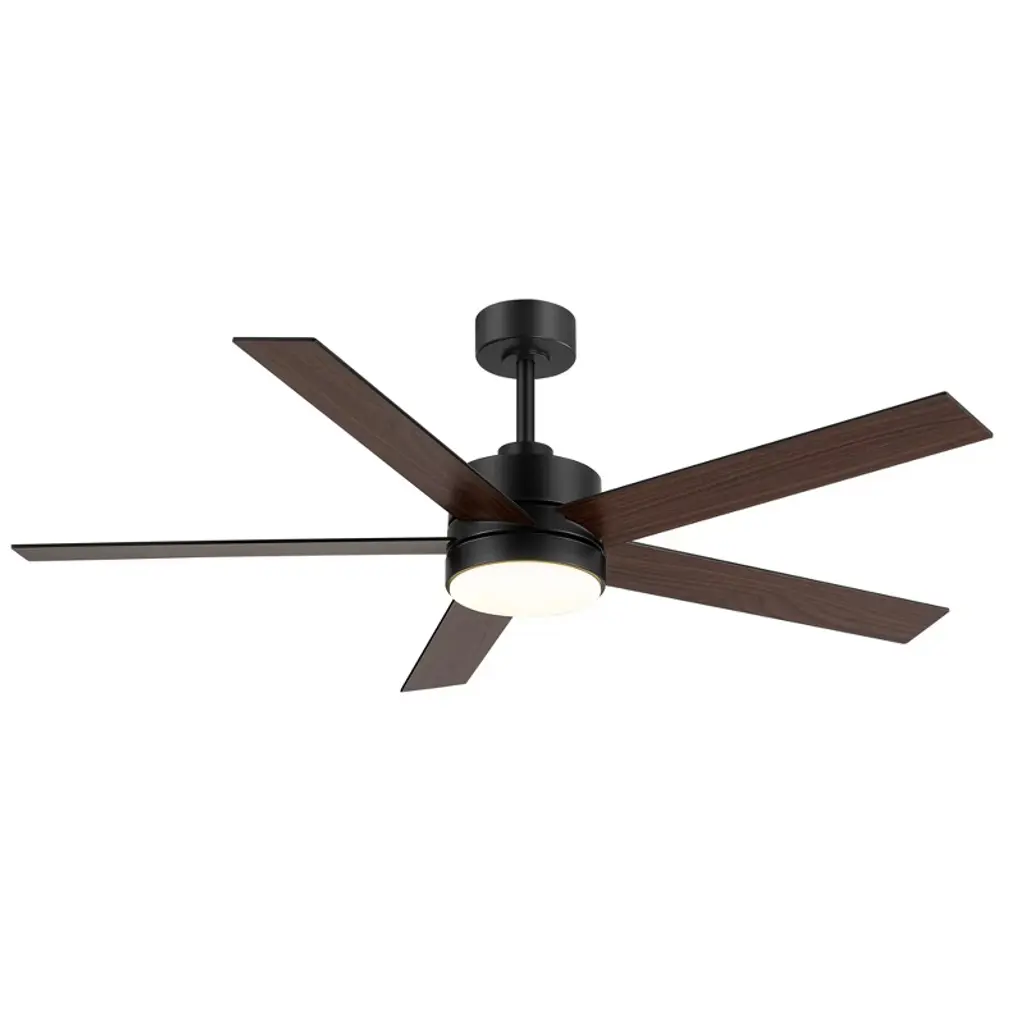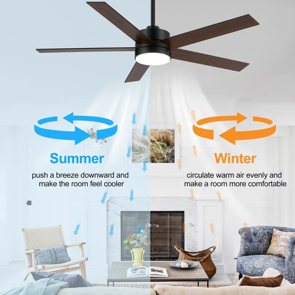 Experience the perfect fusion of functionality and style with this 56" LED Ceiling Fan. The fan features a powerful 6-speed DC motor and an integrated LED light that serves as an ambient downlight. The LED fan comes with a handy remote control that includes a reverse switch, allowing you to easily change the fan's direction for optimal air circulation all year round. It has a unique design that complements various styles of decor.
