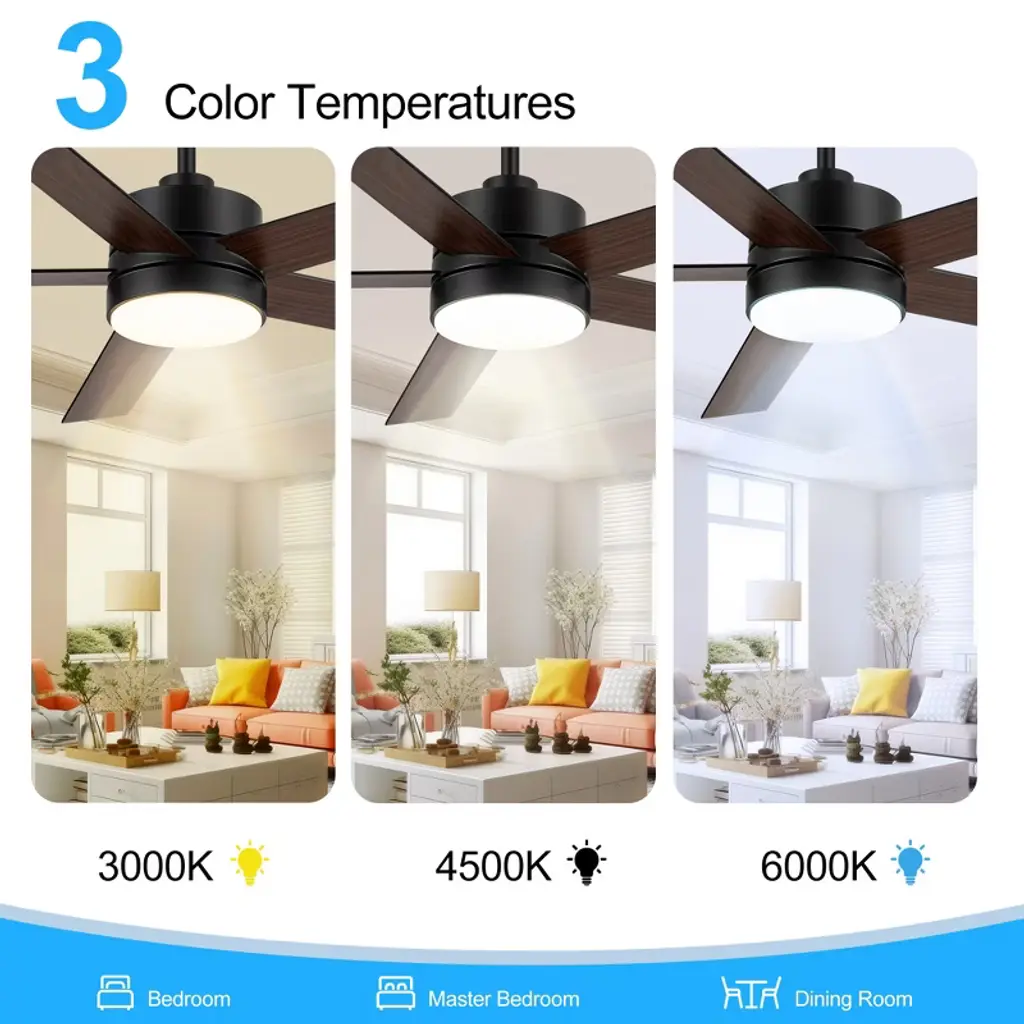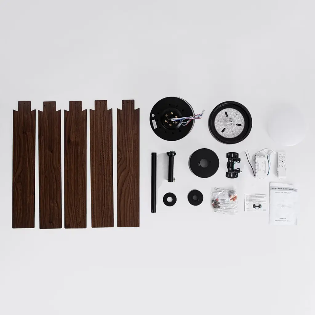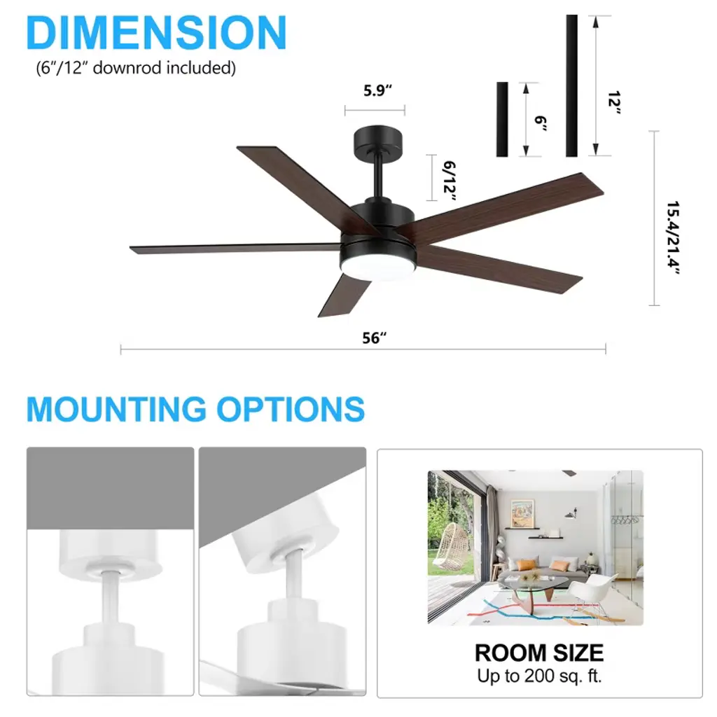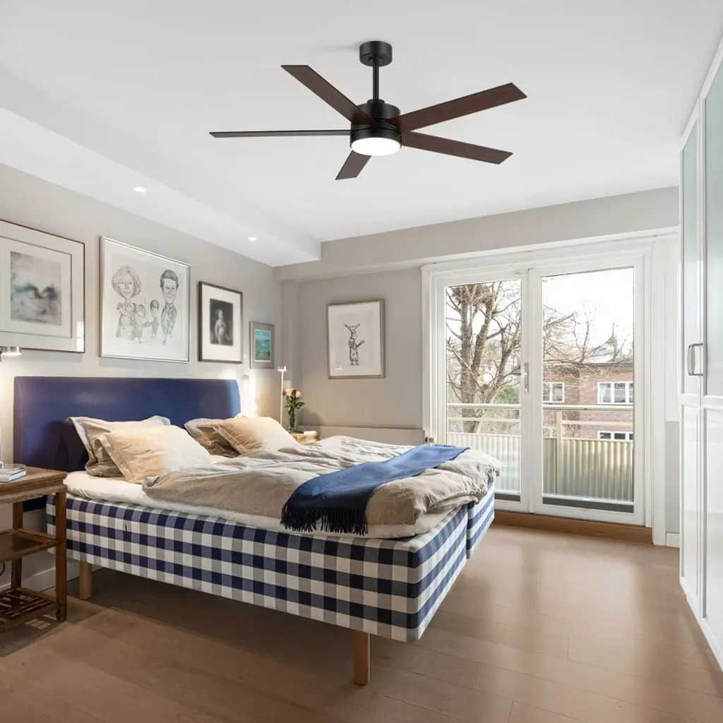 Experience the perfect fusion of functionality and style with this 56" LED Ceiling Fan. The fan features a powerful 6-speed DC motor and an integrated LED light that serves as an ambient downlight. The LED fan comes with a handy remote control that includes a reverse switch, allowing you to easily change the fan's direction for optimal air circulation all year round. It has a unique design that complements various styles of decor.