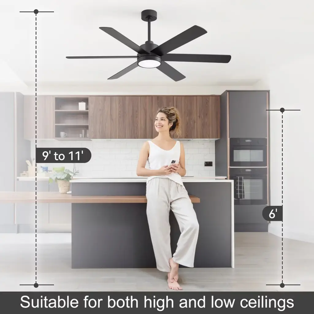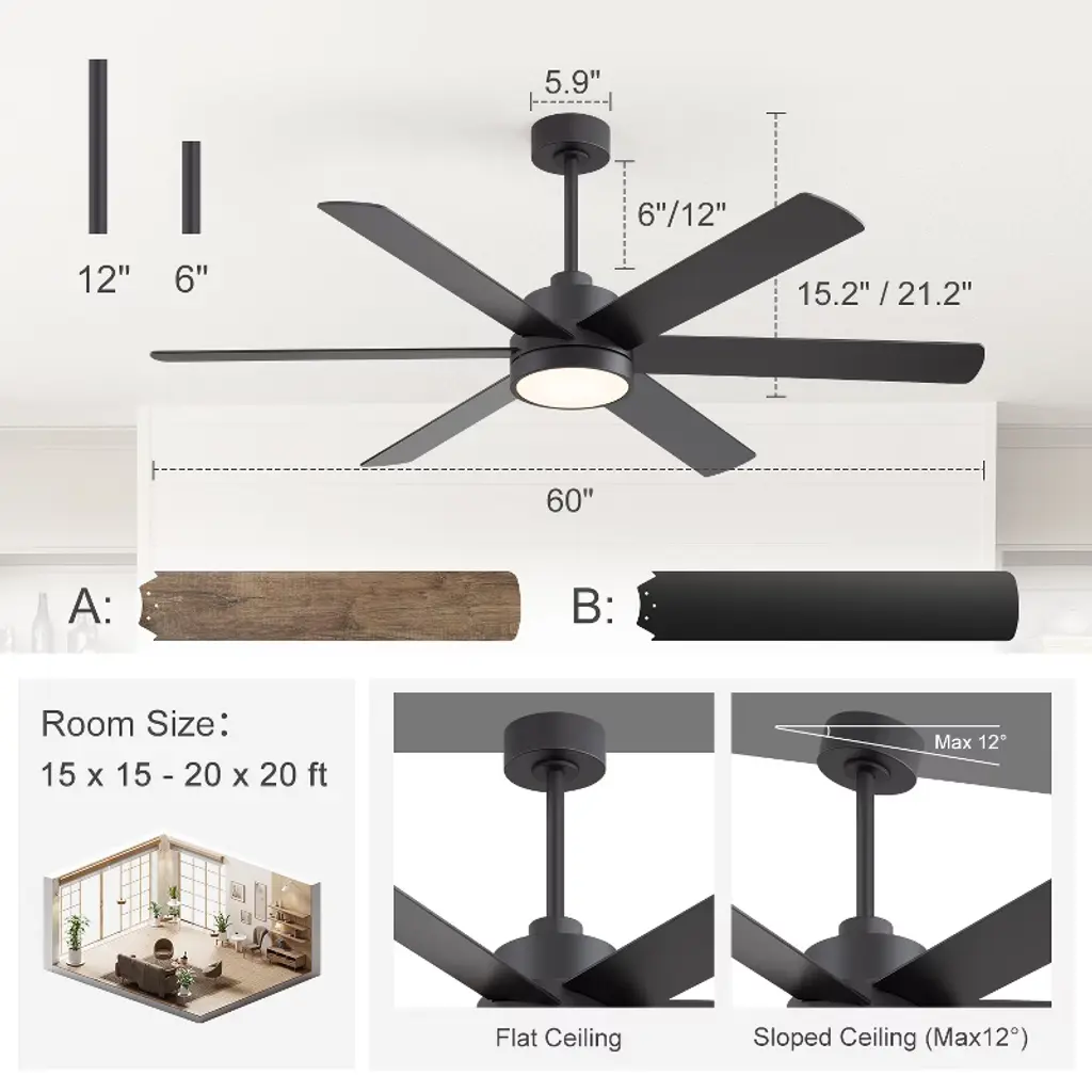 Airsurfer 60" Matte Black Led Ceiling Fan With Remote, 6-speed Reversible Motor, 3-color Light,6"and12"downrod