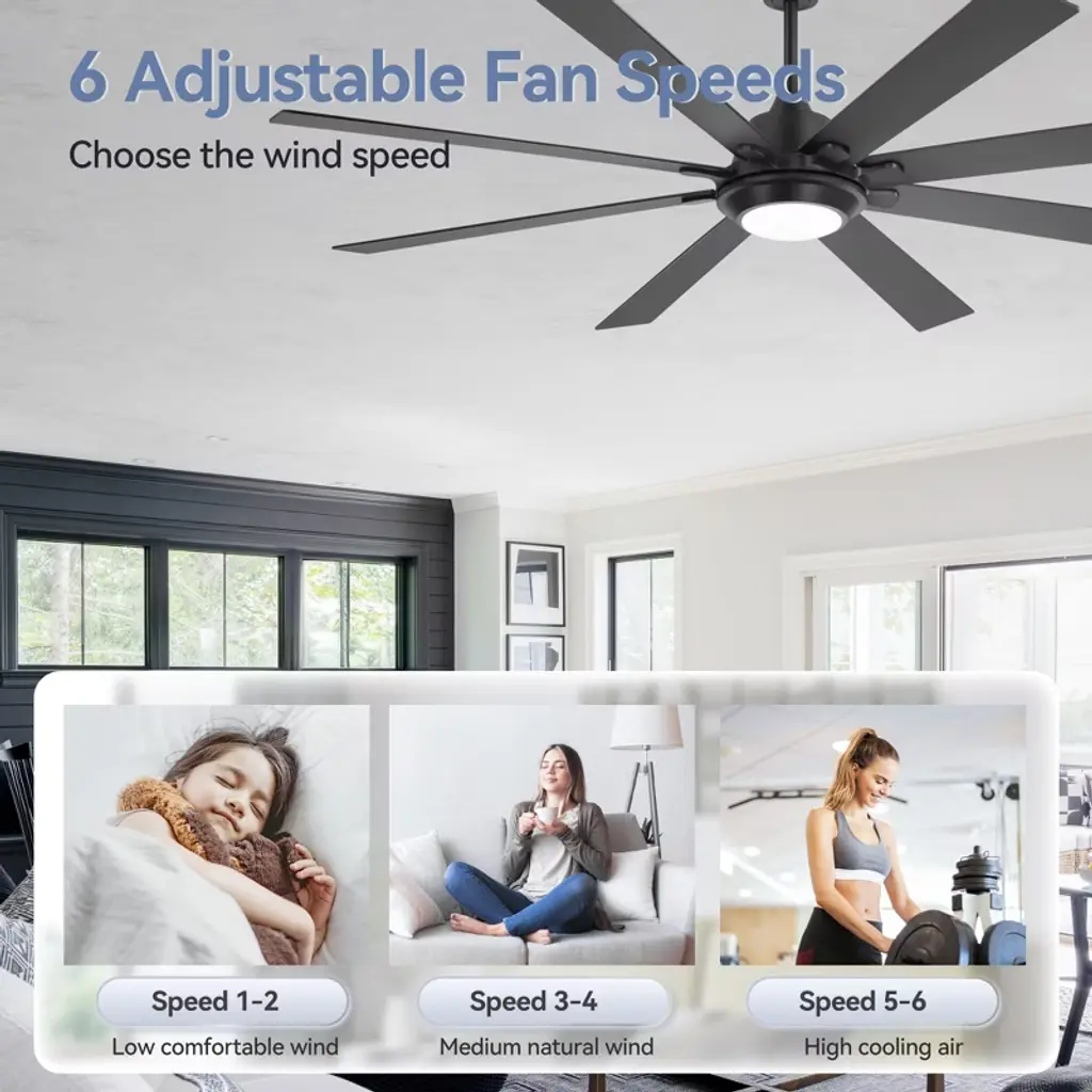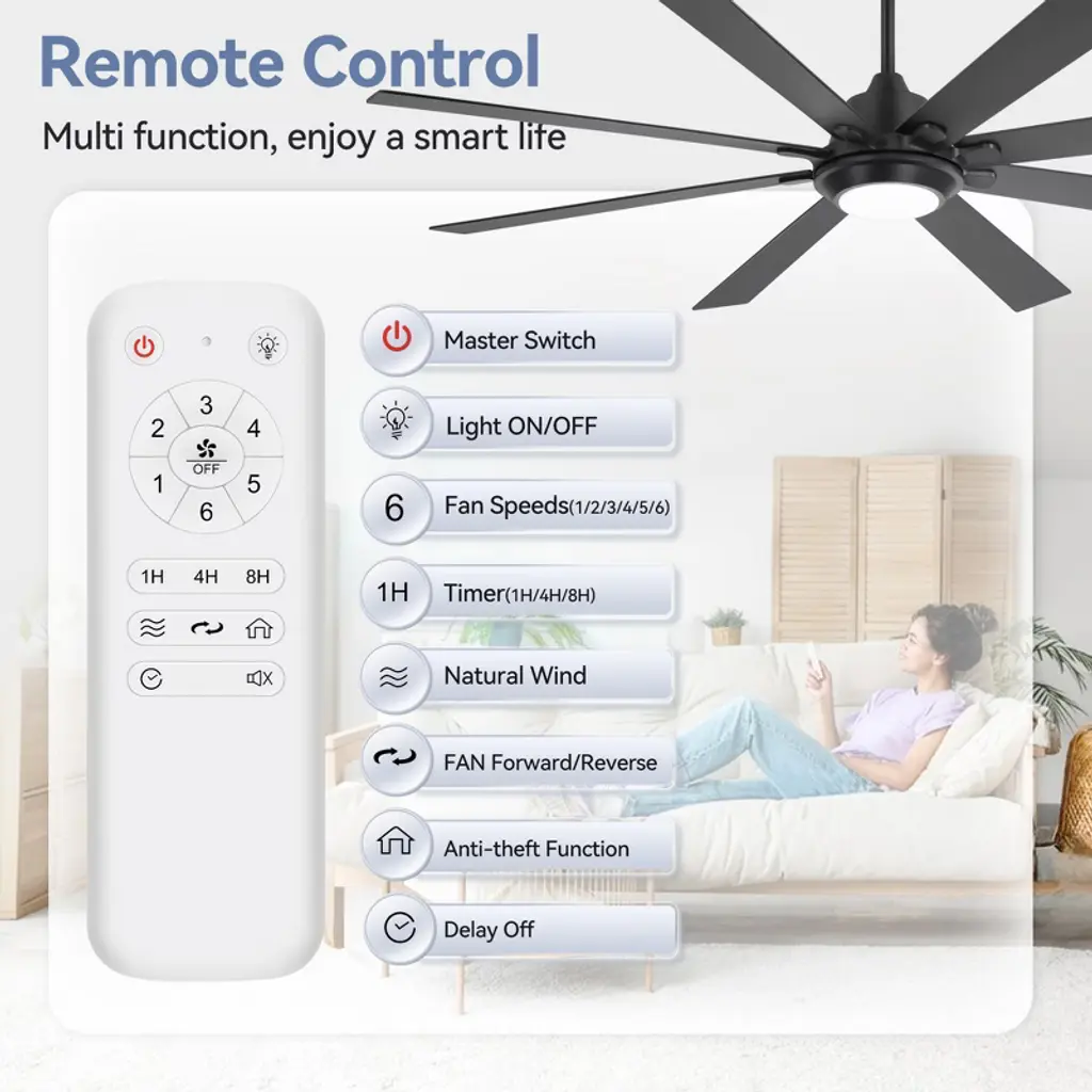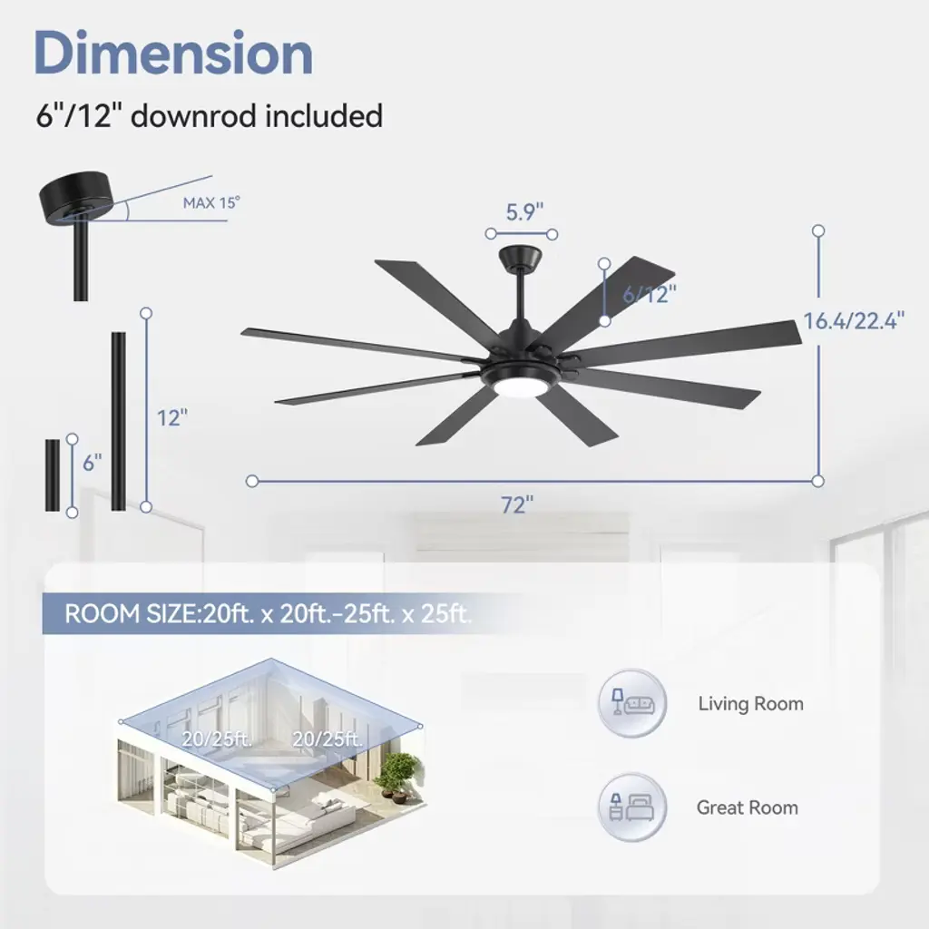 Upgrade your large living spaces with this 72-inch ceiling fan in a matte black finish. Designed for performance and comfort, it features 8 reversible plywood blades in black and walnut tones, a high-efficiency DC motor, and tri-color LED lighting. The included remote control offers 6 wind speeds, lighting control, reverse airflow, and a 1/4/8 hour timer. With built-in memory function, the fan remembers your last lighting setting even after power loss. Easy to install with two included downrods and a 15¡ã compatible mounting angle. Perfect for living rooms, open-concept spaces, or high-ceiling areas that need reliable airflow and a clean modern look.