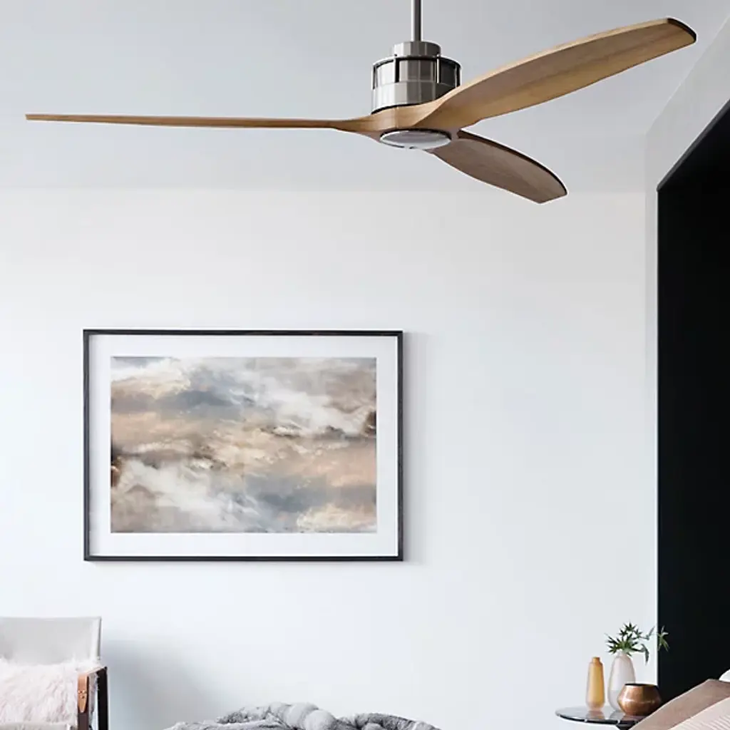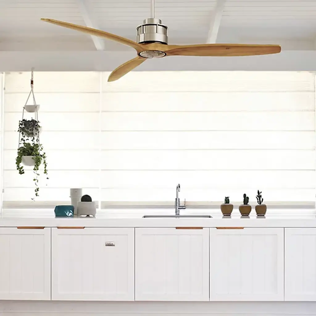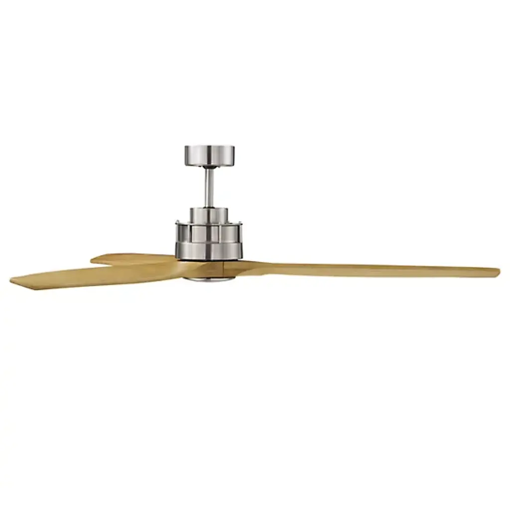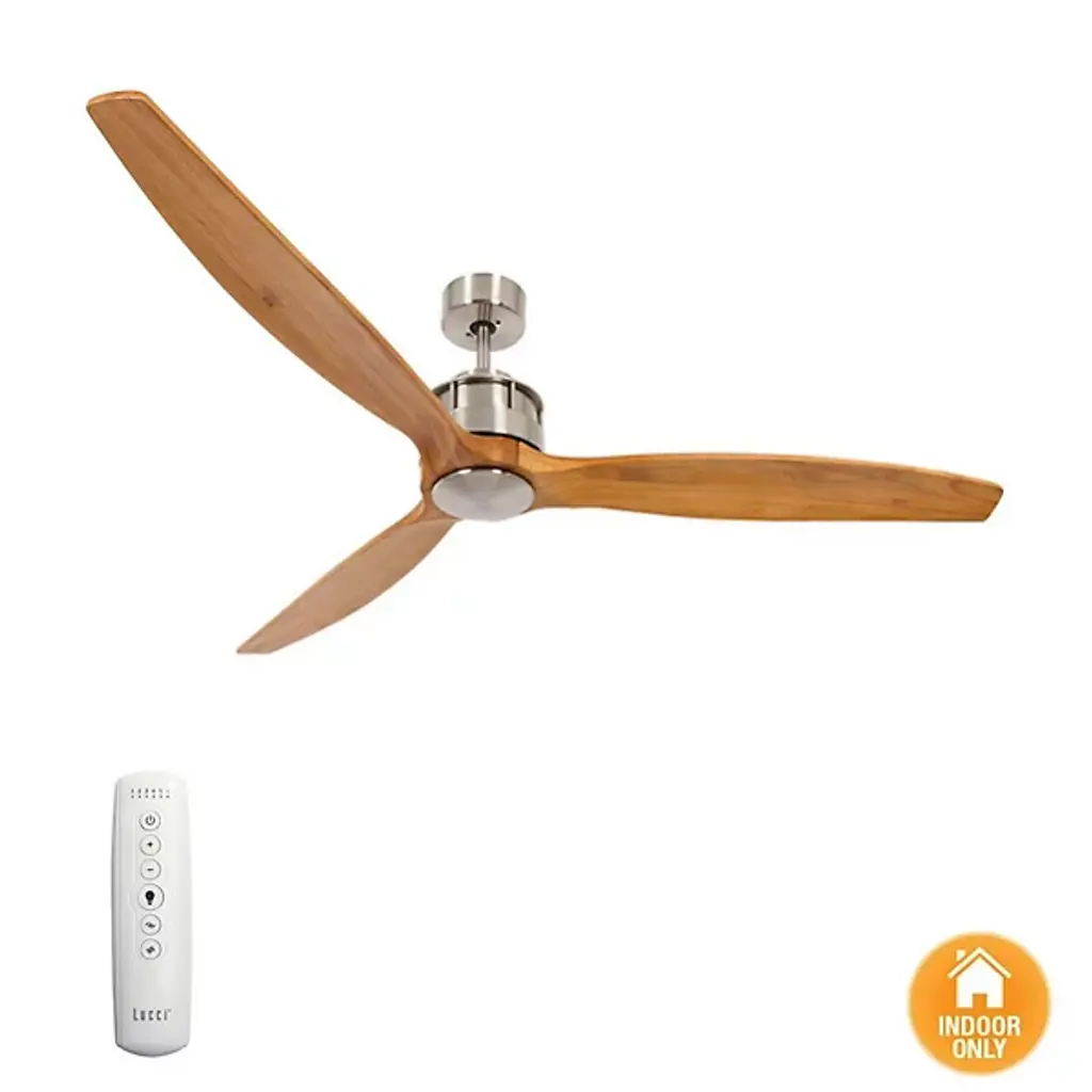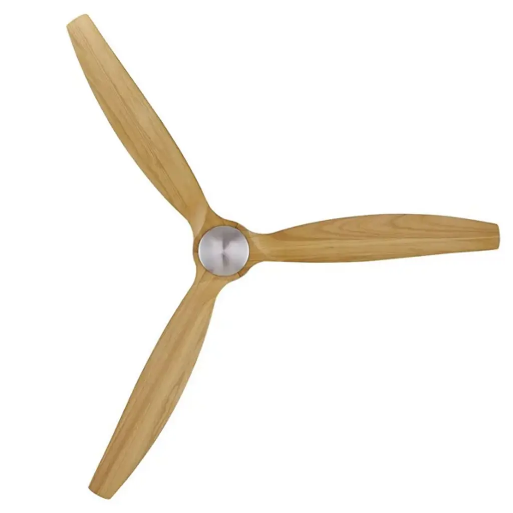 The Akmani Lucci Air Ceiling Fan from Beacon Lighting features a contemporary silhouette that is rich in texture, structural strength, and refined functionality. Designed by Lucci Air, its set of three solid wood blades swirl around a powerful DC motor, with a propeller-style shape that evokes the early days of flight. The steel housing around the motor is contoured, featuring a set of slim, vertical accents that contrast with the wooden blades. A central steel disc anchors the blades, which can shift through six speeds at the command of a handheld remote.