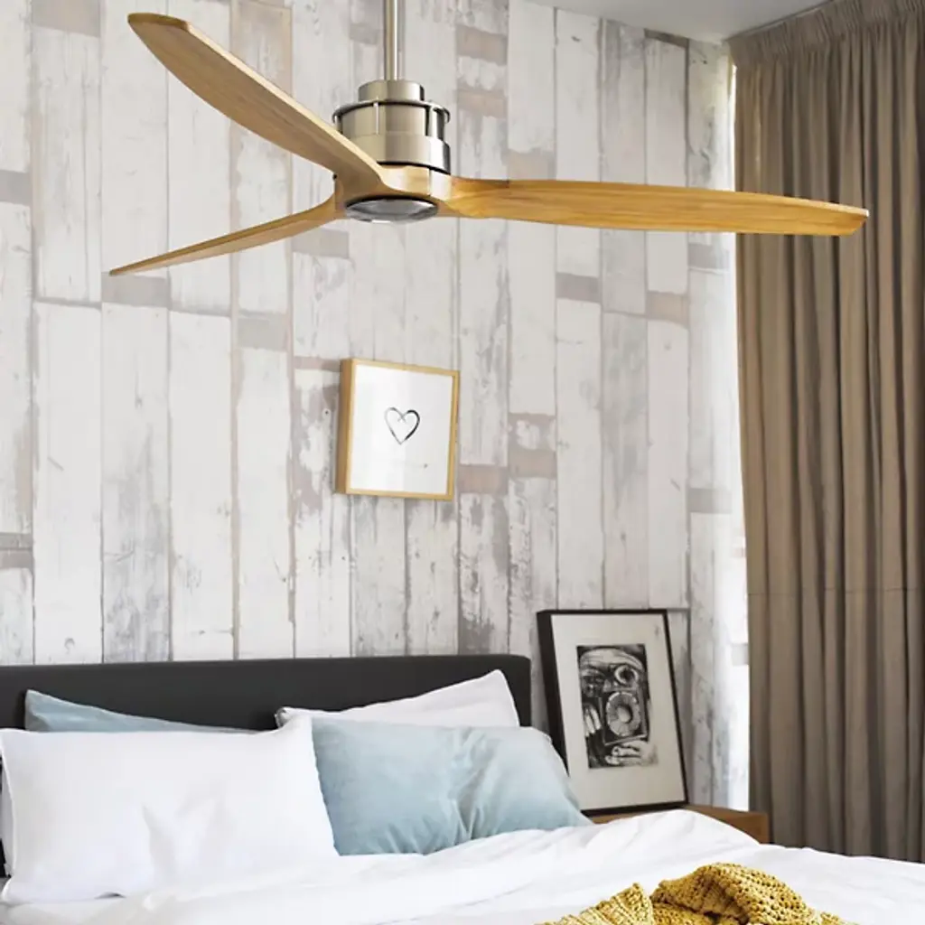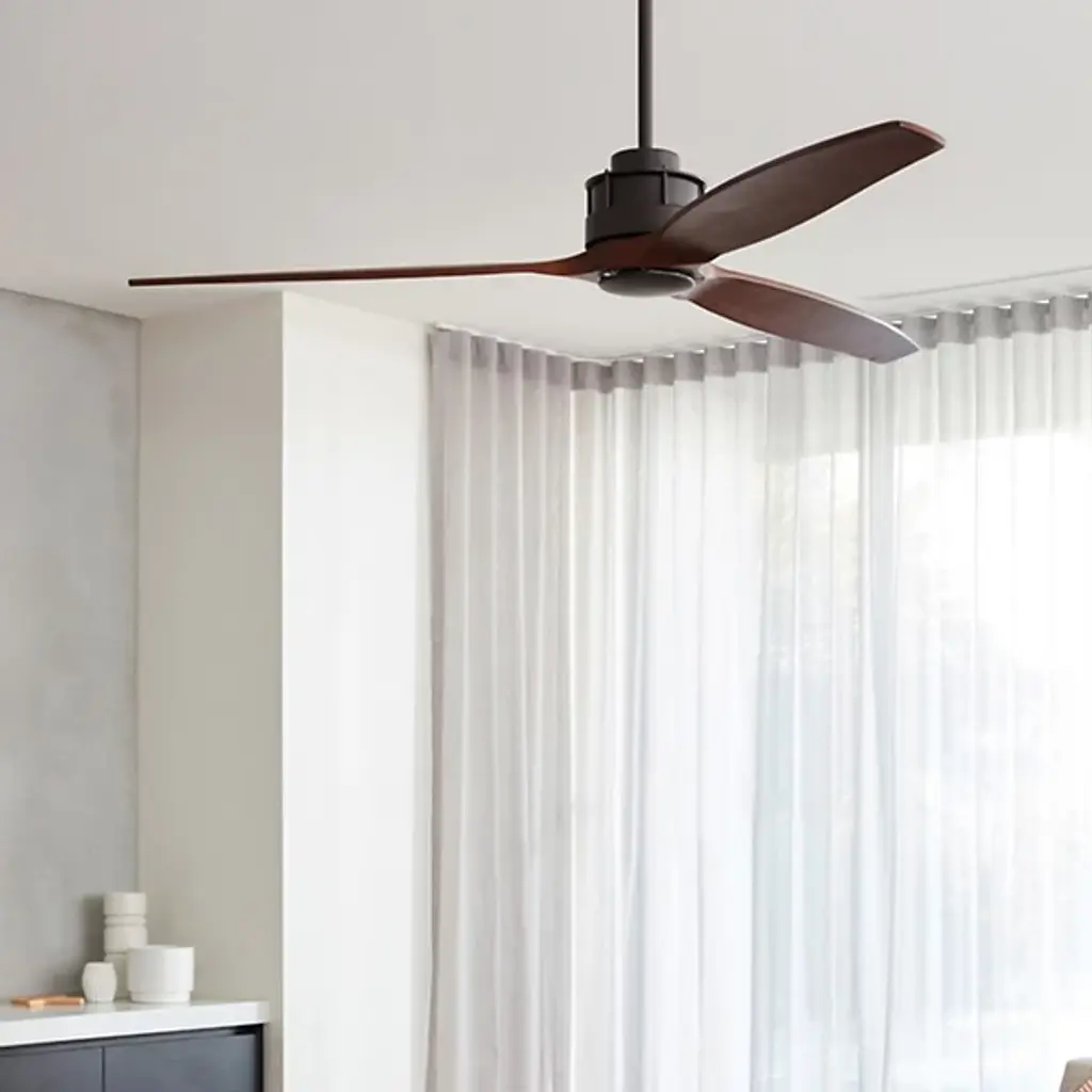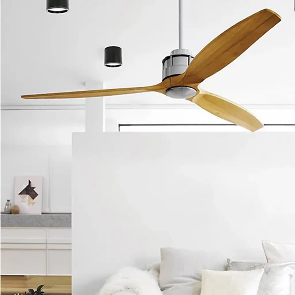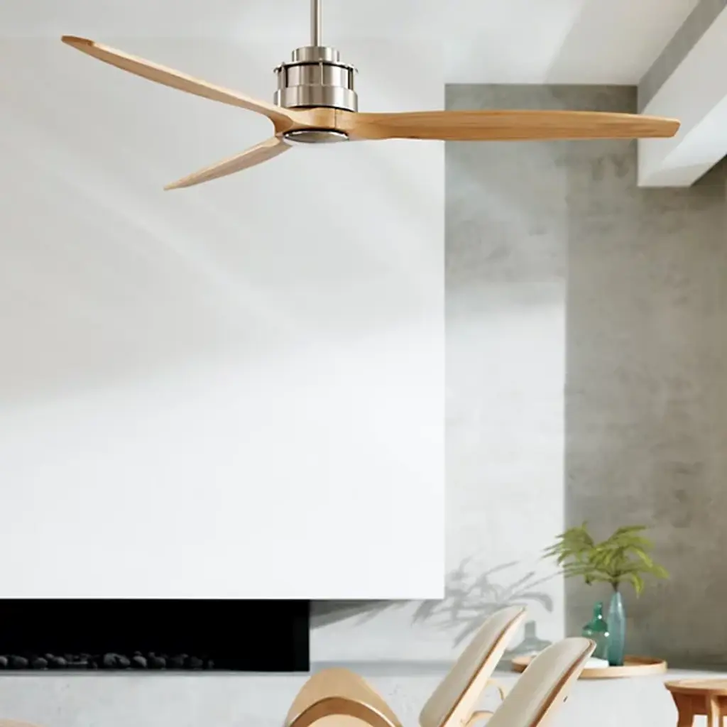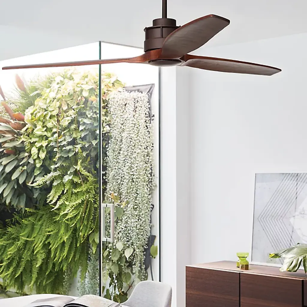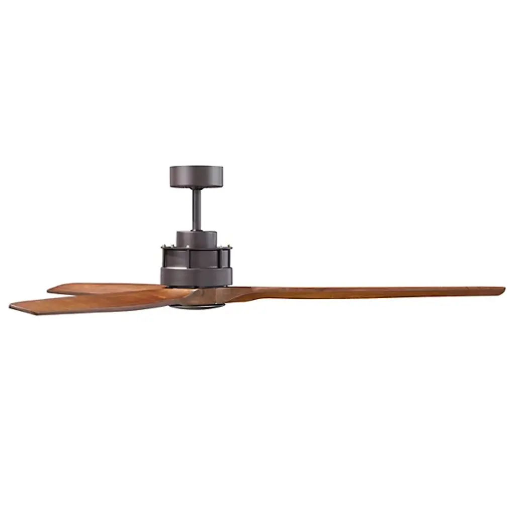 The Akmani Lucci Air Ceiling Fan from Beacon Lighting features a contemporary silhouette that is rich in texture, structural strength, and refined functionality. Designed by Lucci Air, its set of three solid wood blades swirl around a powerful DC motor, with a propeller-style shape that evokes the early days of flight. The steel housing around the motor is contoured, featuring a set of slim, vertical accents that contrast with the wooden blades. A central steel disc anchors the blades, which can shift through six speeds at the command of a handheld remote.