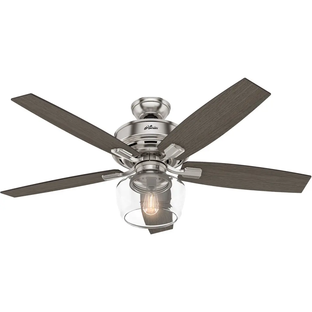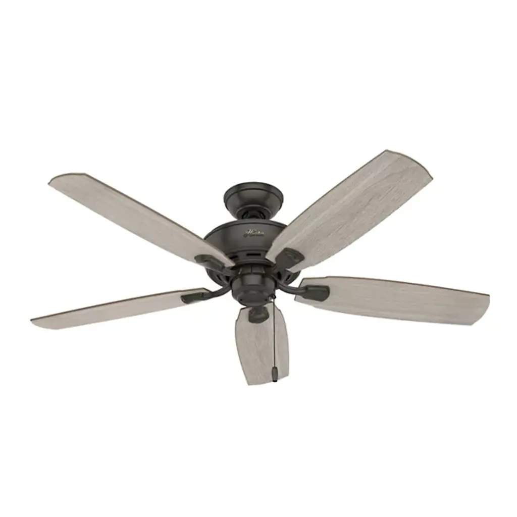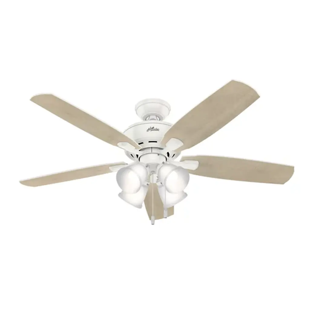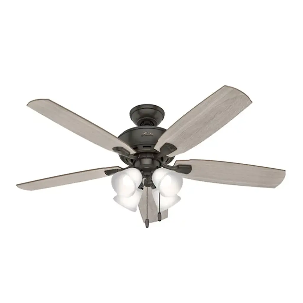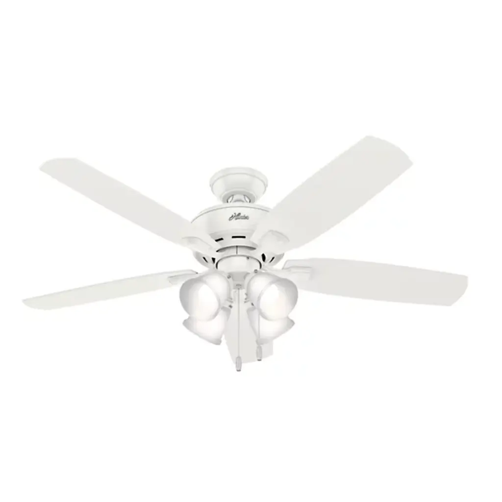 The Amberlin Ceiling Fan by Hunter Fans is a contemporary addition to spaces that helps keep them cool. This five-blade fan operates with a WhisperWind® motor that offers powerful, optimized airflow without any excess noise, keeping your environment comfortable. Cycle through the three speeds and reversible option with a simple pull-chain system, and allow the four energy-efficient lights housed within glass shades to brighten up surroundings.
