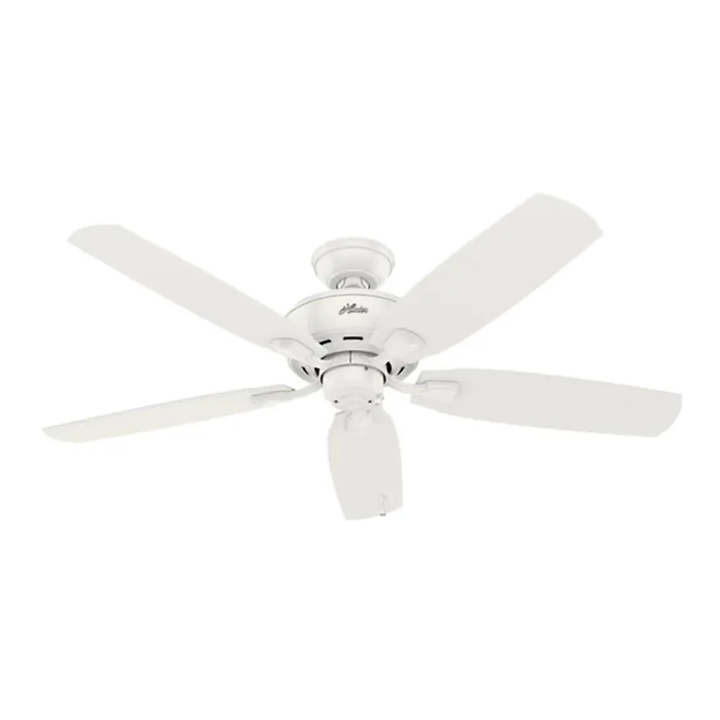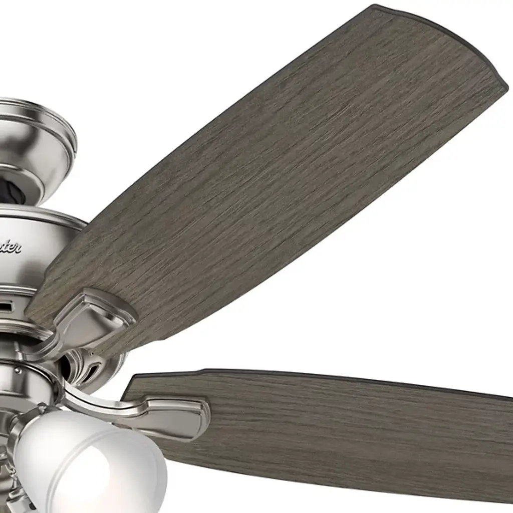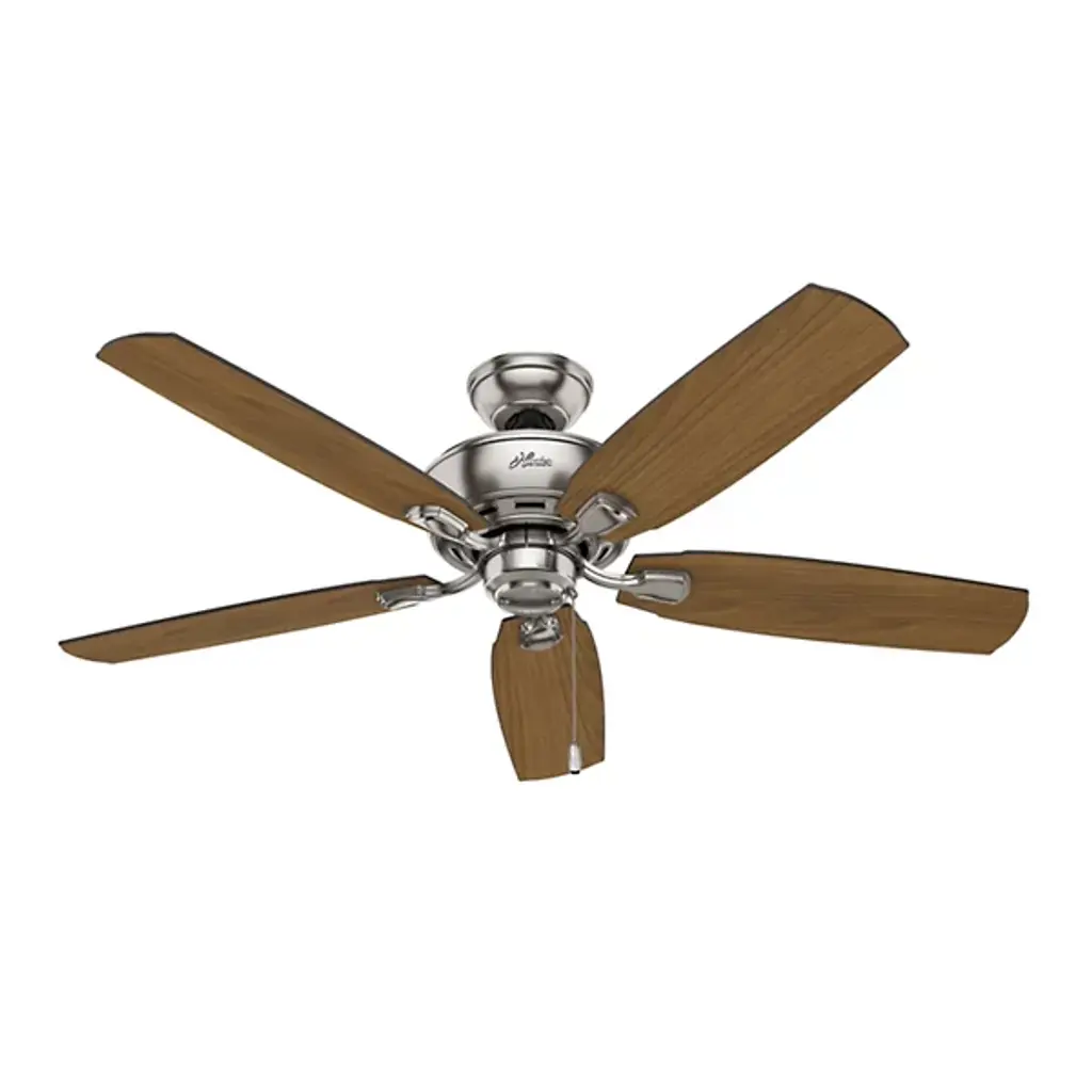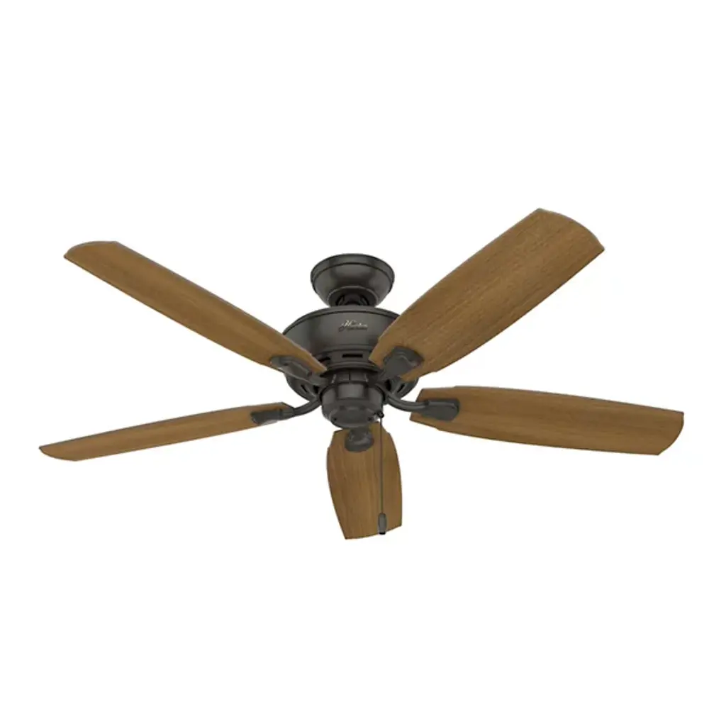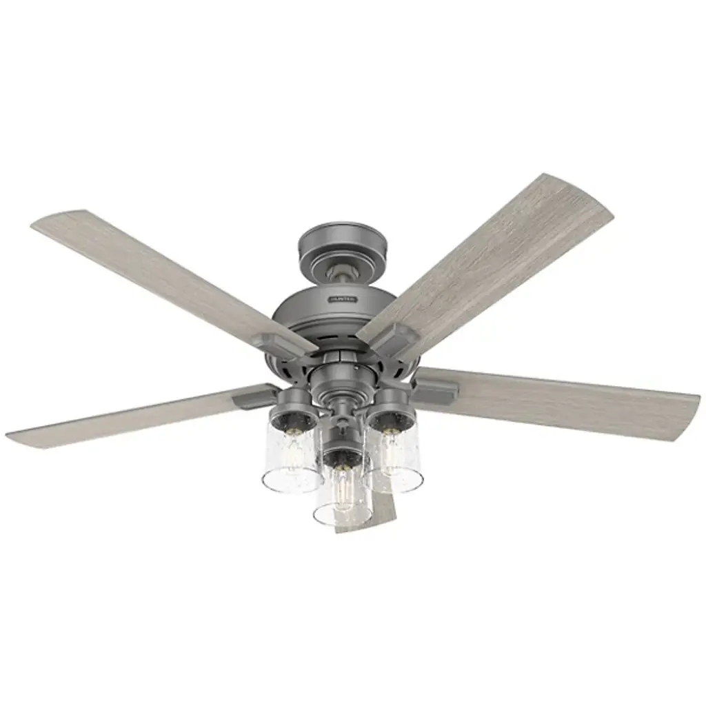 The Amberlin Ceiling Fan by Hunter Fans is a contemporary addition to spaces that helps keep them cool. This five-blade fan operates with a WhisperWind® motor that offers powerful, optimized airflow without any excess noise, keeping your environment comfortable. Cycle through the three speeds and reversible option with a simple pull-chain system, and allow the four energy-efficient lights housed within glass shades to brighten up surroundings.