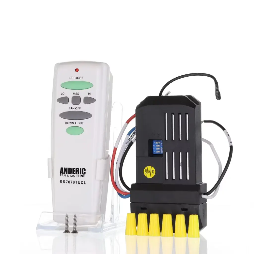 The Anderic RR7078TUDLKIT Replacement 3-Speed Ceiling Fan Remote Control Kit with Up/Down Light Controls is a complete solution for upgrading your ceiling fan to wireless remote functionality. Designed for ceiling fans equipped with both up and down lights, this kit installs easily at the base of the ceiling where house wiring connects to the fan. Once installed, it provides reliable control of fan speeds (OFF, LOW, MED, HIGH) as well as independent ON/OFF operation for both the up light and down light. With dimming support built in, this kit delivers flexible performance and convenience for a wide range of fan setups. Each kit includes the UC7067GMRX receiver (FAN28R equivalent), the RR7078TUDL remote transmitter, a remote wall mount for storage, wire ties, and a wiring diagram to guide installation. Built to deliver dependable operation, the RR7078TUDLKIT transforms your ceiling fan into a versatile fixture that’s easier to control from anywhere in the room. Please note: this product does not come with technical support, and for installation questions it is recommended to consult a licensed electrician.