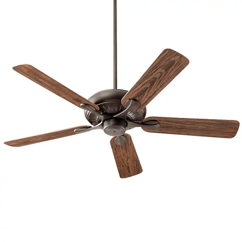 Command your inside spaces with the elegant sweep of the Apex Ceiling Fan from Quorum International. An inspired, sculptural fixture with a retro flair, it descends from above via a slender metal downrod, placing its powerful motor inside a rounded base housing below. The five curved-edge fan blades themselves are surfaced in dark wood tones that contrast with the metal support structure that retains them, operating at the command of a pull chain with a manual reverse, which offers a straightforward means of control.