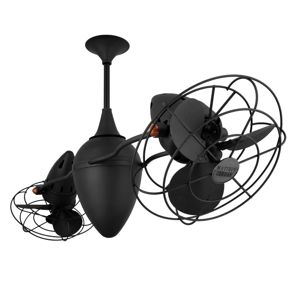 The Ar Ruthiane's unique hourglass support arms grasp bullet-shaped motor housings which rotate about its teardrop center. The fan heads can be infinitely positioned in 180-degree arcs for optimum air movement; the greater the angles of the motors to the horizontal support rods (up or down), the faster the axial rotation. A slow, controlled axial rotation is achieved by both fan head position and fan blade speed. Features