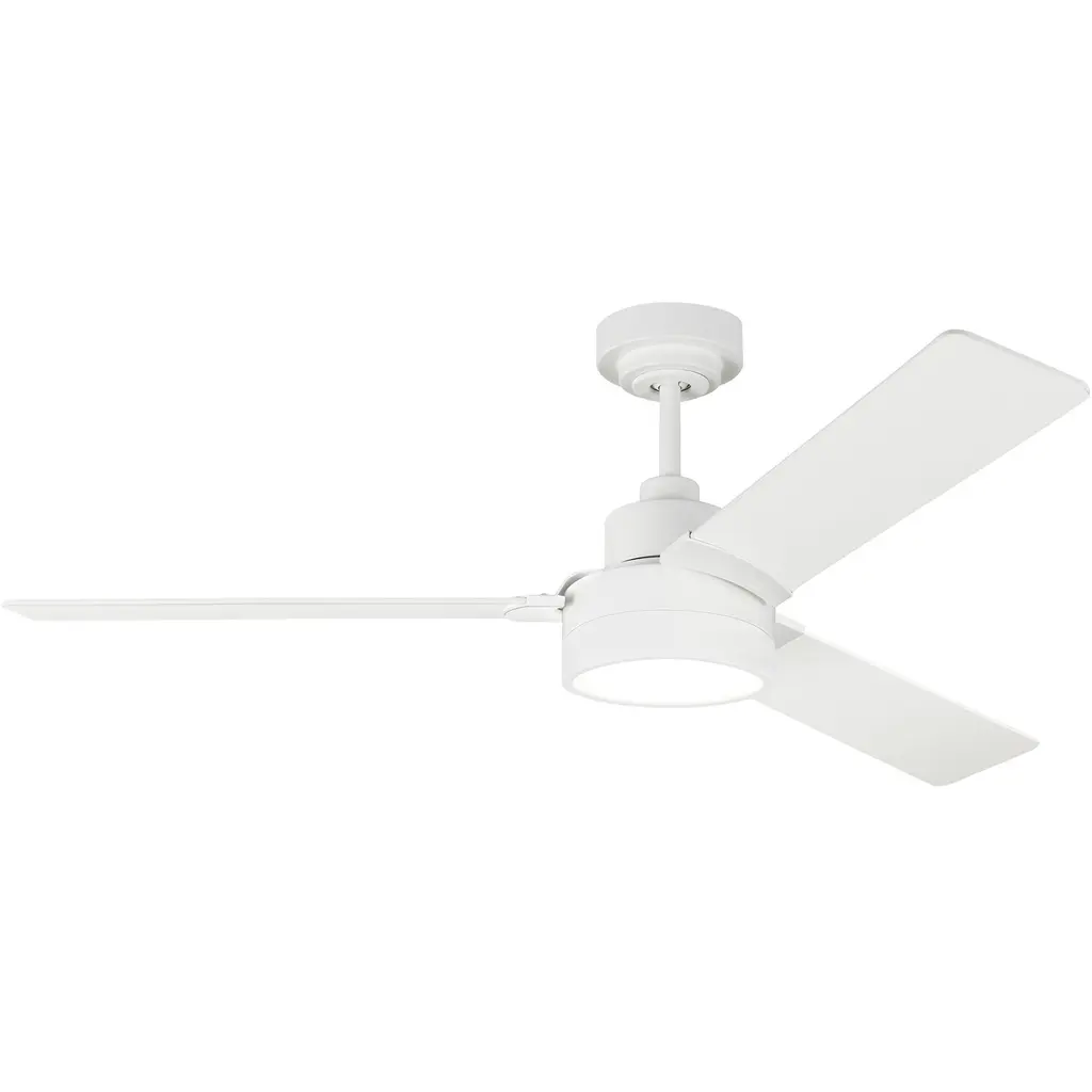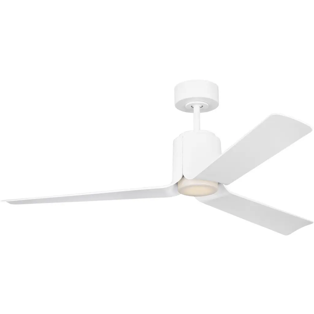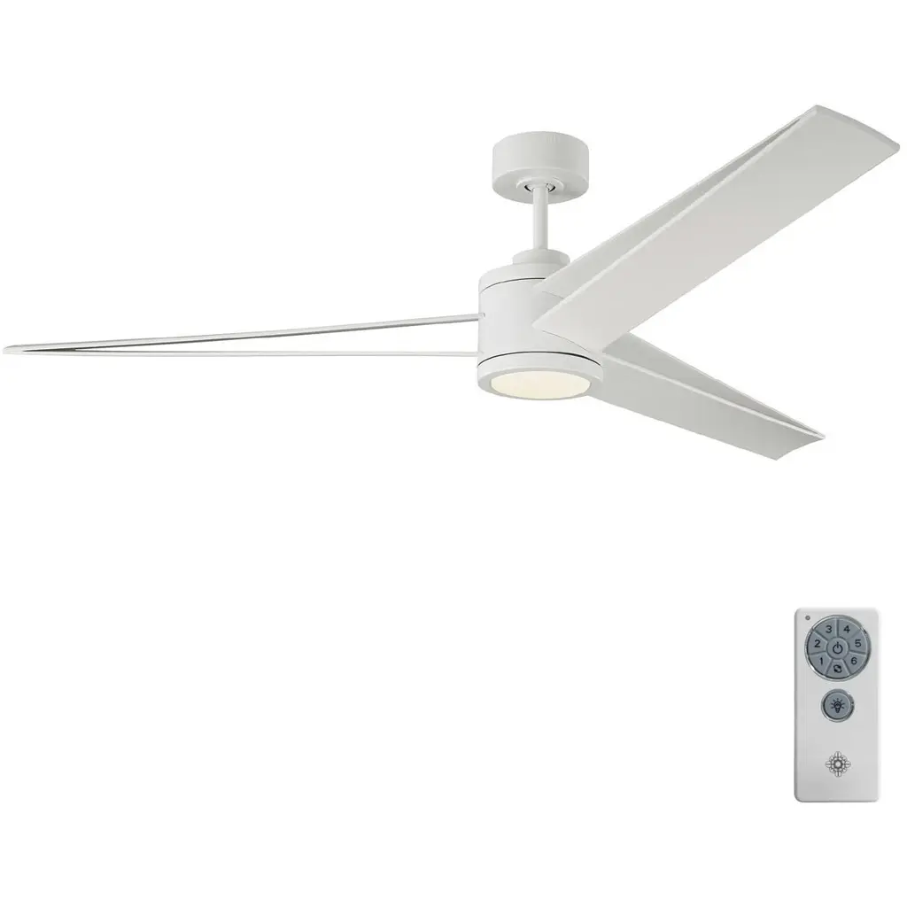 The Armstrong 60 LED in Matte White features a 125.0 X 20.0 6 speed motor with a Sixteen degree blade pitch. The Armstrong ceiling fan's unique design, with 6 blades meeting in three different points, sets this contemporary fan's style apart from its competition. Armstrong is Damp-Rated, has an energy-efficient DC motor and includes a hand-held remote with 6-speed and reverse functionality.