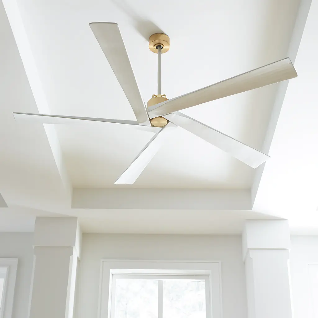 The Aspen Ceiling Fan from Visual Comfort & Co is an exquisite piece of home décor, crafted with five, gently curved wooden blades around a DC motor for a unique pentagonal shape. Enjoy powerful, efficient cooling that will circulate quietly and steadily around the home, thanks to its precisely balanced motor and 56-inch blade span. Damp rated, this ceiling fan is great for bathrooms, hallways, and well-covered patios and porches. Highlights