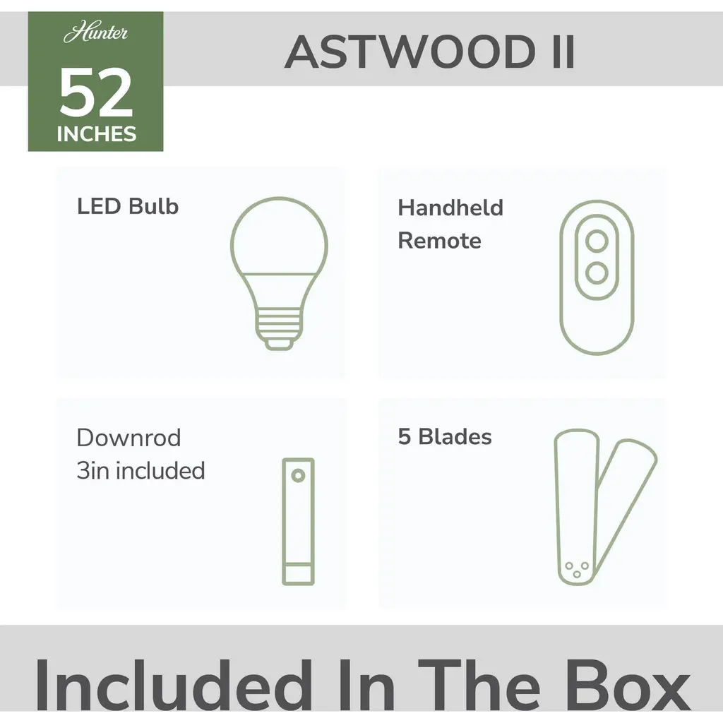 Bring a fresh perspective to your space with the Astwood II 52-inch ceiling fan. Designed for large rooms, this indoor fan blends casual elegance with exceptional functionality. The 4-speed WhisperWind motor ensures whisper-quiet, high-performance airflow for ultimate relaxation. With the exclusive SureSpeed Guarantee, experience optimized, high-velocity cooling when its needed most. Featuring an integrated LED light with TrueLight technology, it ensures a bright balance of clear and welcoming light, any time, in every room. The included handheld remote provides effortless control. Whether updating your living space or creating a cozy retreat, the Astwood II brings purposeful performance and timeless design to your home.