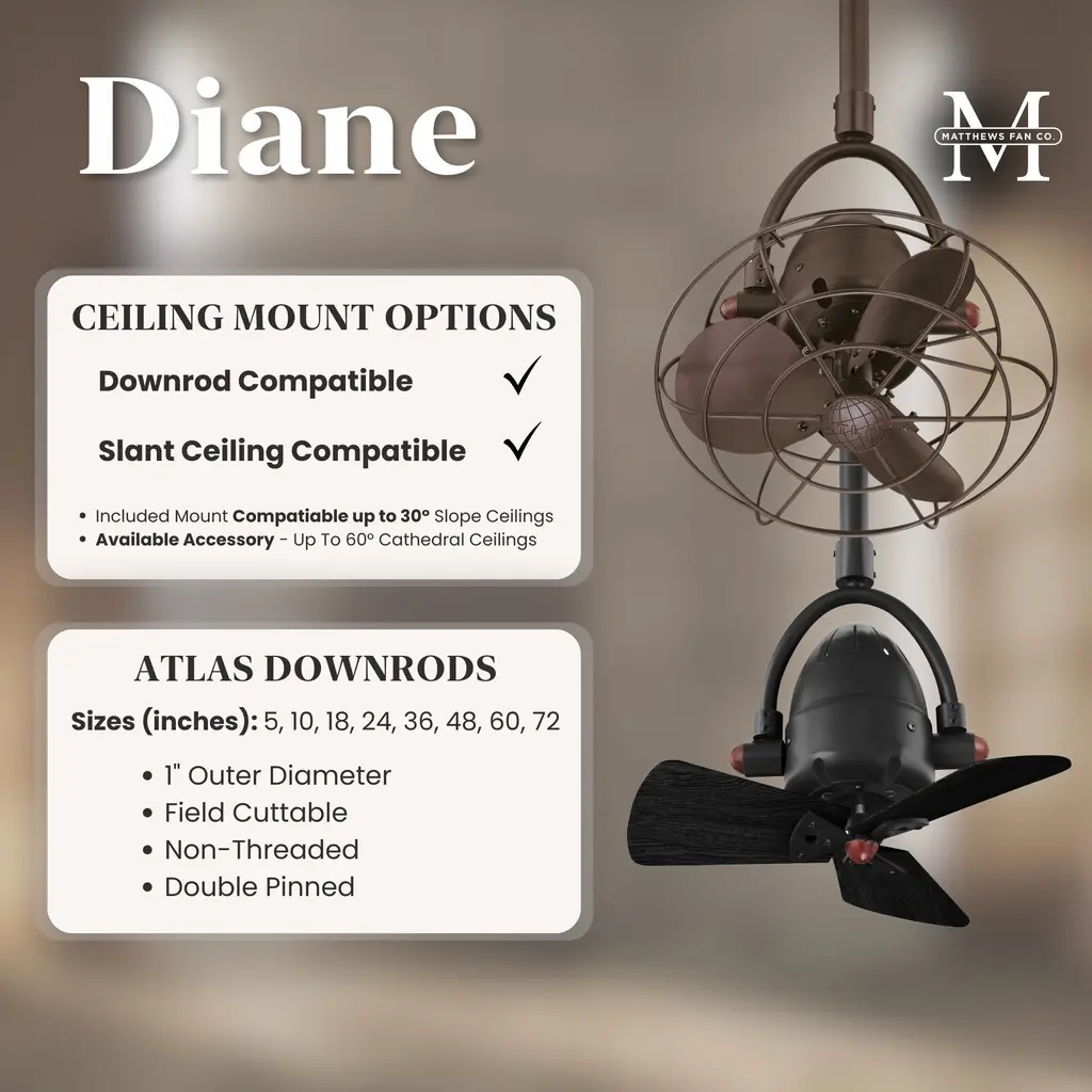 The Diane forward and reverse sweeping oscillating, directional fan head provides maximum, forward and reverse airflow. The Diane can be hung in small, awkward spaces or in front of HVAC ducts to make more efficient the heating, ventilation or air conditioning of any space.