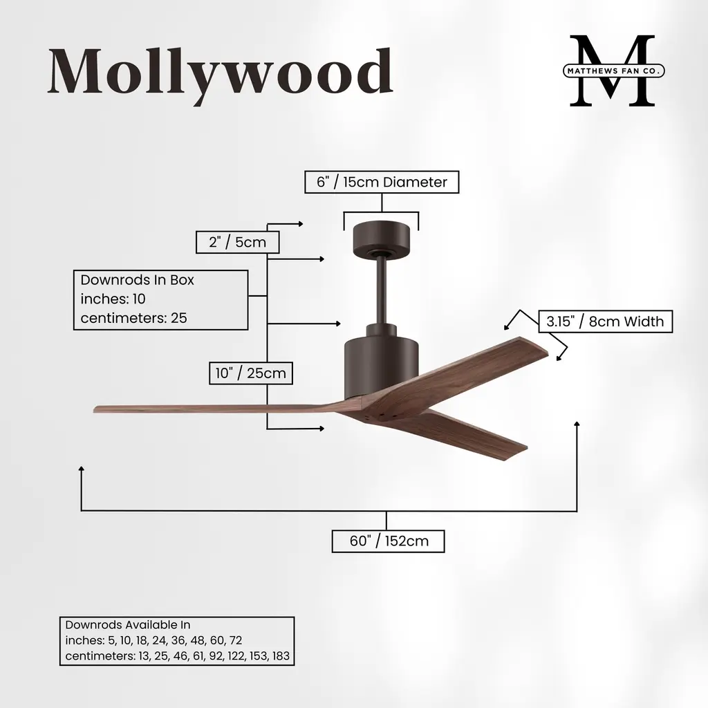 The Mollywood ceiling fan combines modern organic geometry with outstanding performance and function. Lauded by designers for how the solid wooden blades are neatly joined, this indoor ceiling fan makes your space feel cooler and more comfortable. The blades are thick crafted, giving the Mollywood fan a sense of depth and character brought out by natural woodgrain. The result is a clean, natural and contemporary look perfect for any room or décor. The Mollywood fan will compliment a variety of design styles while also providing a fresh and unique modern statement.
