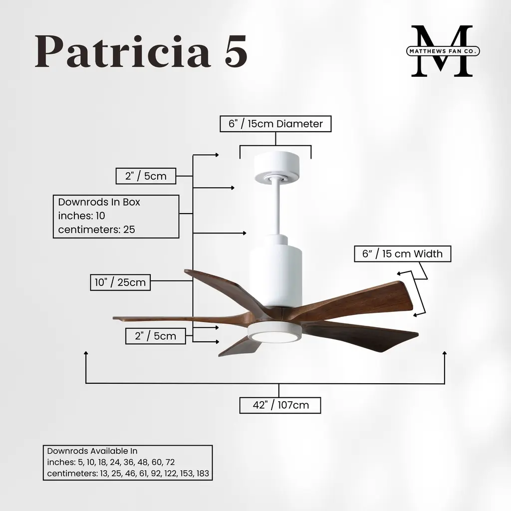 A complement to any commercial or residential space, the Patricia 5 seamlessly combines innovation with simple, refined design. Its elegant aesthetic belies its robust construction. Solid wood blades revolve around a balanced, cylindrical DC motor housing. Air is circulated efficiently with barely more than a whisper. An eco-conscious LED light kit completes the package, making Patricia 5 sophisticated, efficient and green.
