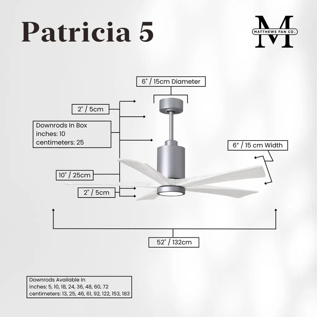 A complement to any commercial or residential space, the Patricia 5 seamlessly combines innovation with simple, refined design. Its elegant aesthetic belies its robust construction. Solid wood blades revolve around a balanced, cylindrical DC motor housing. Air is circulated efficiently with barely more than a whisper. An eco-conscious LED light kit completes the package, making Patricia 5 sophisticated, efficient and green.