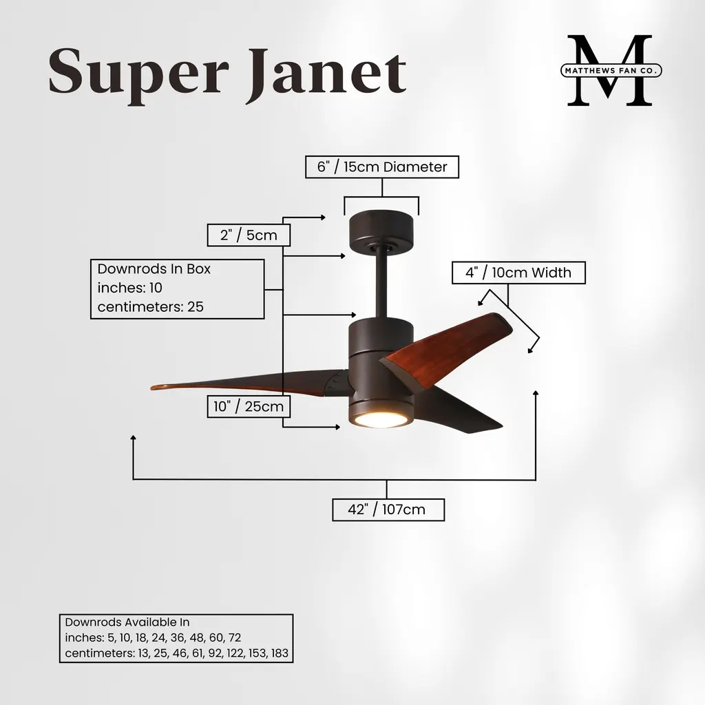 The Super Janets remarkable design and solid construction in cast aluminum and heavy stamped steel make it a staple piece in any commercial or residential space. Unlike a traditional ceiling fan, the Super Janet blades are angled and attached to the fan body, making for an eye-catching look. Moving air with barely a whisper, its efficient DC motor turns solid wood blades in walnut or Barn Wood Tones. An eco-conscious LED light kit with light cover completes the package. Sophisticated, efficient and green, Super Janet carries a limited lifetime warranty.