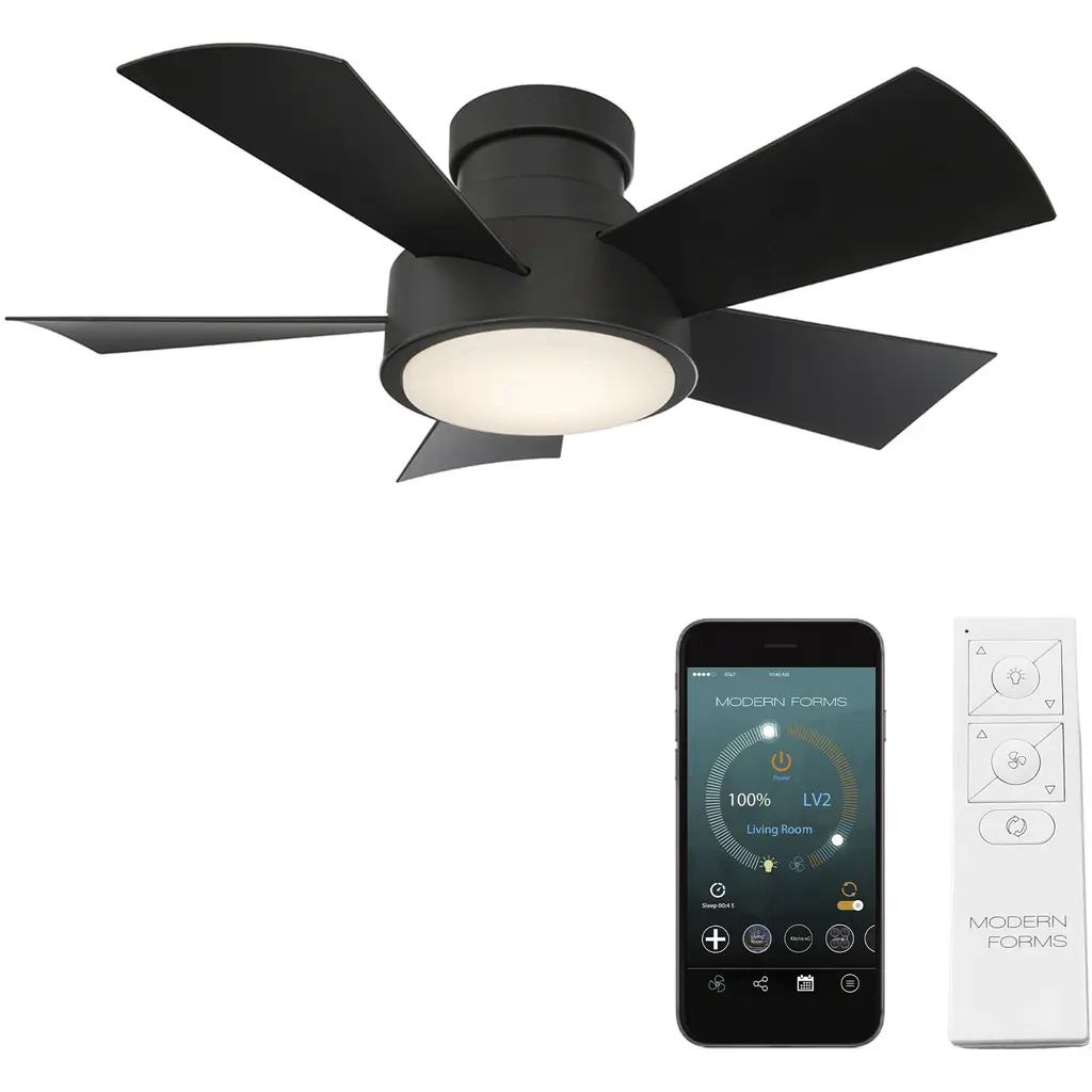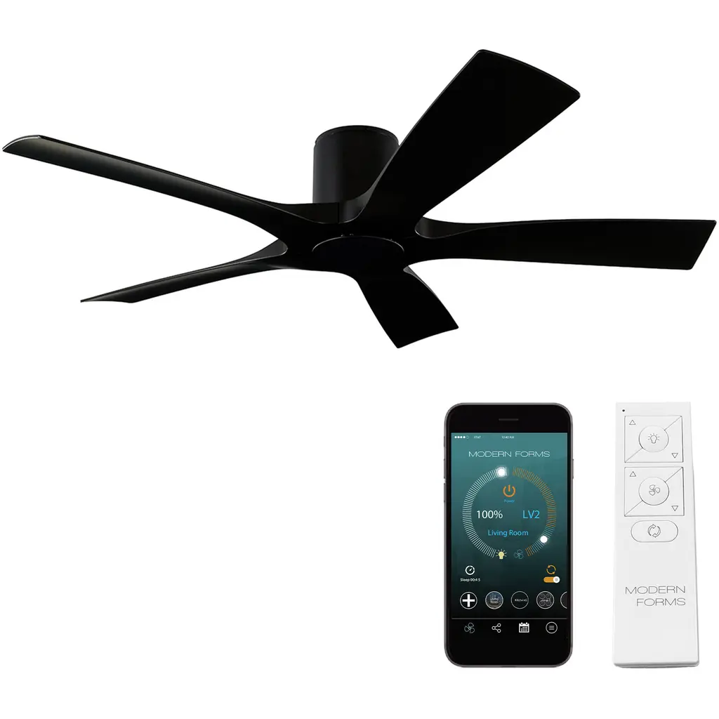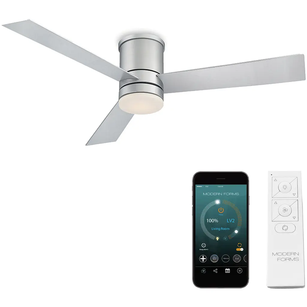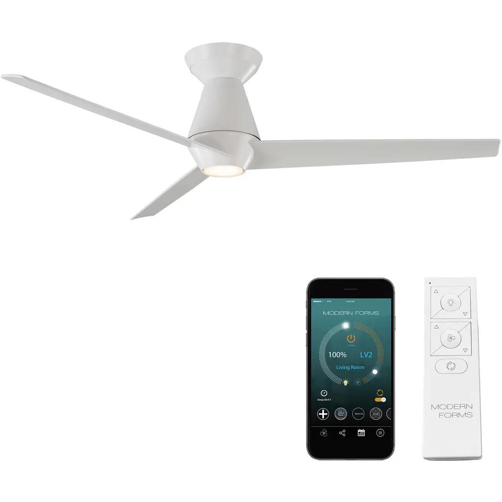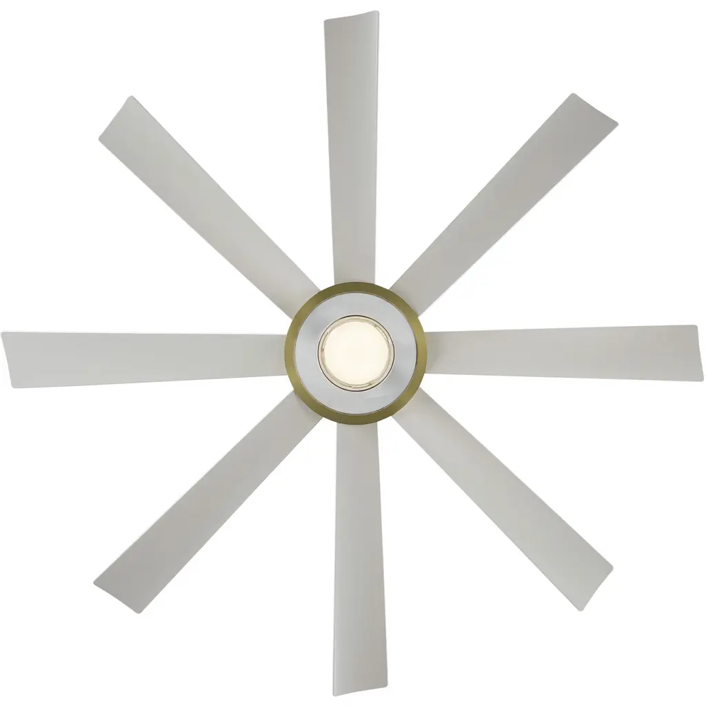 The sublime Aura Smart Ceiling Fan by Modern Forms defines the look and performance you desire in your bedroom, dining, or living area. A 60-inch sweep and a broad array of eight blades transport a swiftly moving surge of air across your room from an overhead silhouette with a cool cutting edge. Each blade is expertly engineered with a subtle curve to push a relaxed, comfortable breeze down over the room. Your remote control will commission one of its six speeds and drive the engine of comfort into your home.