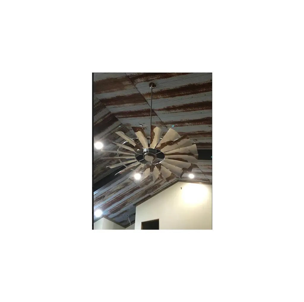 96 Inch Barn Metal Windmill Ceiling Fan, The American Fan-Our most popular finish is Barn Metal. This finish looks and feels just like a rusty, old windmill. Each Windmill fan is handcrafted and unique but to make it one of kind is this hand-painted finish. You choose how much rust you want and where you want it. There are many variations with this finish. It also looks great with a Matte Black motor and frame.Our windmill fans are hand-crafted, American made and truly one of a kind. We are a Texas family-owned and operated business. Each fan is constructed of durable steel and lightweight aluminum allowing for stress-free installation and perfect for interior or exterior placements.Our windmill ceiling fans work well in many settings - dining rooms, great rooms, bedrooms, barns and barndominiums, new builds and renovations, outdoor spaces, vaulted ceilings, ranch houses, farmhouses, cabin living.Easy Installation - standard ceiling supports and electricalEach fan is unique and one of a kindHand-crafted and American madeEighteen Blades for optimal balance (14 blades on the 46")Available in 46", 52", 60", 66", 72", 84" and 96" diameter sizingEfficient motor integration designNone or minimal assembly requiredConstructed only of quality steel and aluminum. Absolutely no molded plastic and particle board!Variable Speed, Geared Motor (Constant gear noise)Includes wall mount variable speed control box/converter, 115 Volt AC input converts to DC current and uses normal electrical wire to fan. Must be used with this motor. Dimensions 5" x 2" depth x 3 "width.CFM rating from 3000-7000Free consultation and adviceAccessory Kit includes everything needed for installationFamily owned and operatedEndless Custom Finishes we can match fixtures, paints, lighting, and moreFan weight is approximately 50-65lbs depending on the size and finishOutdoor damp ratedUp Light available upon request additional feeCan be used on a flat or sloped ceilingWe are the only Windmill Ceiling Fan Company that provides the unique aluminum lightweight, 18 blade design, and custom finishes.Note: Our fans are not mass-produced. Each of our windmill ceiling fans are hand-crafted, they might have slight variances and the rings may not be perfectly round or flat, very similar to an actual windmill in a pasture.Every fan is built, assembled, tested, and balanced with your blades and down rod. We remove the blades for shipping (smaller fan blades can be remain attached upon request). We number each blade and number the frame so you will get the same balanced effect when reattached. Our fans are shipped all over the US and internationally in custom packaging (70"x70"x20").Each fan is shipped with everything you need to hang and operate the fan, instructions, 9" down rod (any size down rod can be requested), c channel steel ceiling mount, and wall control box/converter.