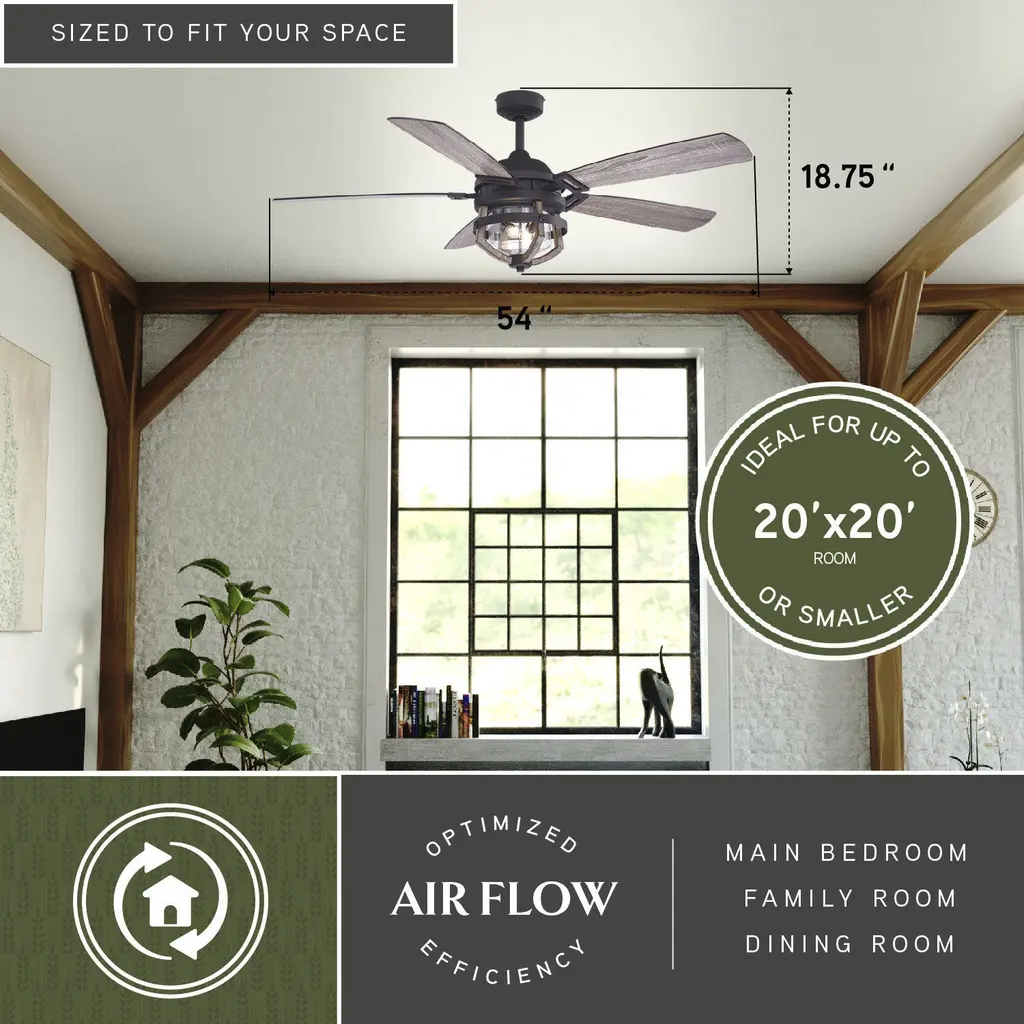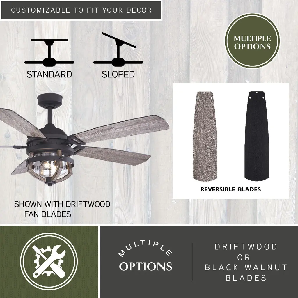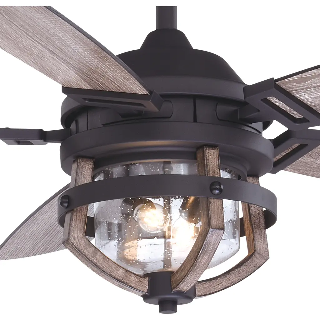 Farmhouse styling gives the Barnes fan a unique twist on an old favorite. The rustic oak cage light kit (included) surrounds a clear seeded glass globe. A matte black finish and five reversible blades complete the look. An LED light source provides energy saving, low maintenance and long-lasting performance. Combine that with vintage Edison style filament bulbs to complete the look. Wet rated for indoor and outdoor spaces, this modern country fan is ideal for many areas including great rooms, living rooms, and porches.