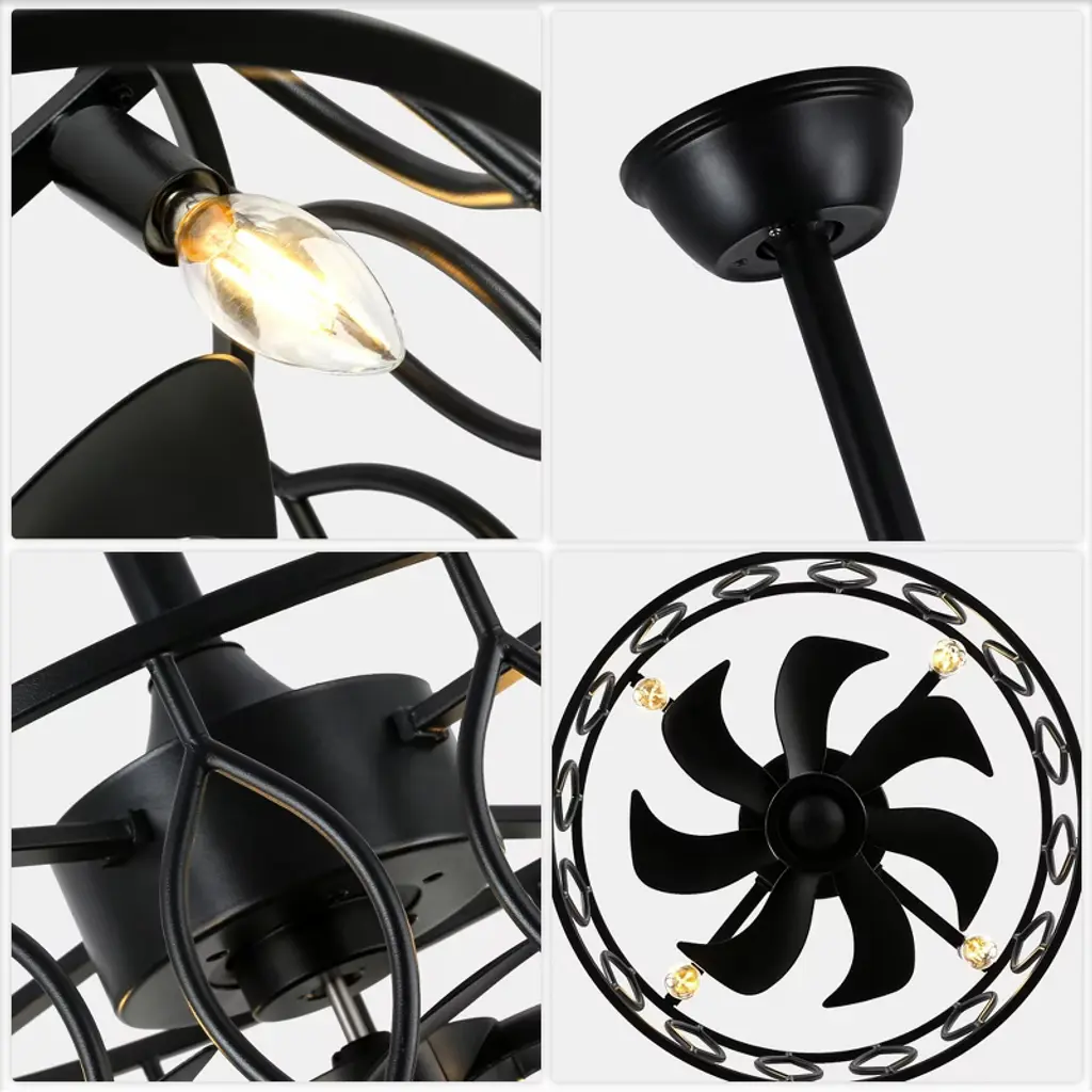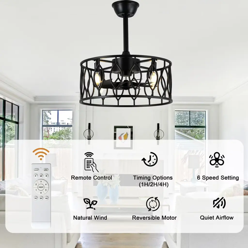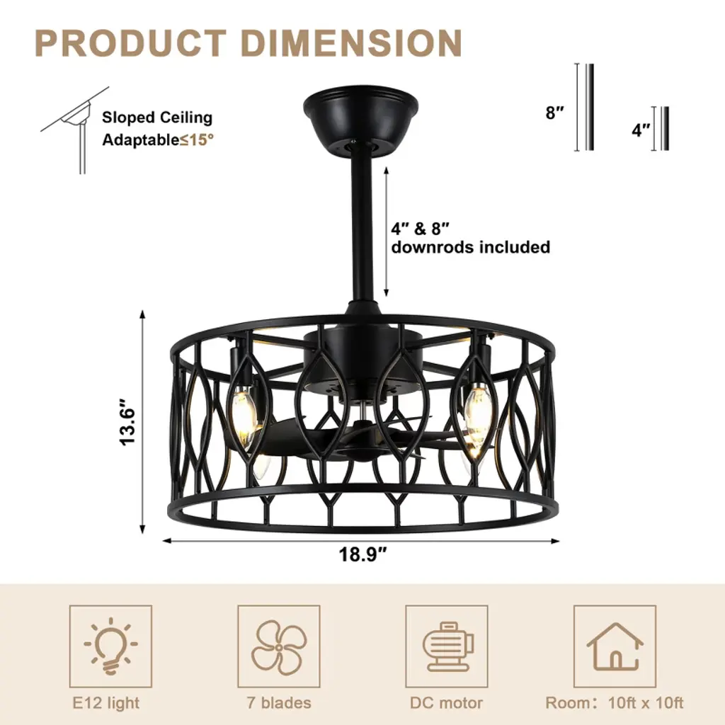 Introducing the Bella Depot 19" black cage ceiling fan light, where elegance meets functionality. This stylish fan features a sleek, minimalist design with a matte black metal frame that adds a touch of sophistication to any space. Equipped with 8 durable ABS blades, it ensures optimal airflow while operating quietly at just 50 dB¡ªeven on its highest setting! With 6 speed options and reversible rotation, it¡¯s perfect for year-round comfort. Customize your lighting with 4 E12 bulb sockets (bulbs not included) and enjoy the convenience of a built-in timer. Installation is a breeze with included 4" and 8" downrods, making it a versatile choice for any decor. Elevate your home with this chic and practical addition!
