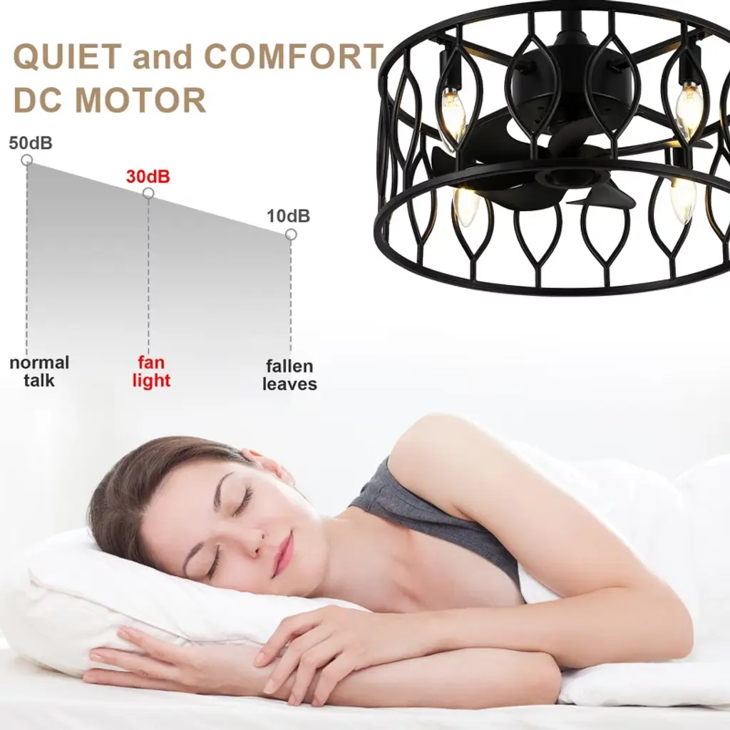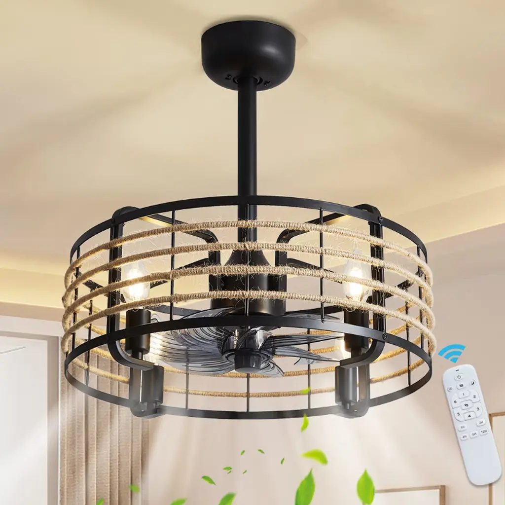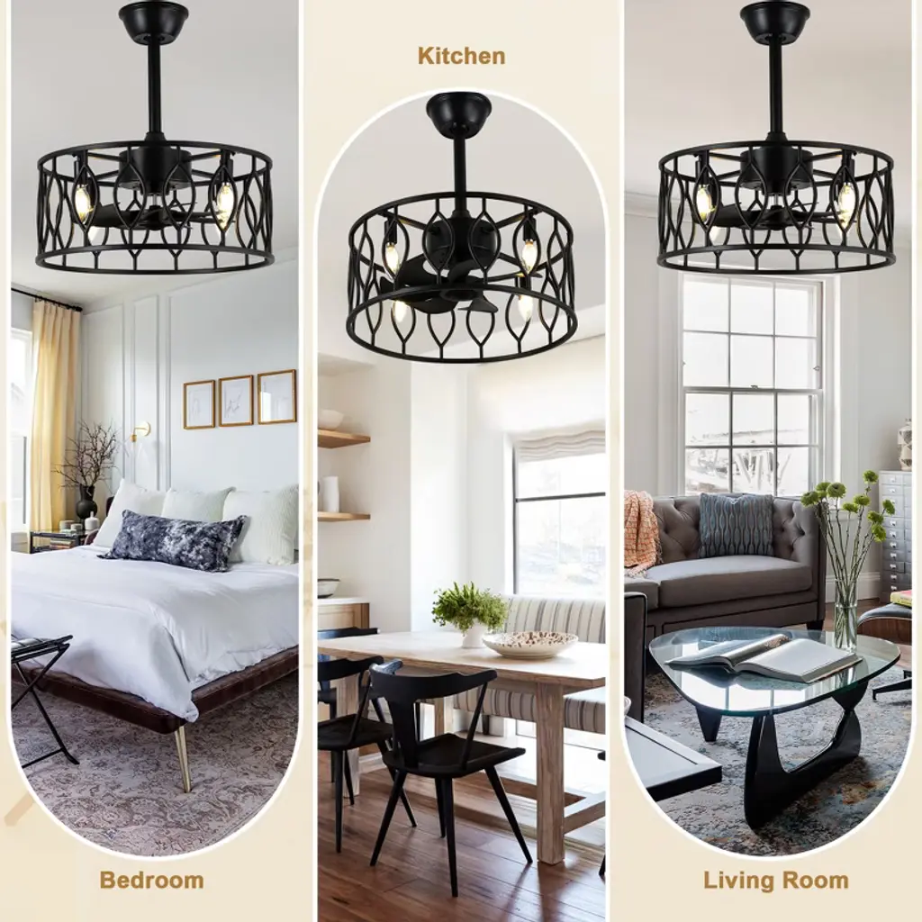 Introducing the Bella Depot 19" black cage ceiling fan light, where elegance meets functionality. This stylish fan features a sleek, minimalist design with a matte black metal frame that adds a touch of sophistication to any space. Equipped with 8 durable ABS blades, it ensures optimal airflow while operating quietly at just 50 dB¡ªeven on its highest setting! With 6 speed options and reversible rotation, it¡¯s perfect for year-round comfort. Customize your lighting with 4 E12 bulb sockets (bulbs not included) and enjoy the convenience of a built-in timer. Installation is a breeze with included 4" and 8" downrods, making it a versatile choice for any decor. Elevate your home with this chic and practical addition!