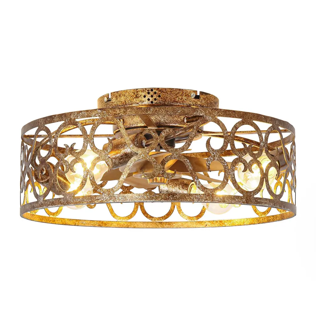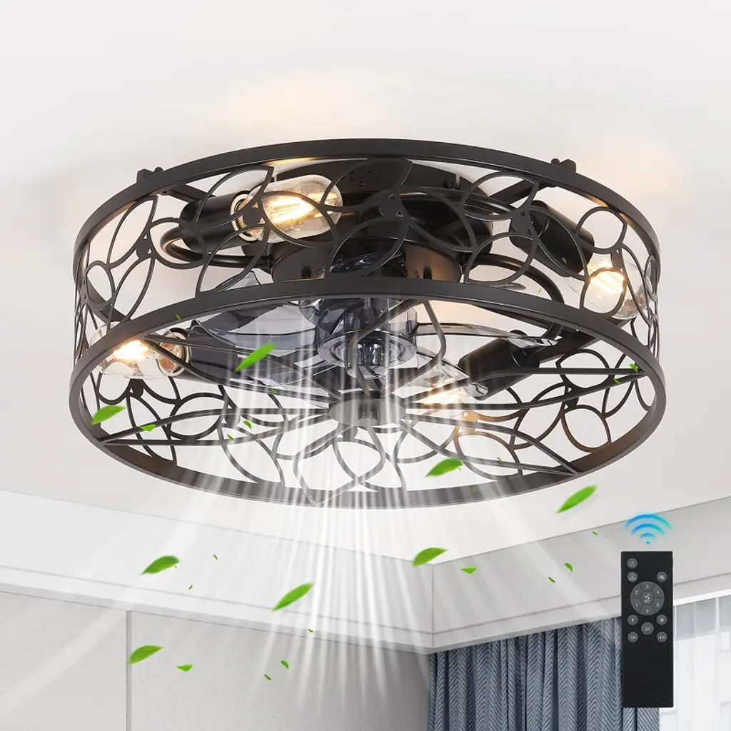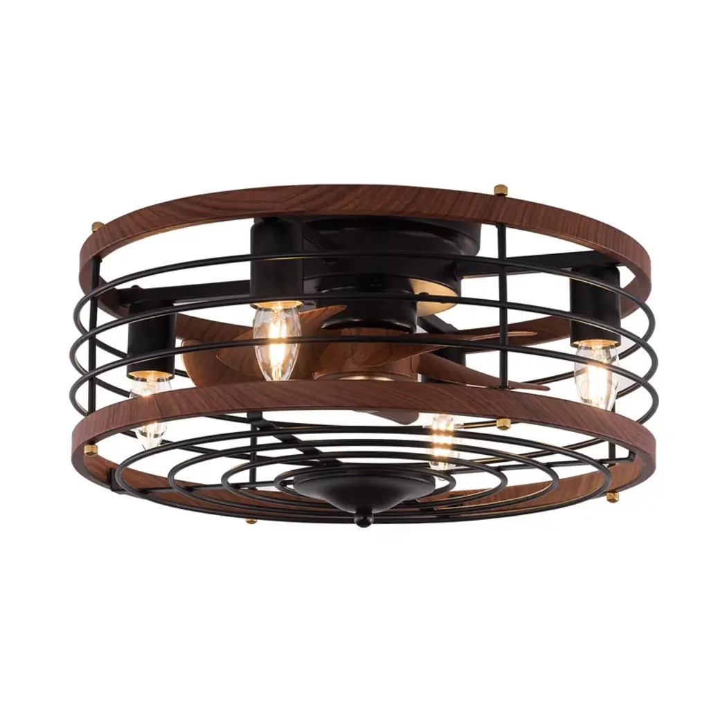 Blend farmhouse style and a cool breeze in this 8-blade flush mount caged ceiling fan. With a 19" span, it's just right for cooling down smaller spaces up to 8' by 10'. The fan body is crafted from wood in a rustic white finish, while the clear blades create an airy feel. Its geometric cage shade design houses four bulb bases, providing a dimmable warm glow to suit your mood. Reversible blades allow you to use this fan year-round. The fan is controlled by a remote, offering three-speed options for your convenience. Please note that standard bulbs are required but not included. Bulb Size: 4 x E26. Product Size:5.5"Hx18.5"Wx18.5"D