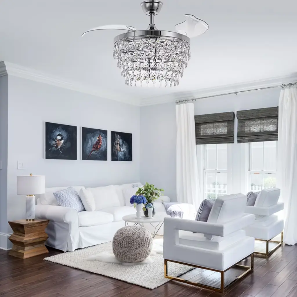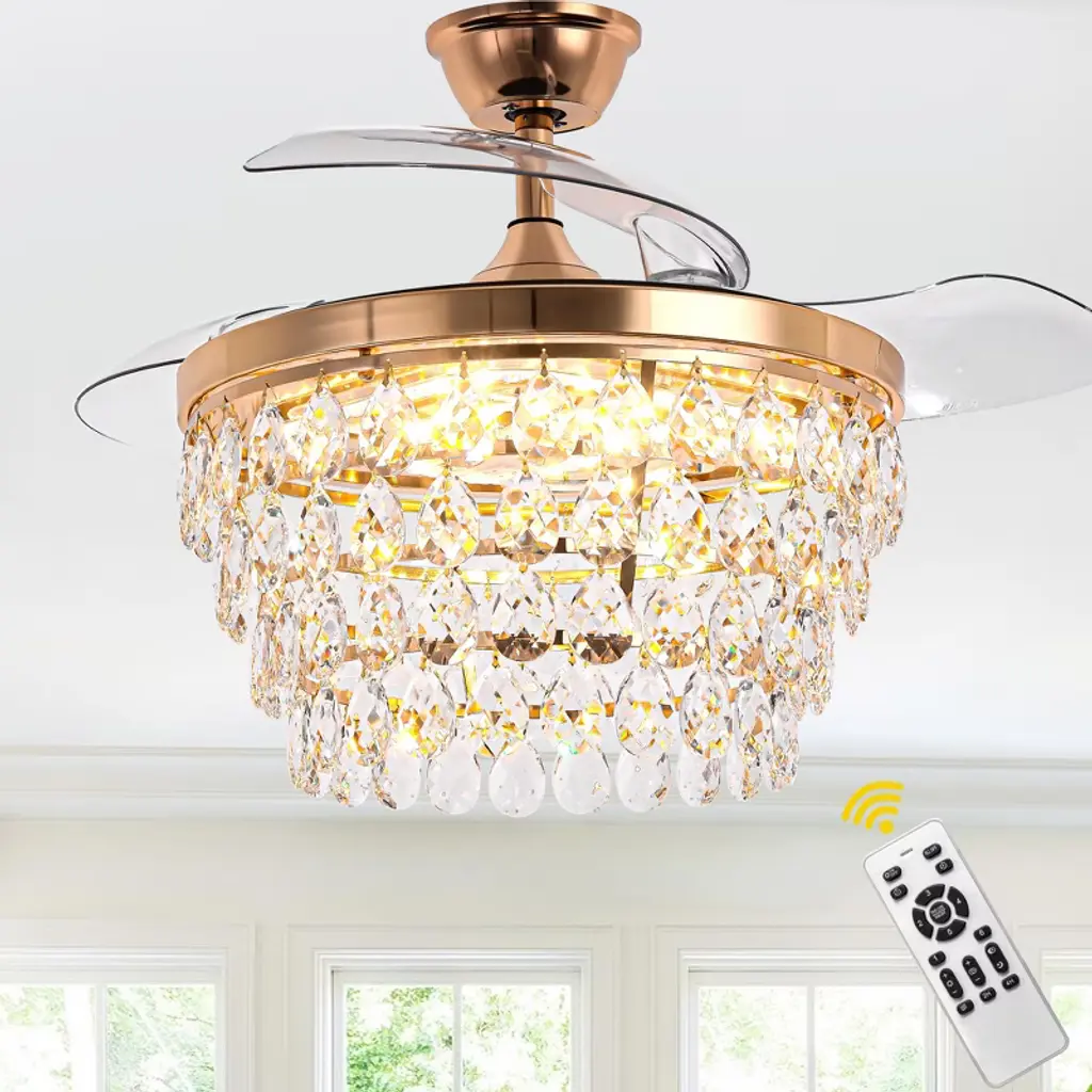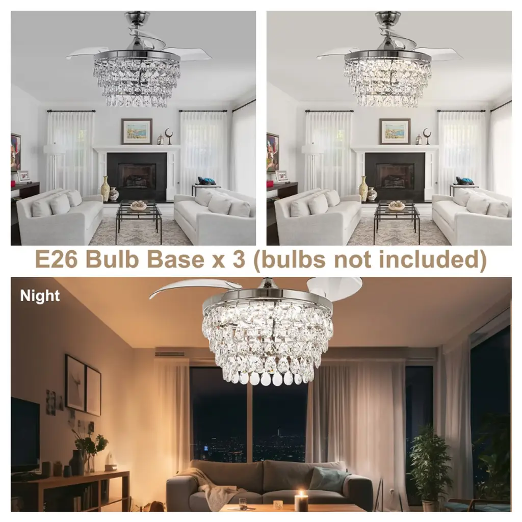 Transform your living space into a realm of elegance with the Bella Depot 42" Crystal Retractable Ceiling Fan. This exquisite fan combines high-end design with practical functionality, making it a stunning centerpiece for any room. With three retractable blades that remain hidden when not in use, this fan provides ample airflow while maintaining a sleek profile. The enchanting crystal lampshade casts a soft, dreamy glow, creating a romantic French-inspired ambiance that elevates your decor. When the lights are on, the crystals beautifully reflect light, adding a touch of sophistication to your space. Choose from six adjustable speed settings and enjoy the flexibility of a reversible motor, ensuring comfort in every season. This fan accommodates three E26 light bulbs (not included) to suit your unique lighting needs. With a convenient timer function and easy installation, the Bella Depot Crystal Ceiling Fan is designed for effortless use and compatibility with various interior styles. Experience the perfect blend of luxury and practicality¡ªbring home this stunning fan today!