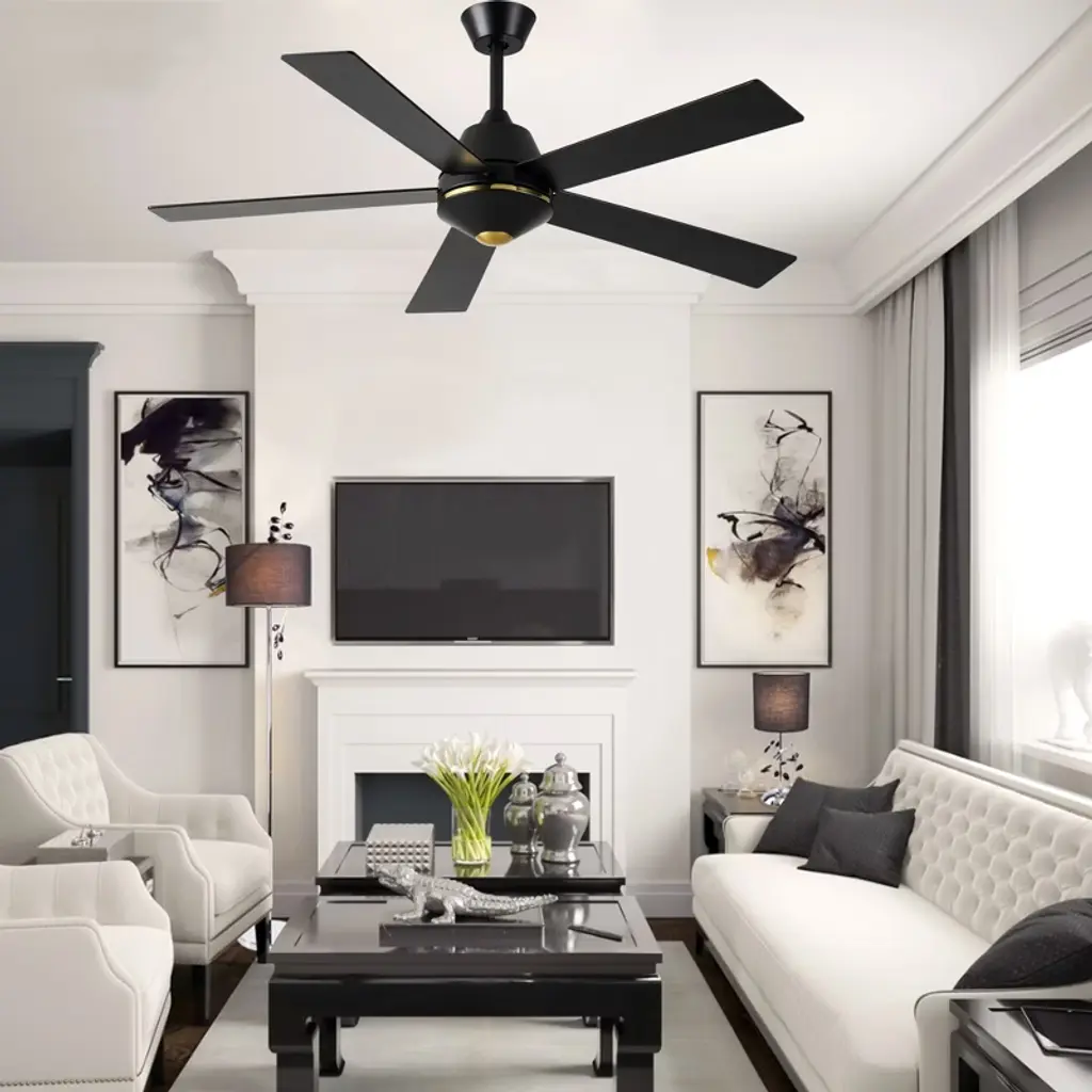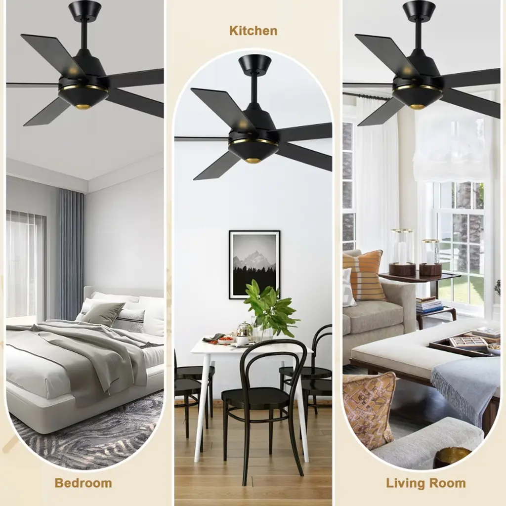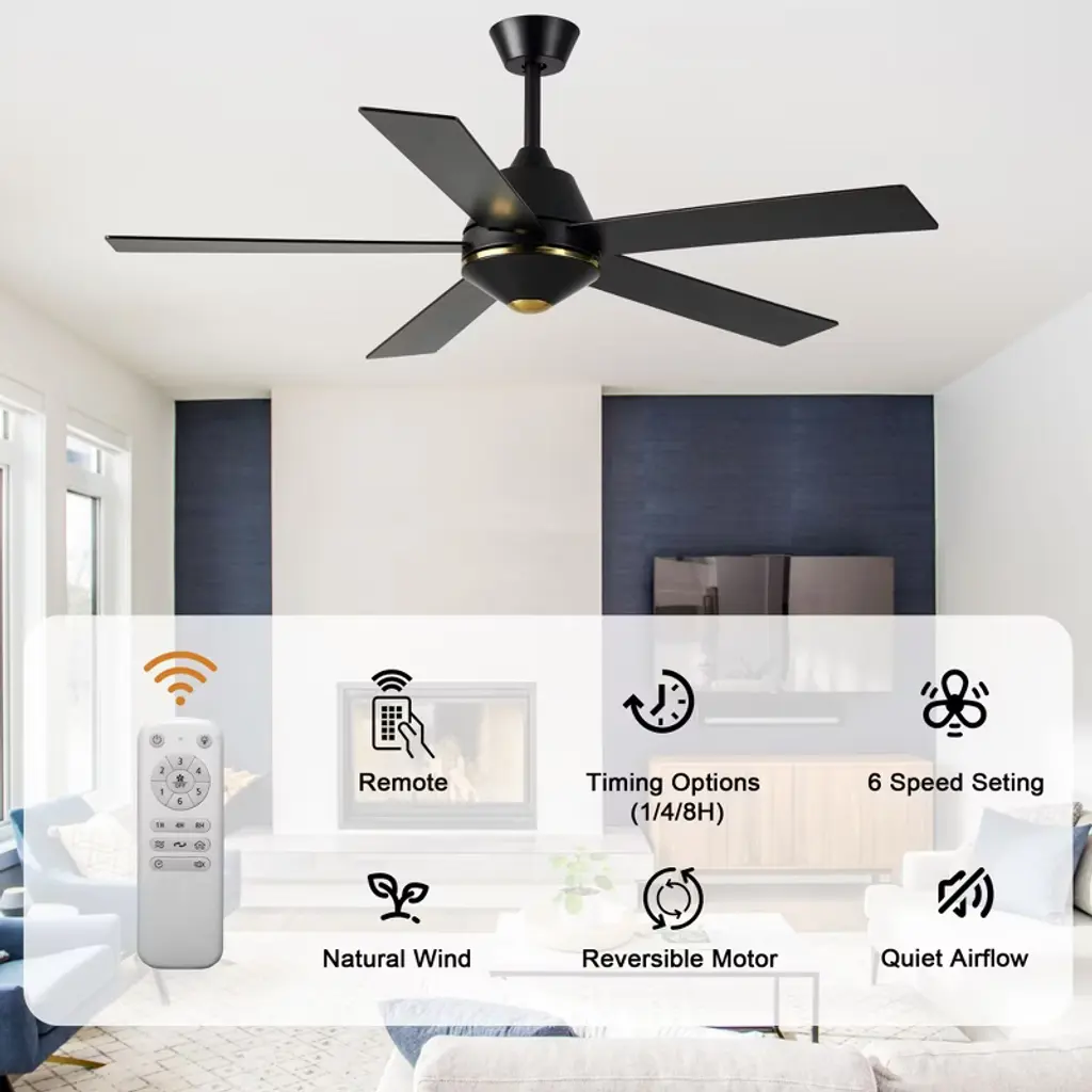 Upgrade your home with the Bella Depot 52" Modern Ceiling Fan with Light, a perfect blend of style and functionality! Featuring five elegant wooden blades and a sturdy metal frame, this fan is available in chic black or luxurious gold to suit your d¨¦cor. With six adjustable speed settings and a reversible motor, you can enjoy customized comfort all year round. Easy to install and designed to complement a variety of interior styles, this ceiling fan is a must-have for anyone looking to enhance their living environment. Transform your home with Bella Depot today!