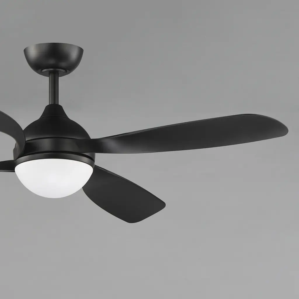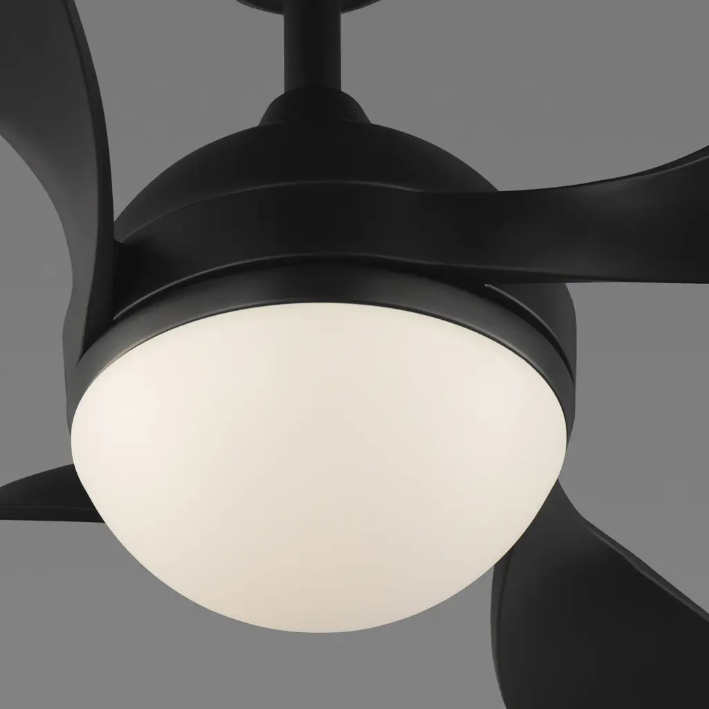 Modern and chic, the Bola collection elevates the standard fan with its beautifully balanced design. A sleek globe frame seamlessly separates the top DC motor housing from the lower LED light kit, while gracefully curved solid wood blades add a touch of natural sophistication. The energy-efficient DC motor ensures quiet operation, while the included remote control allows you to customize the CCT-tunable LED light, from warm to bright, for the perfect ambiance. Available in 52" blade span and finishes in Matte White, Matte Black, Satin Nickel with white wood blades, or Natural Aged Brass with white wood blades. Suitable for dry locations, Bola merges form and function with effortless charm.