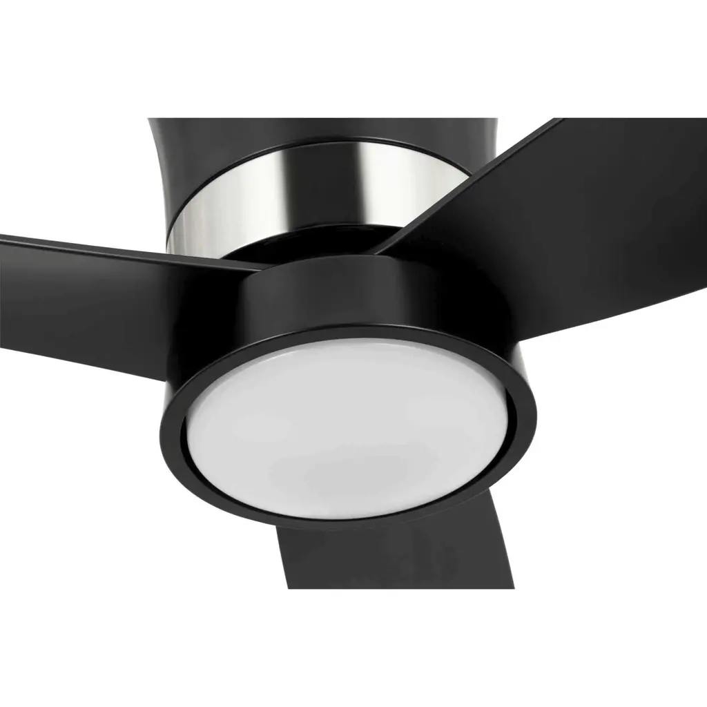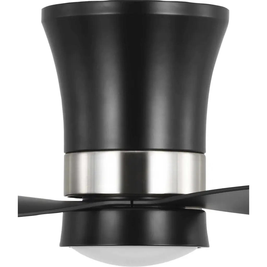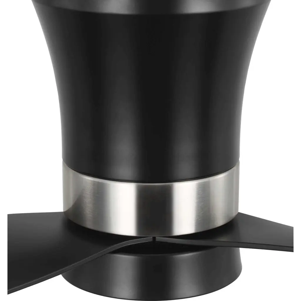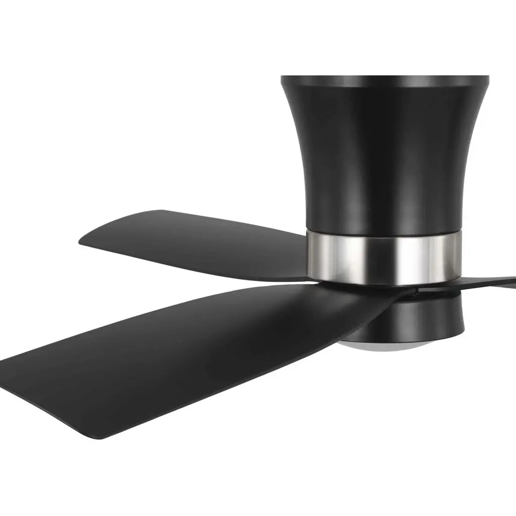 The Brant 52-inch hugger fan gives a new meaning to mid-century modern style and flair. A trio of clean-edged blades are held in place by a Brushed Nickel band wrapped around a flared cylinder that houses a quiet DC motor and an integrated 3000K LED light. The fan's sleek silhouette is finished in Matte Black. Brant is damp location listed for use indoors or covered outdoor areas. A full-function remote control and wall bracket are included.