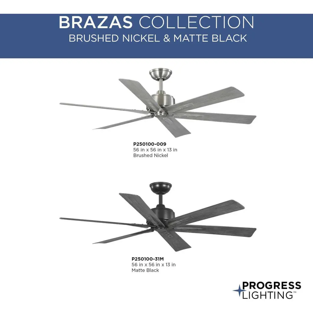 Fashionably detailed with bracketed trim, the Brazas 56-inch ceiling fan features six ABS fan blades and a quiet energy-efficient DC motor to keep spaces cool in style. This fan is light kit adaptable and includes a full-function remote control with a wall bracket. Available in Matte Black with Distressed Ebony blades and a UL damp rating, Brazas fits beautifully into transitional indoor or outdoor settings. .
