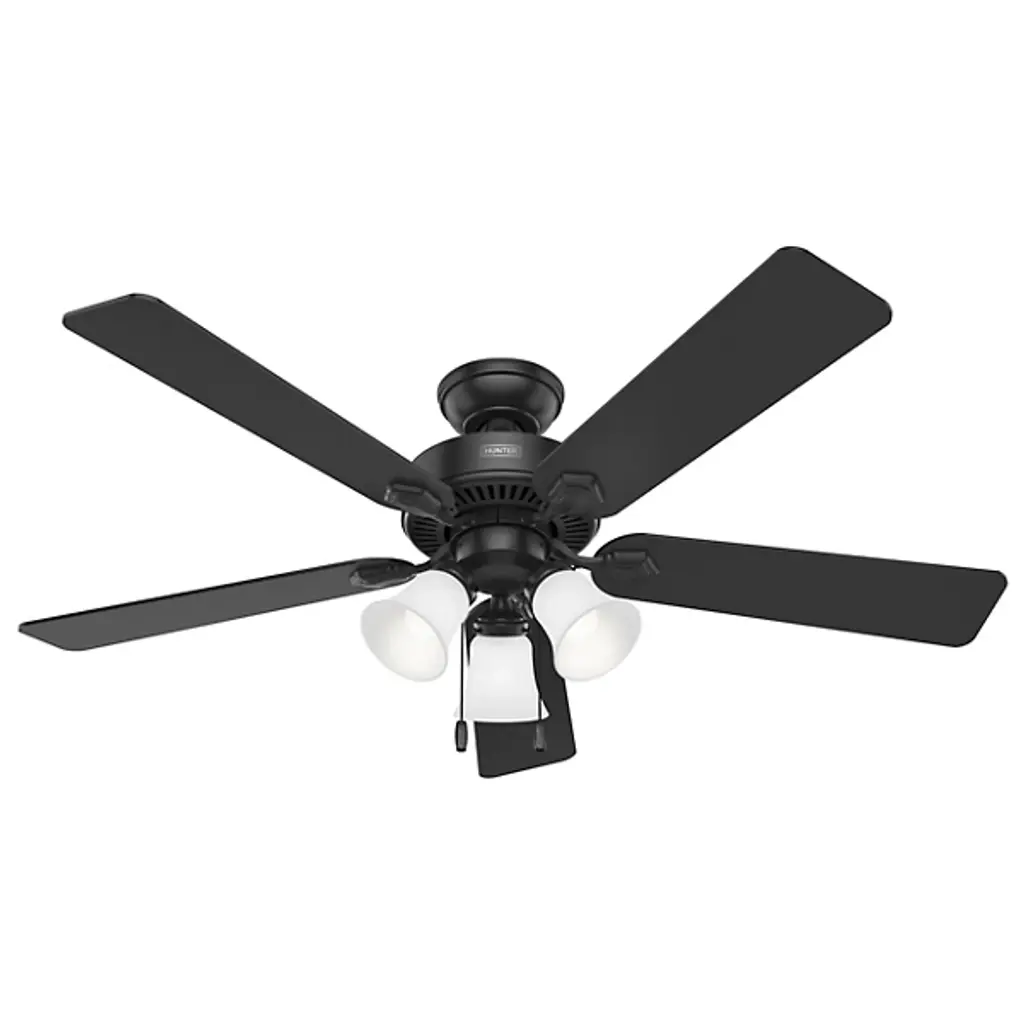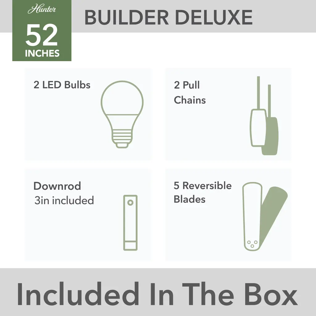 With a 52-inch blade span, the casual, traditional style of the Builder Deluxe LED ceiling fan will complement standard or large rooms in your home without overpowering them. A mainstay in the Hunter® product line, these ceiling fans with lights feature three-speed WhisperWind® motor technology to deliver quiet and ultra-powerful performance.