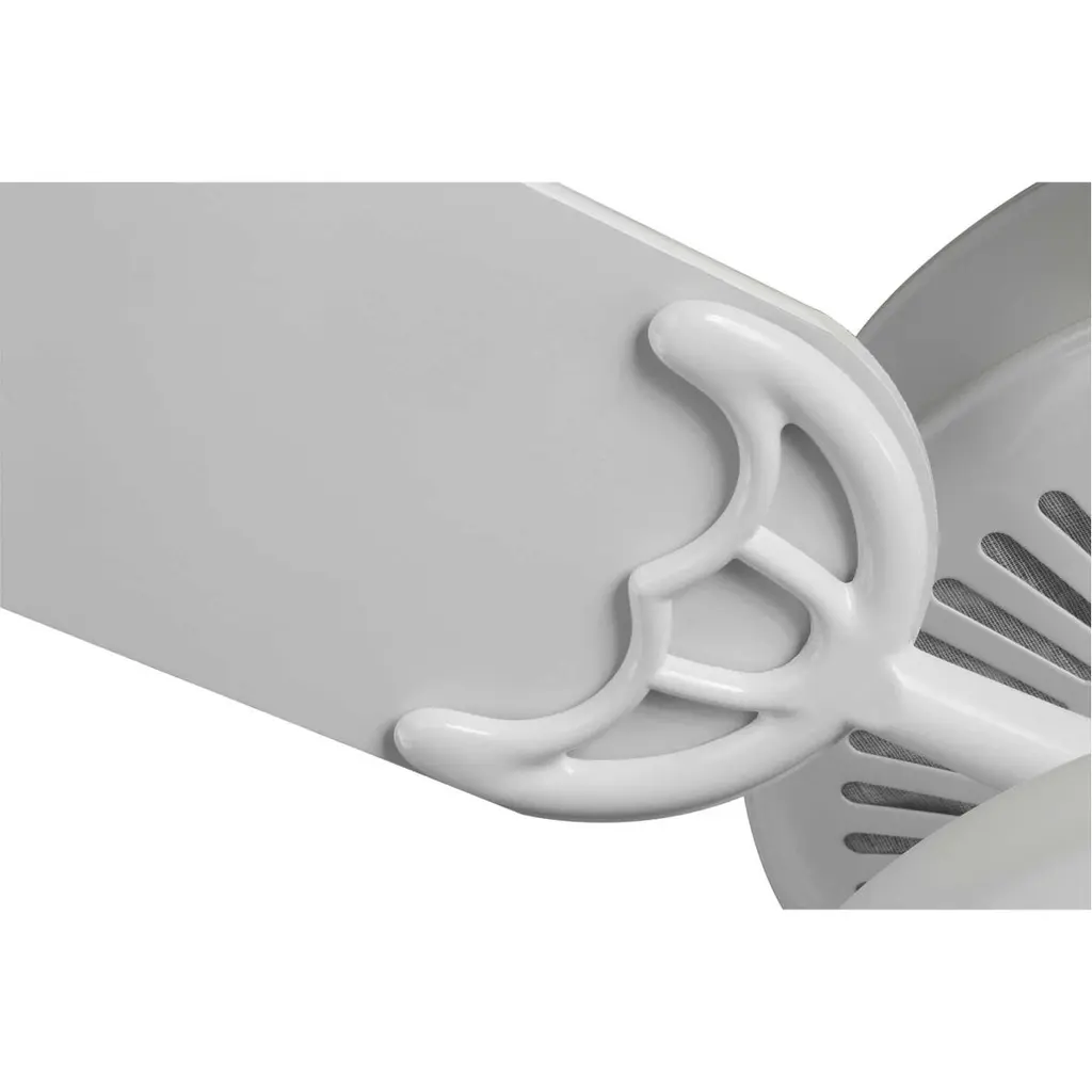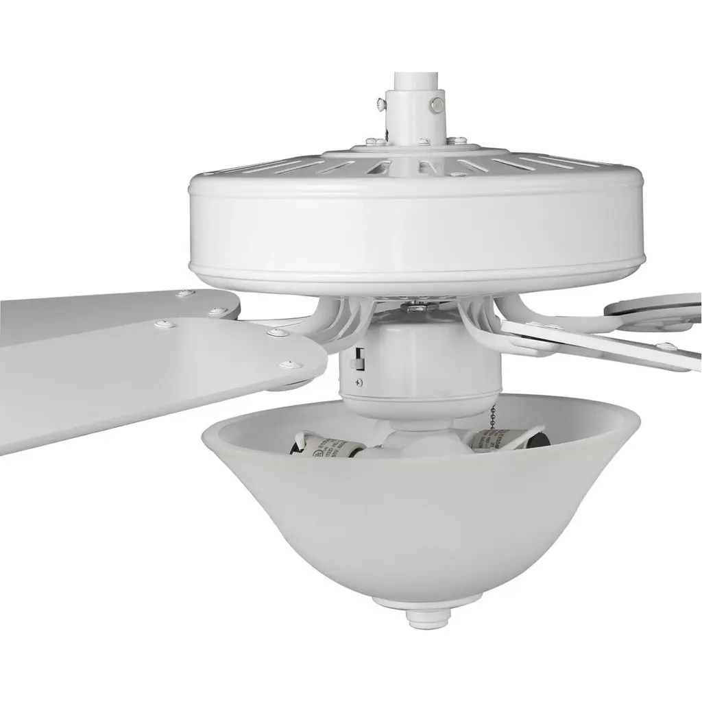 A 52 in two-light, five-blade fan with reversible blades and a beautifully crafted white etched glass bowl. Powerful AirPro motor features 3-speed, triple-capacitor control that can also be reversed to provide year-round comfort. Two medium-based LED lamps are included (non dimmable), offering energy efficiency and cost savings benefits for the home, while a dual mount canopy accommodates flat or sloped ceilings. White finish.