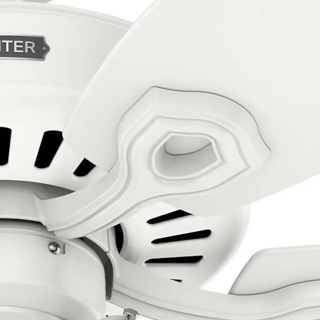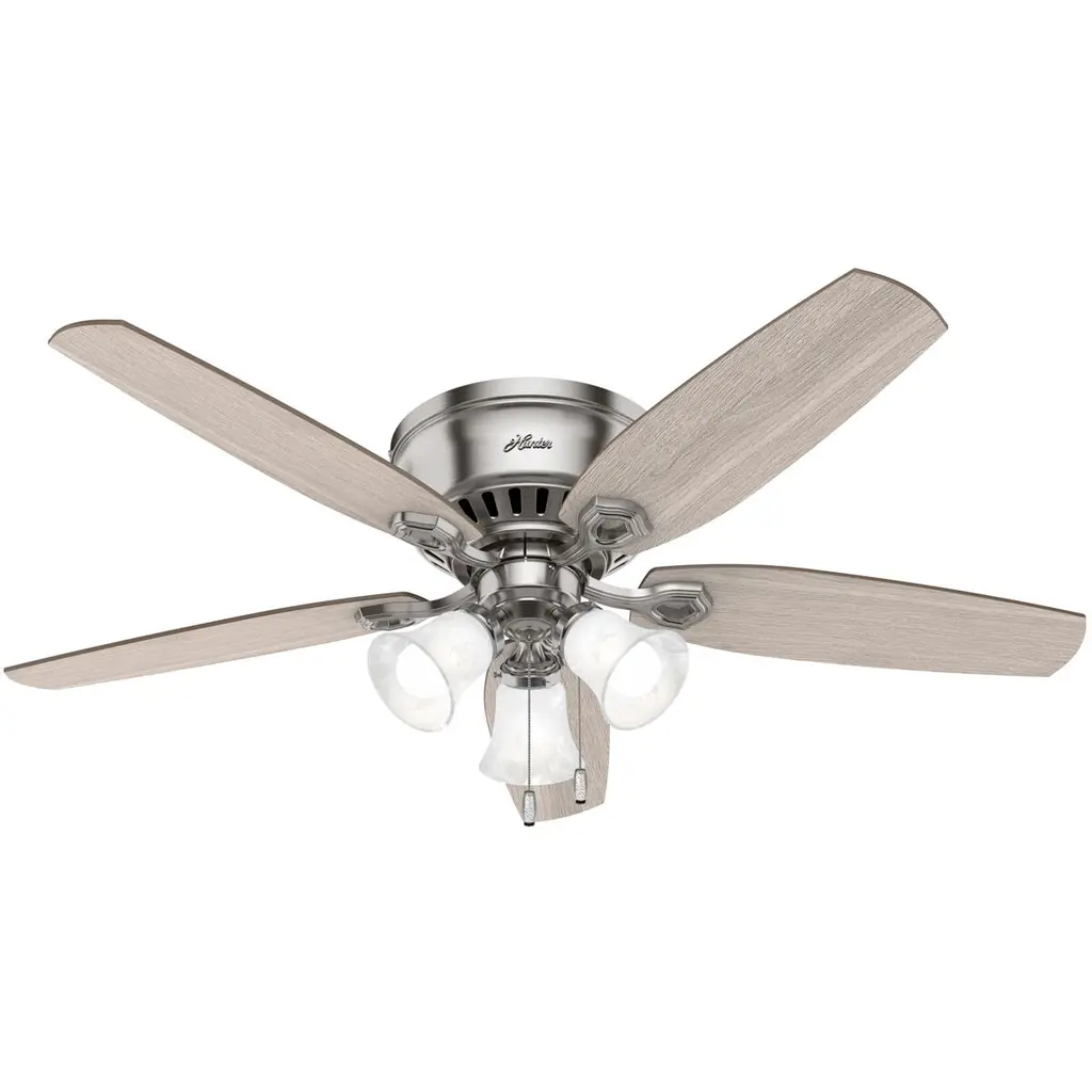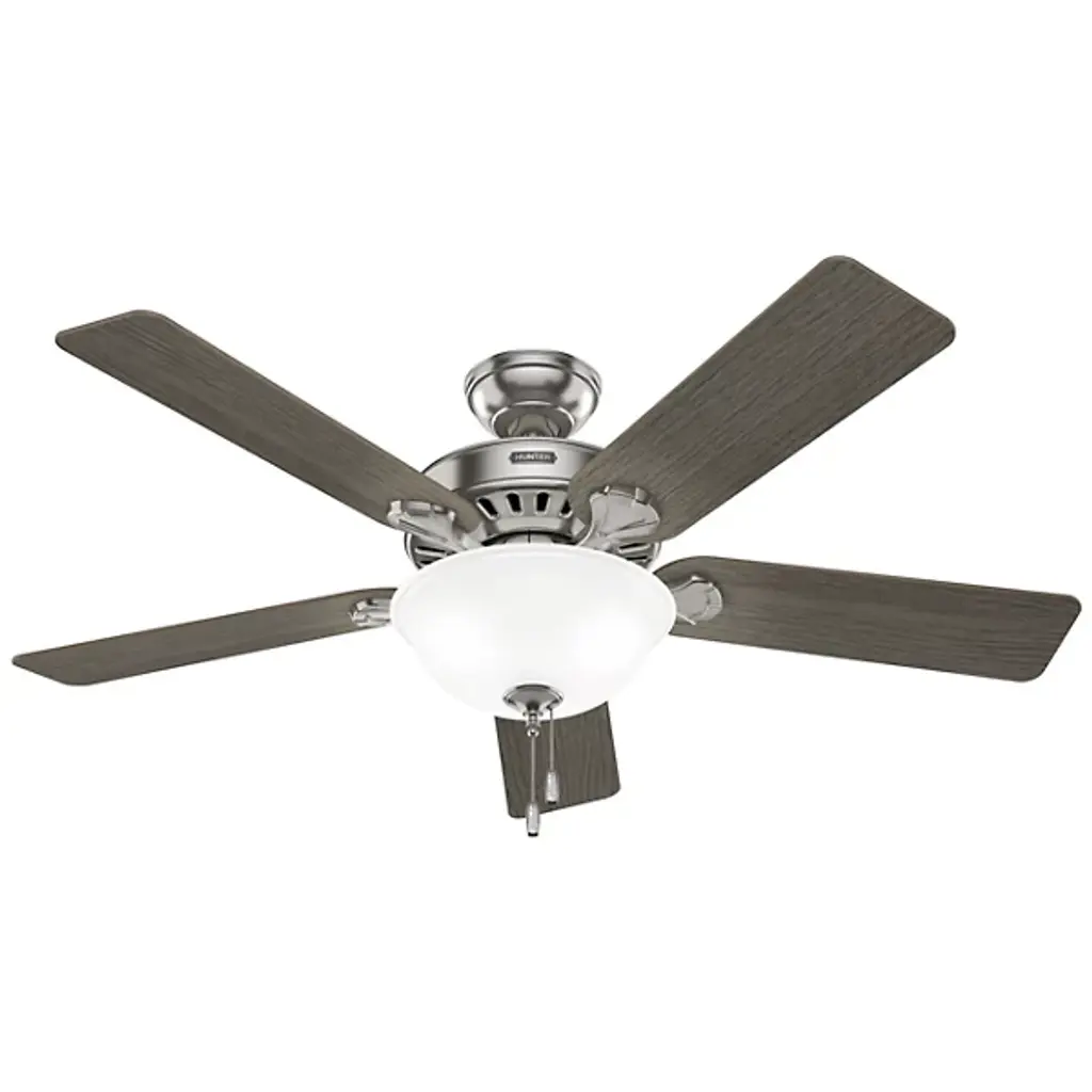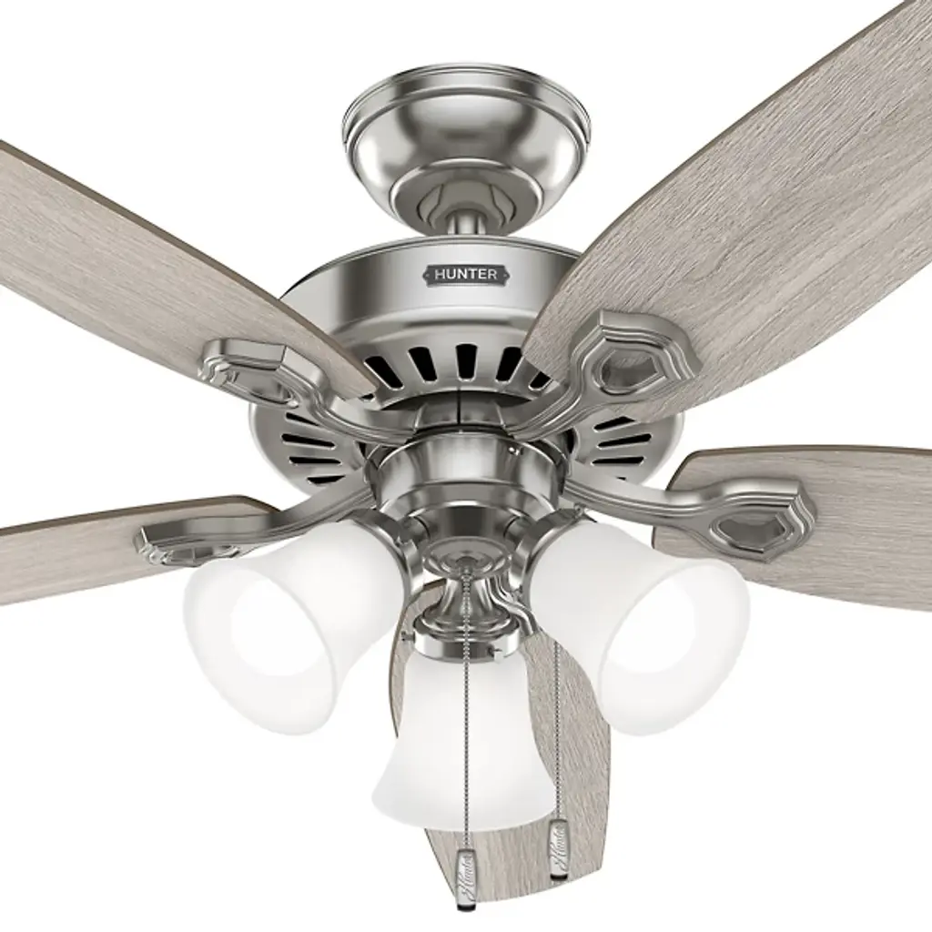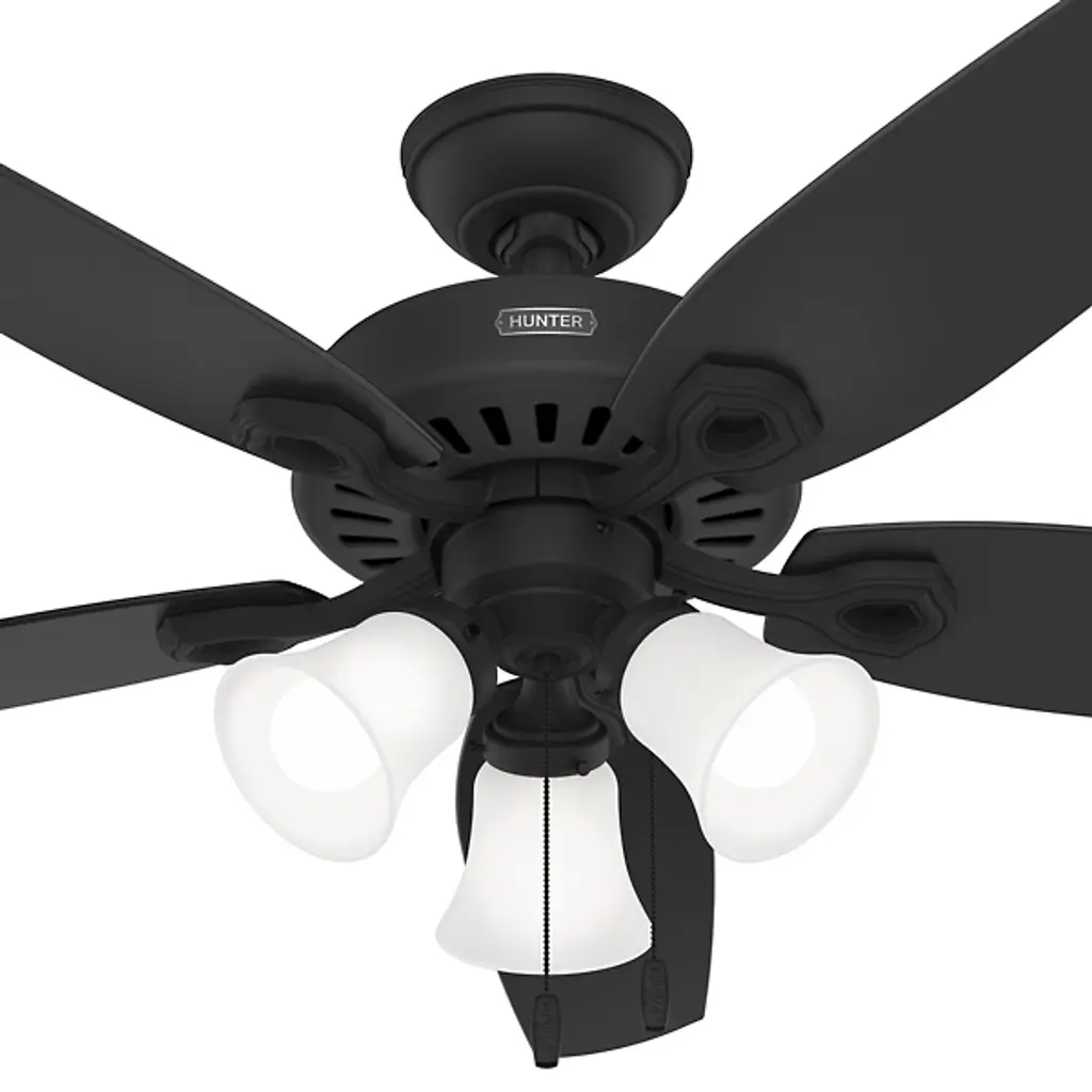 The Builder DC Ceiling Fan from Hunter Fans is crafted for durability. Your fan is made from high-quality steel and composite materials. The frosted glass shades, illuminated by LEDs, add a touch of charm to the design. Featuring 5 reversible blades, this fixture is powered by a DC motor. With 6 fan speeds in forward and reverse, Builder offers effective air circulation. The convenient pull chain is designed for easy use.