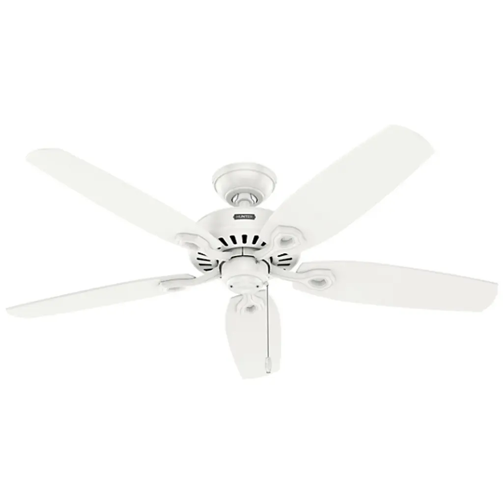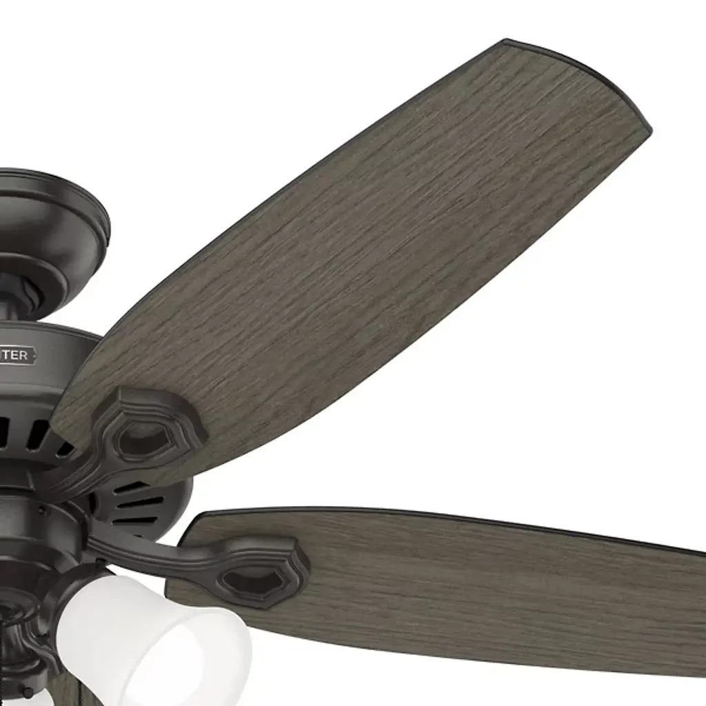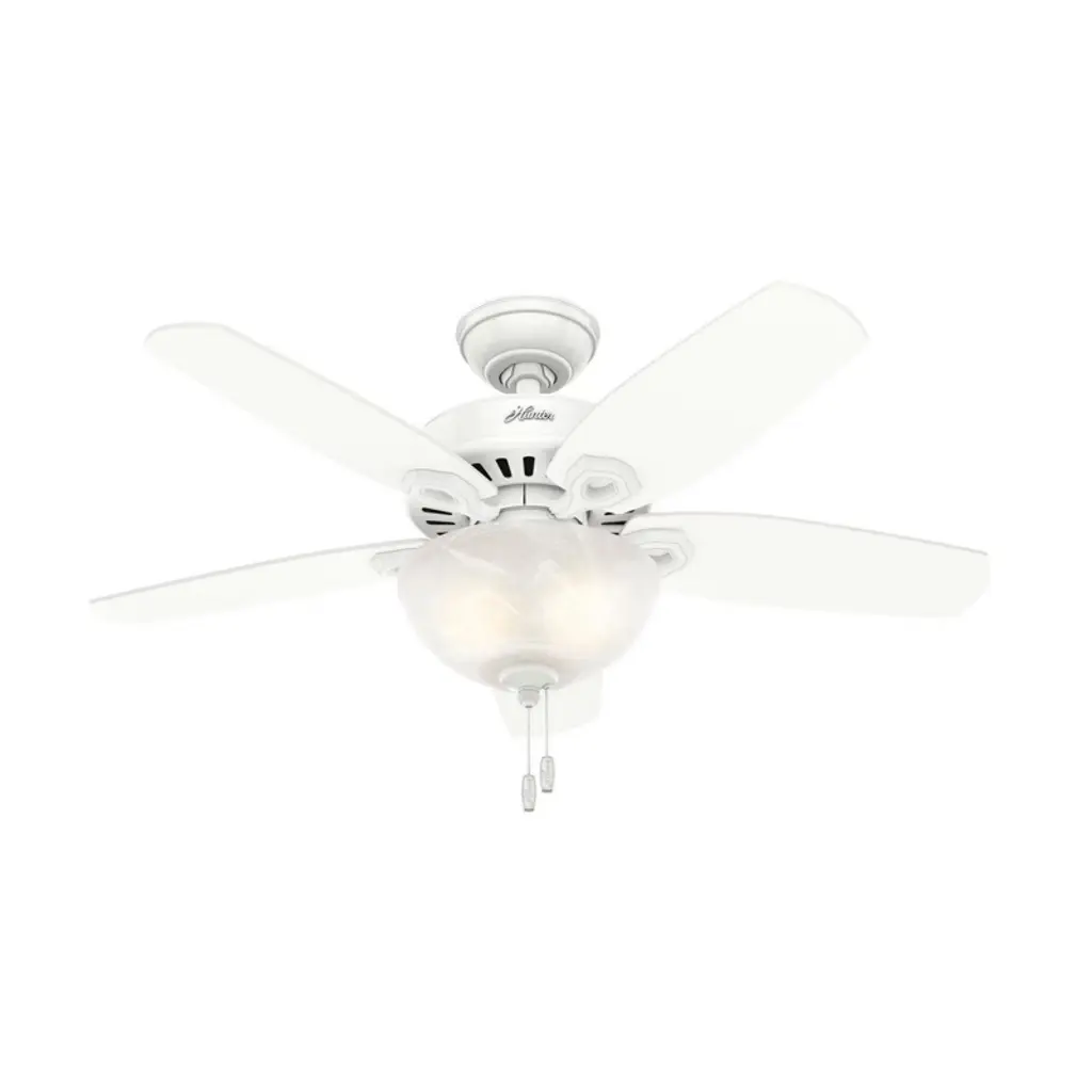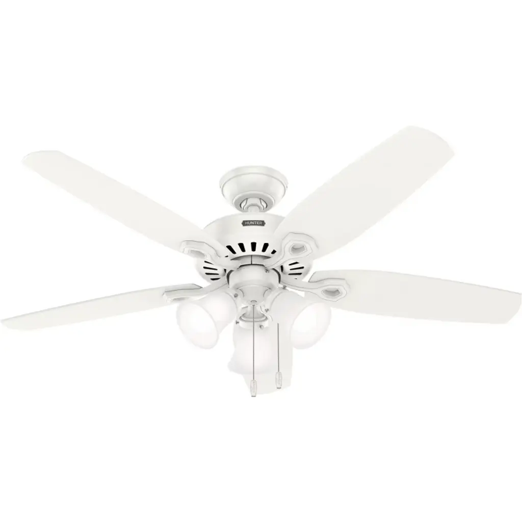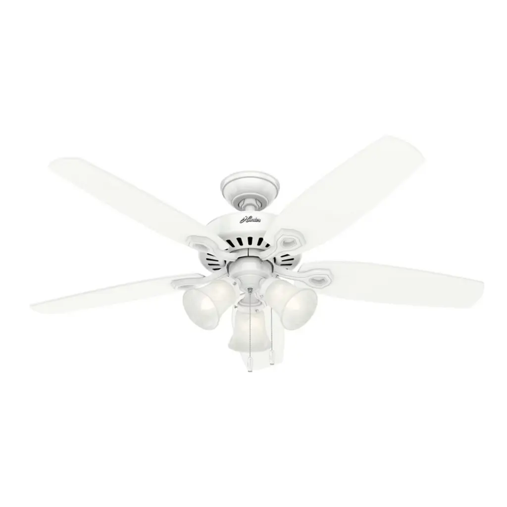 The Builder DC Ceiling Fan from Hunter Fans is crafted for durability. Your fan is made from high-quality steel and composite materials. The frosted glass shades, illuminated by LEDs, add a touch of charm to the design. Featuring 5 reversible blades, this fixture is powered by a DC motor. With 6 fan speeds in forward and reverse, Builder offers effective air circulation. The convenient pull chain is designed for easy use.