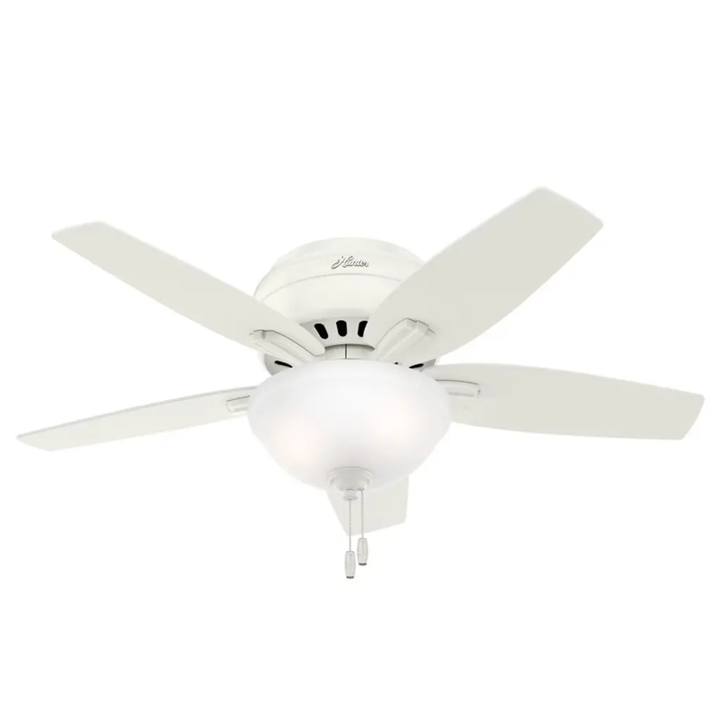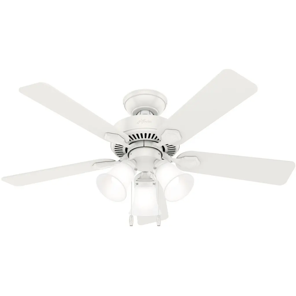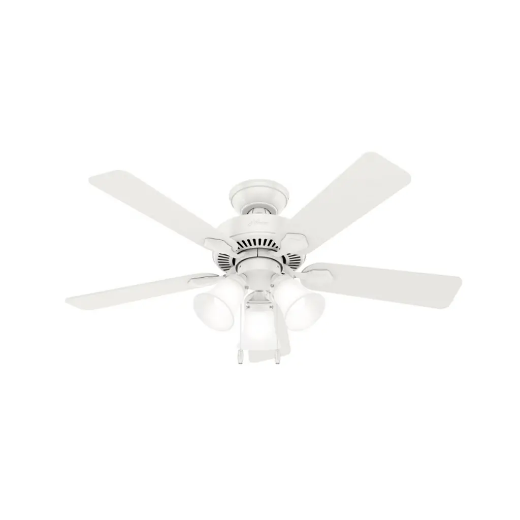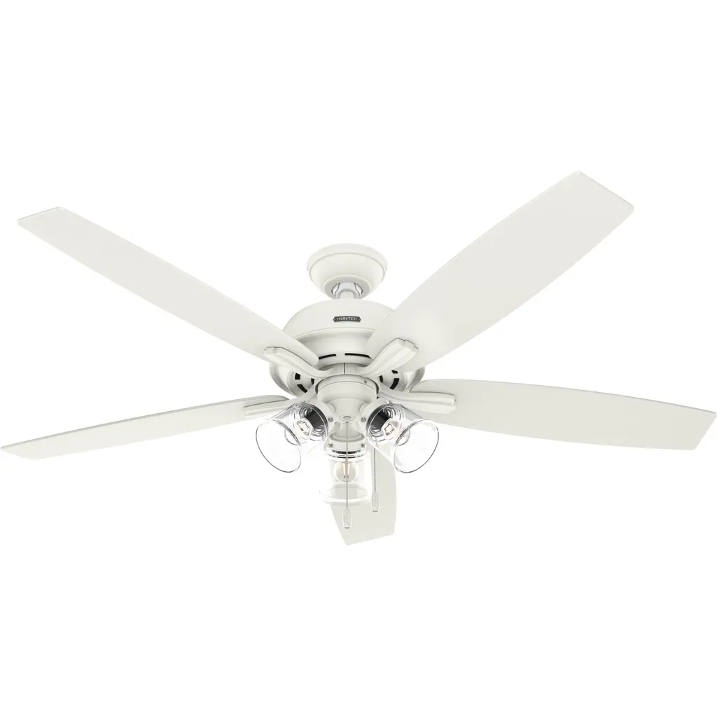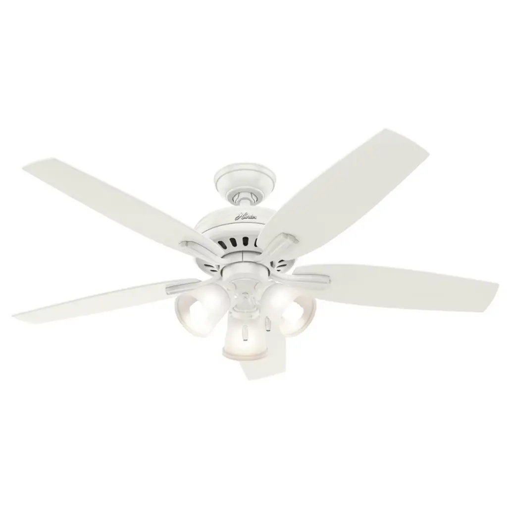 The Builder DC Ceiling Fan from Hunter Fans is crafted for durability. Your fan is made from high-quality steel and composite materials. The frosted glass shades, illuminated by LEDs, add a touch of charm to the design. Featuring 5 reversible blades, this fixture is powered by a DC motor. With 6 fan speeds in forward and reverse, Builder offers effective air circulation. The convenient pull chain is designed for easy use.