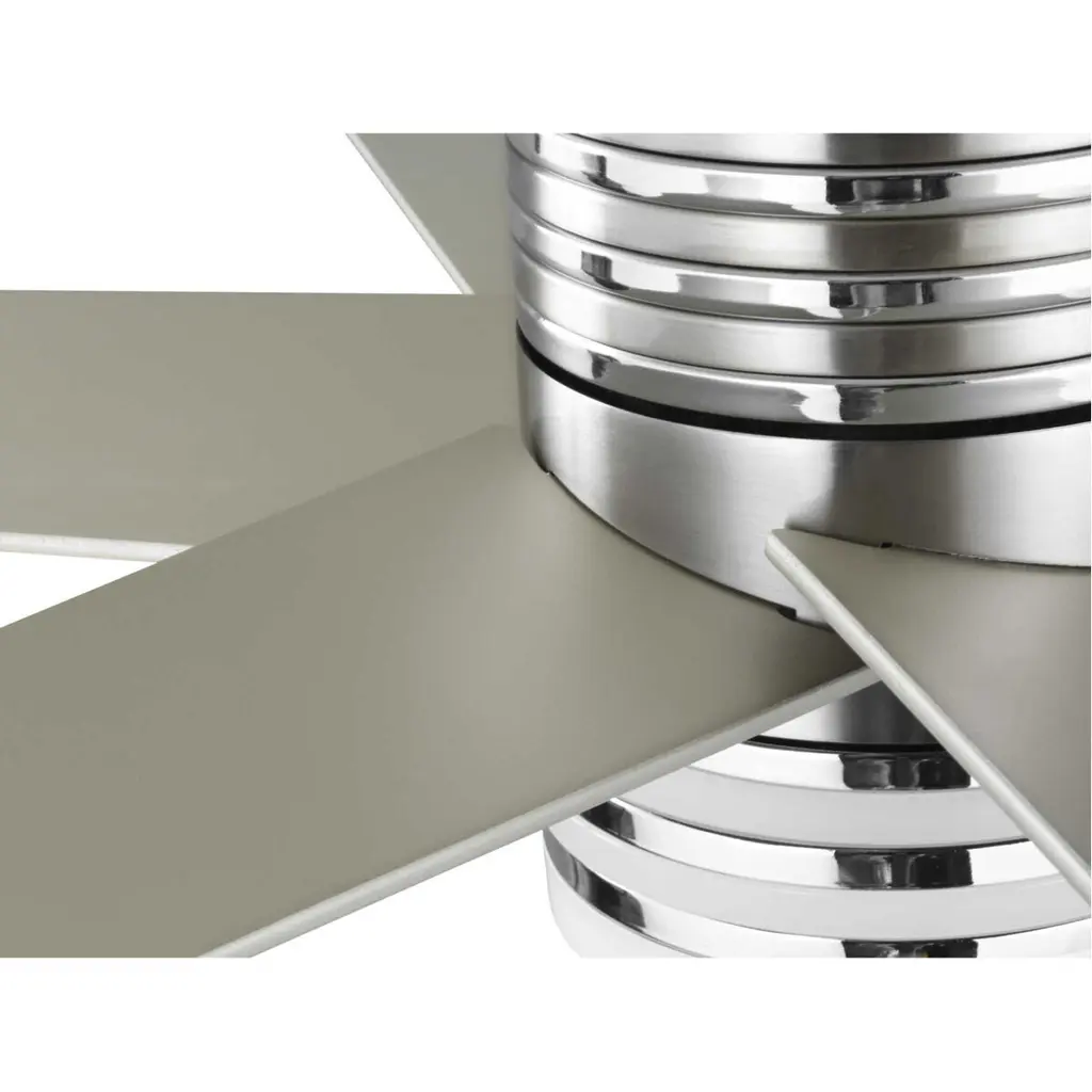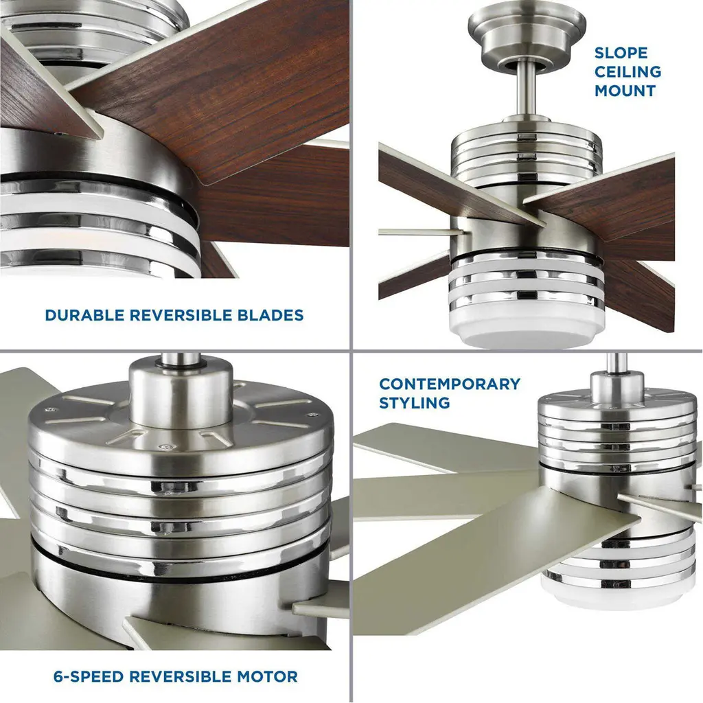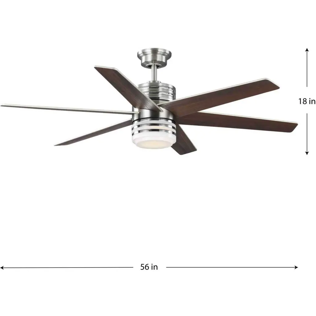 Provide a welcomed breeze with a 56" ceiling fan from the Carrollwood Collection. Six reversible plywood blades coated in dual American walnut and silver finishes rotate around a beautiful brushed nickel center with chrome accents for a contemporary aesthetic. An integrated LED module is covered by a shatterproof white opal shade. Dimmable.