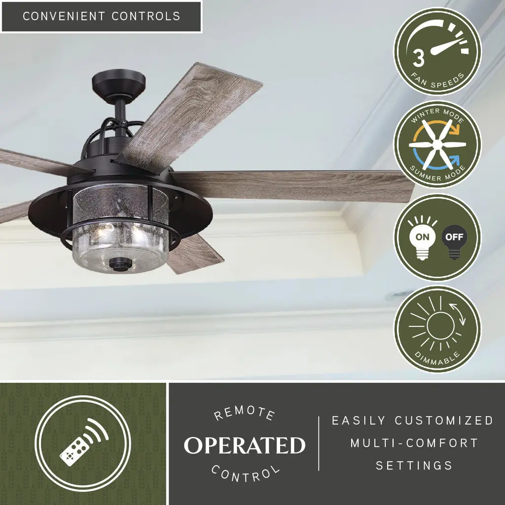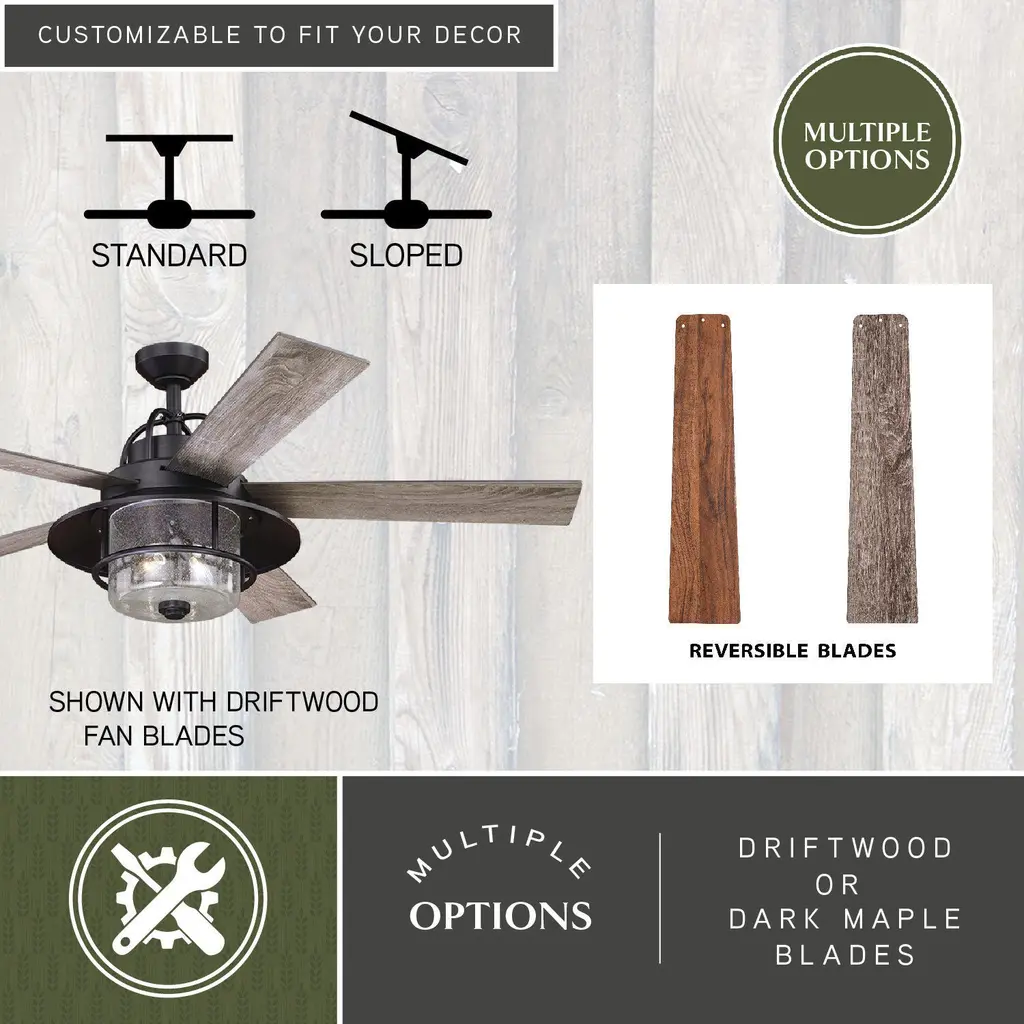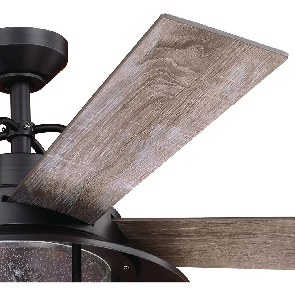The Charleston 56 inch indoor-outdoor ceiling fan brings a trendy nautical look to your living space. The new bronze finish and clear seeded glass on the included light kit combine perfectly to bring you a rustic farmhouse look. Blades are reversible choose between driftwood or dark maple for even more flexibility. This fan is operated with an included remote control for added convenience. An LED light source provides energy saving, low maintenance and long lasting performance. Exterior damp rated, ideal for interior and exterior spaces such as entryways, family rooms, or covered outdoor porches.