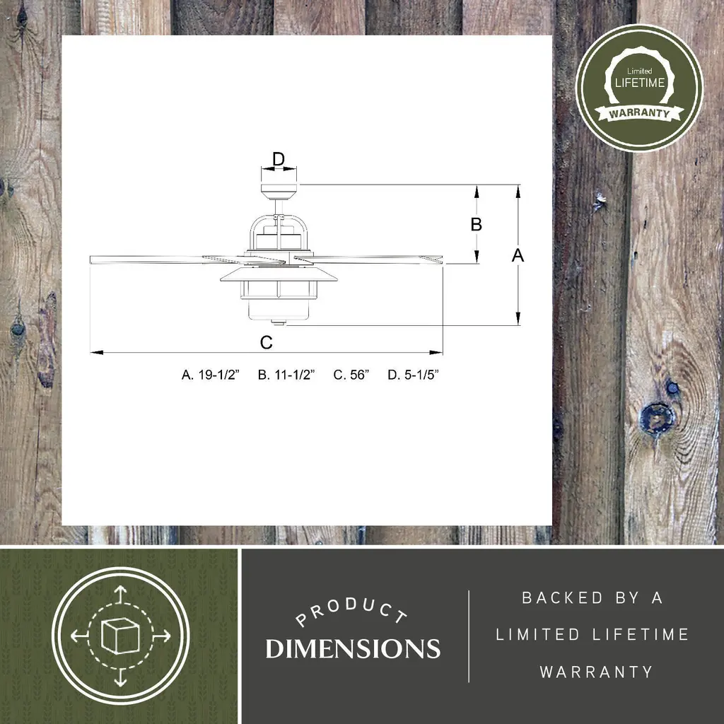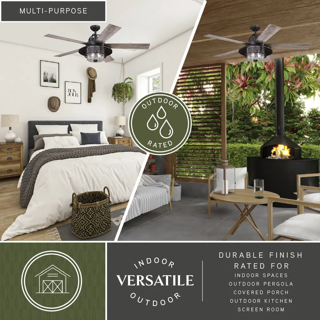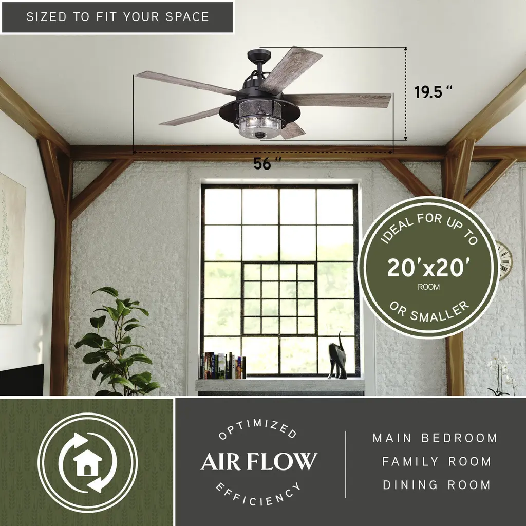 The Charleston 56 inch indoor-outdoor ceiling fan brings a trendy nautical look to your living space. The new bronze finish and clear seeded glass on the included light kit combine perfectly to bring you a rustic farmhouse look. Blades are reversible choose between driftwood or dark maple for even more flexibility. This fan is operated with an included remote control for added convenience. An LED light source provides energy saving, low maintenance and long lasting performance. Exterior damp rated, ideal for interior and exterior spaces such as entryways, family rooms, or covered outdoor porches.