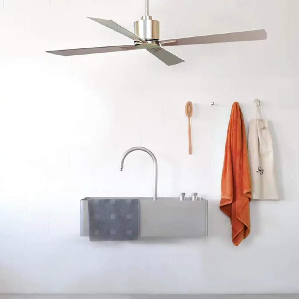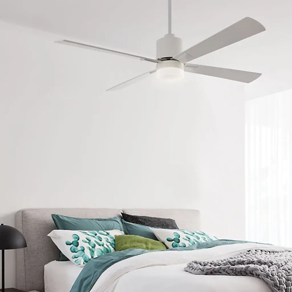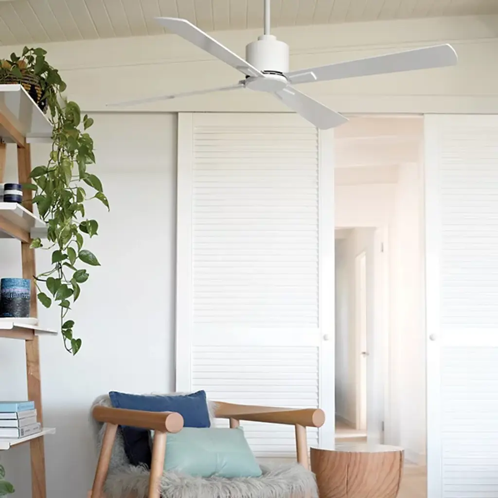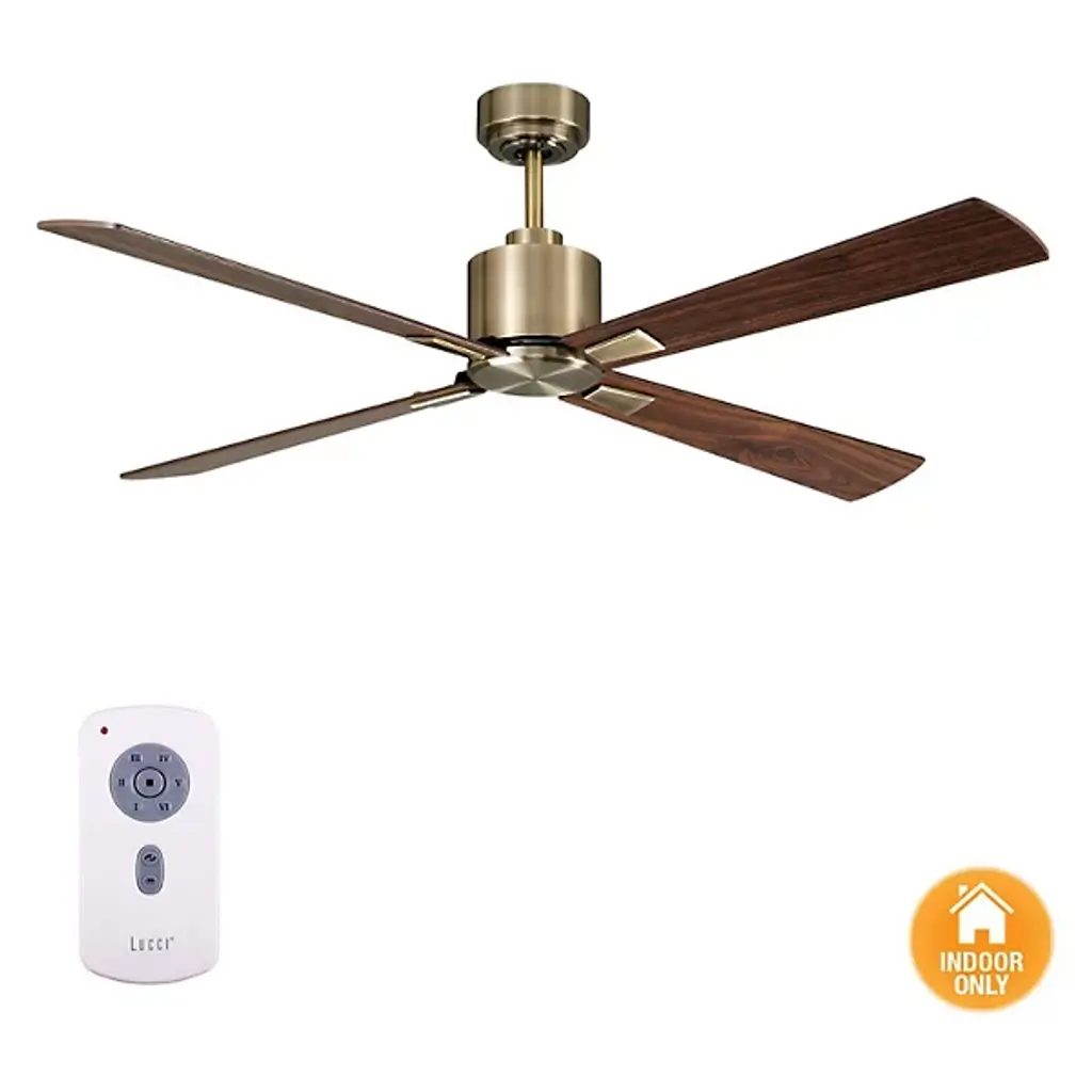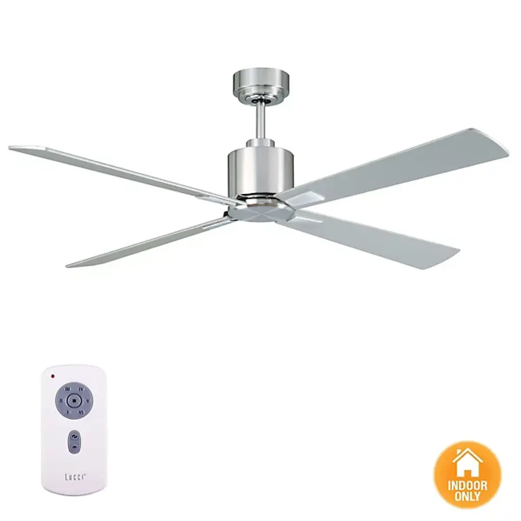 The Climate LED Lucci Air Ceiling Fan by Beacon Lighting presents clean, contemporary lines and modern efficiency. Designed by Lucci Air, it features four elongated, slim plywood blades angled at 14 degrees to ensure strong, consistent airflow at six forward and reverse speeds. At its center, a quiet and energy-efficient DC motor powers the fan with minimal noise. A dimmable integrated LED light provides ambient illumination, adjusting easily with the included handheld remote.