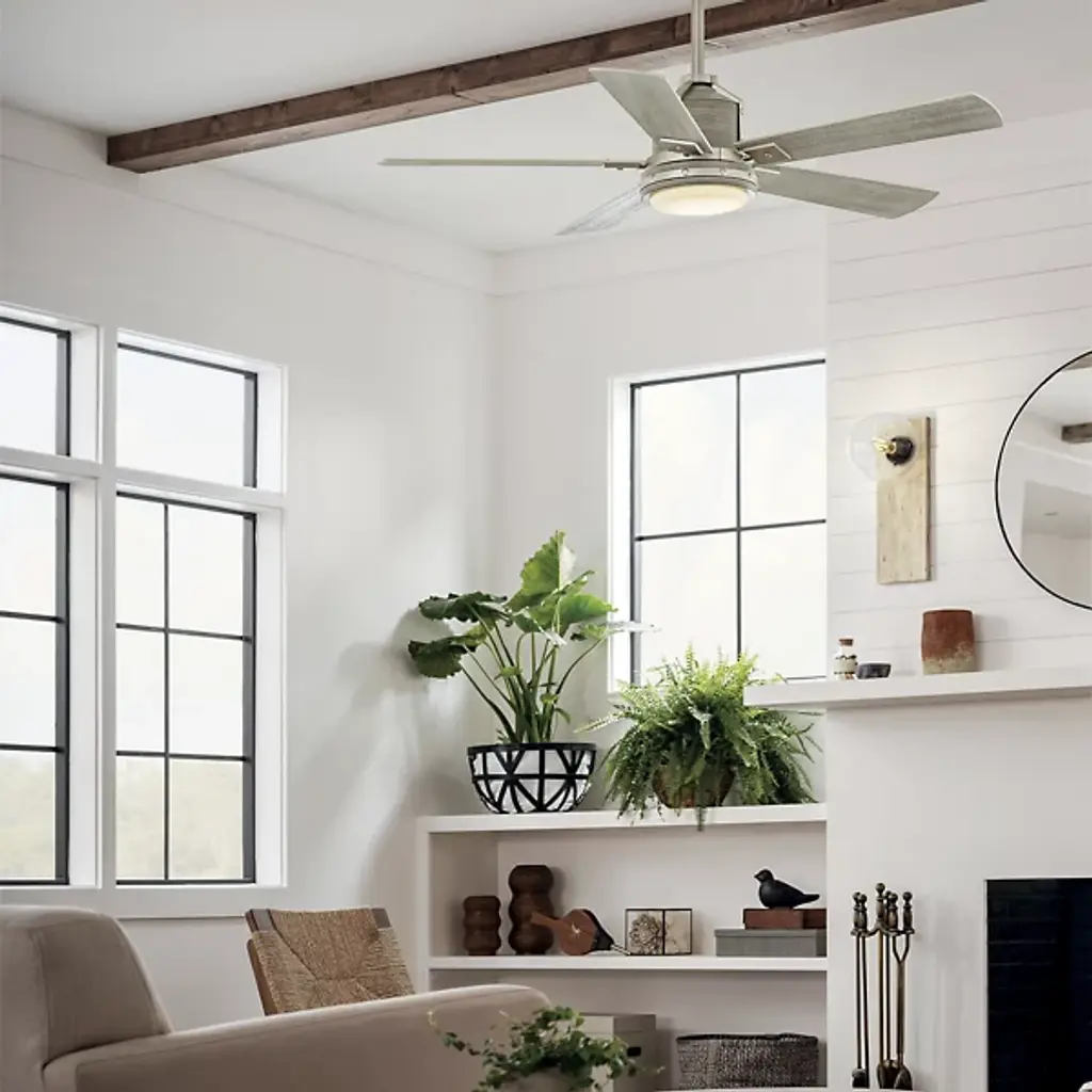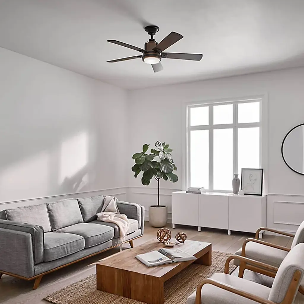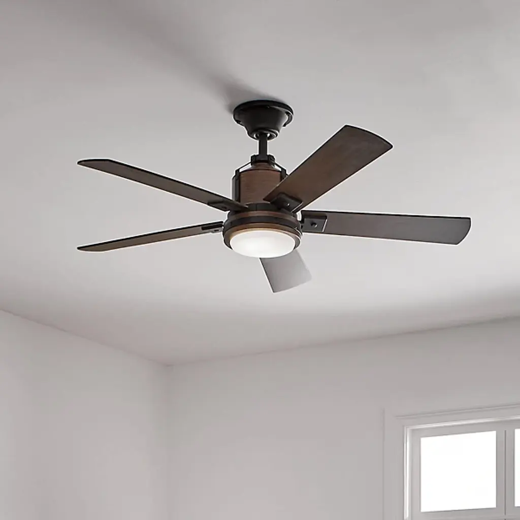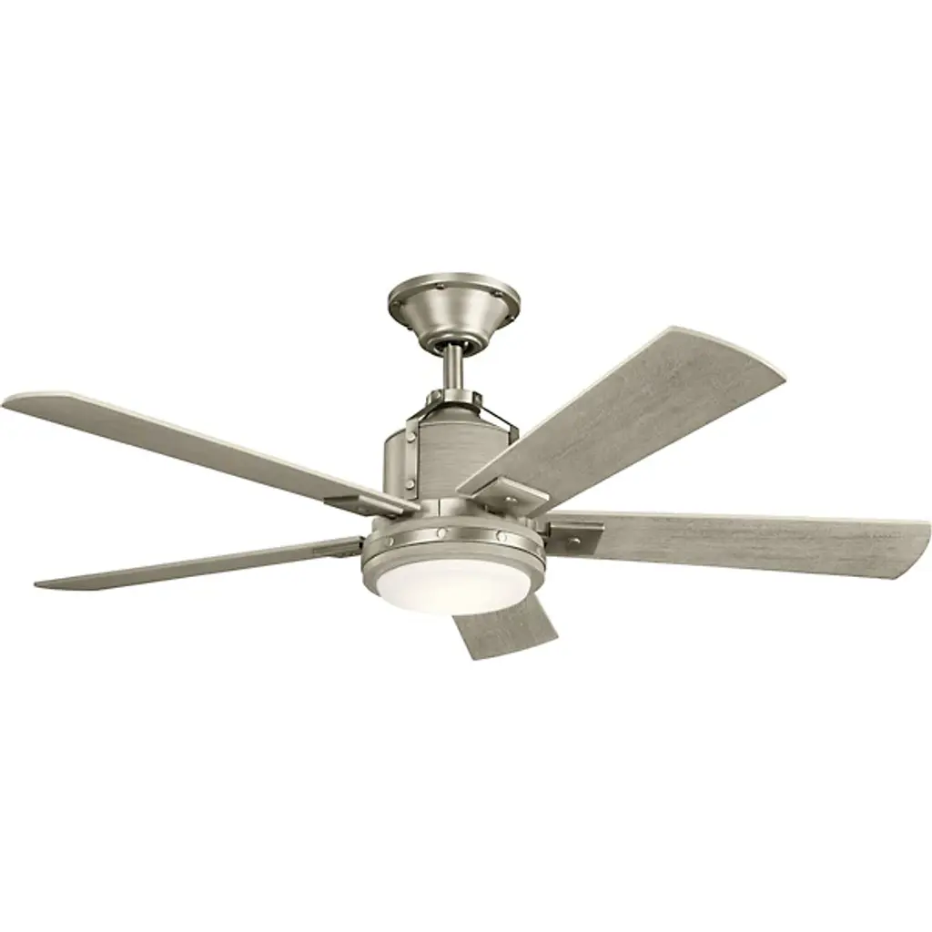 Underlined by familiar accenting, the Colerne LED Ceiling Fan with Light from Kichler puts a smile on one’s face with a surge of refreshing air. It’s a piece combining rustic charm with industrial sophistication. Crafted from metal, the eyes are drawn to the fan’s hardware punctuated by bold rivets. For an antique touch, a wood-like finish covers the body and blades with rich organic texture. At the base, an opal diffuser pops like a bright button when the light comes on. The surrounding blades spin swiftly across various speeds for a tailored atmosphere. An included wall control makes using the piece a breeze.