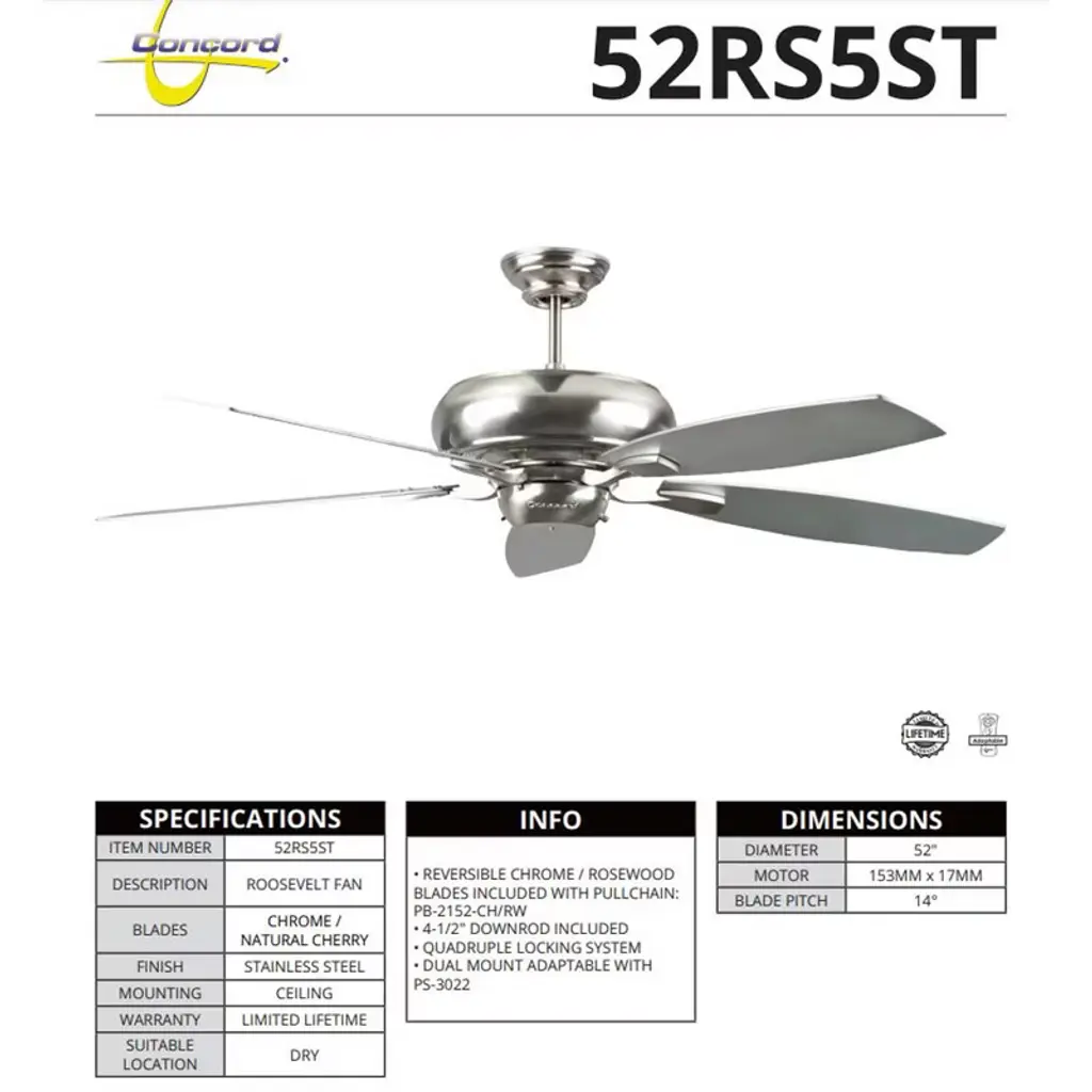 Concord Fans Roosevelt 52" Ceiling Fan, Stainless Steel 52RS5ST The Roosevelt 52" ceiling fan by Concord combines elegance and performance with a sleek stainless steel housing and reversible blades in chrome and rosewood finishes. This fan delivers powerful airflow and reliable operation, making it a stylish and functional addition to any indoor space. Key Features: Size: 52 inches in diameter Mounting: Downrod mount Control: Pull chain control Blades: 5 blades, with a combination of chrome and rosewood finishes Airflow: 5060 CFM (Cubic Feet per Minute) Wattage: 65 watts at high speed Energy Efficiency: Not Energy Star certified Location: Designed for indoor use Finish: Stainless steel Other features: Reversible airflow and adaptable to light kits