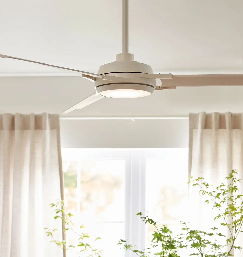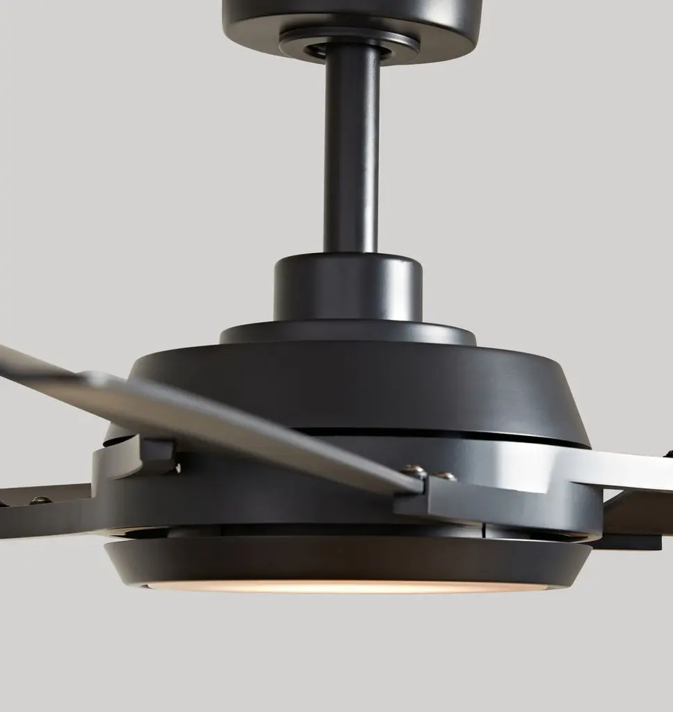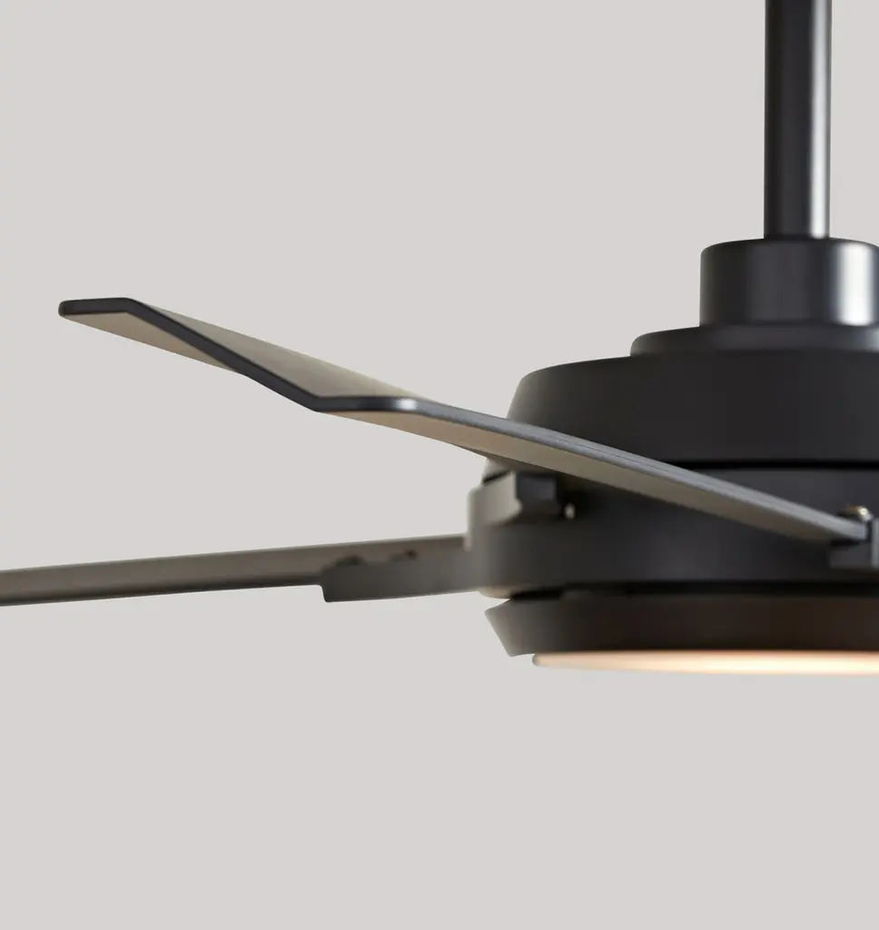 Sleek industrial 3-blade ceiling fan with a minimal profile and an inset LED light. Its energy-efficient design features unique blades that are angled and tapered to achieve the ideal pitch for maximum airflow and a DC motor that uses 70% less energy than conventional alternatives. Details You'll Appreciate Energy-saving DC Motor Integrated LED light 6 speeds with reversible motor Remote control included; not for use with a Rheostat or dimmer switch Additional downrod lengths available Product Specifications Aluminum body with steel canopy and ABS blades Blades and 4-1/2" downrod included; additional downrod lengths available Hang-straight joint accommodates a slight ceiling slope up to 19 degrees Electricity use (high speed): 23W 16W LED light output Lumens: 1100, Kelvin: 3000K Airflow Effiency: MIN 232.98 cfm per watt Air flow (high speed): 6111 cfm Hardwired; professional installation recommended For indoor and covered outdoor use (UL Rated Damp) Imported