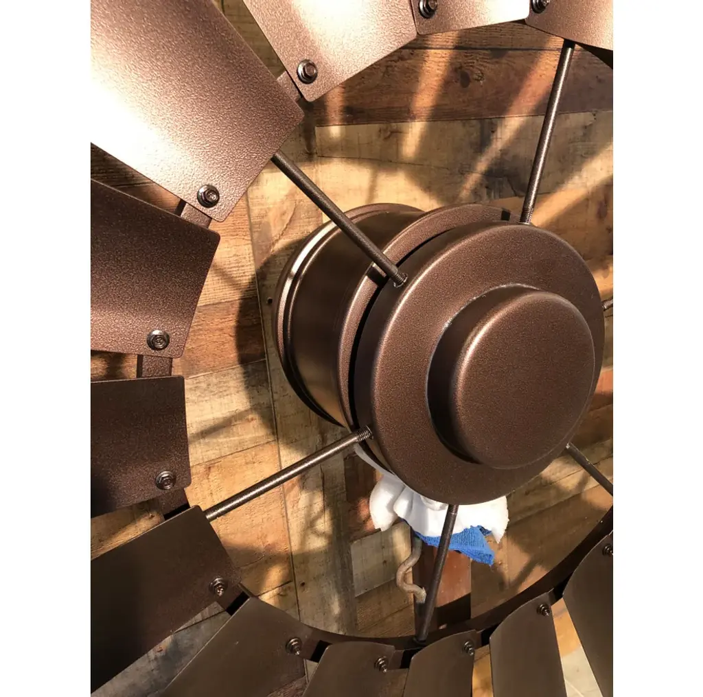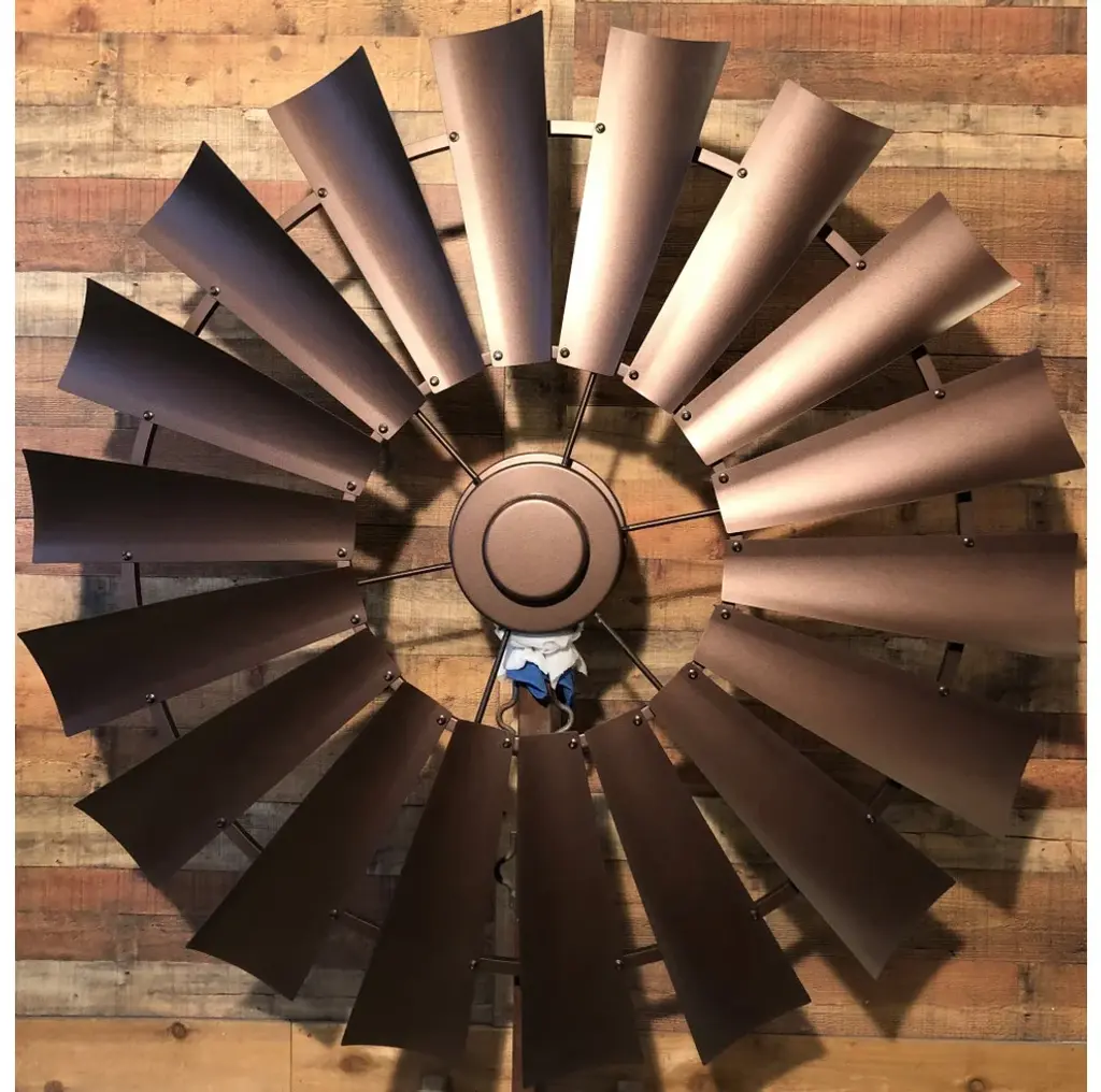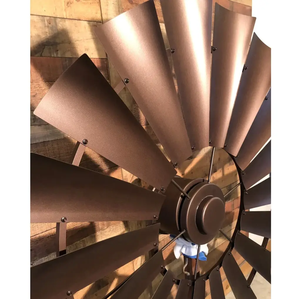 72 Inch Copper Vein Windmill Ceiling Fan, The American Fan- The look of copper vein finish on metal gives the appearance of hammered metal with copper veins flowing throughout. Smooth and mild texture. A Windmill Ceiling Fan with a copper vein finish becomes a stylish home accent for your cozy home decor.Our windmill fans are hand-crafted, American made and truly one of a kind. We are a Texas family-owned and operated business. Each fan is constructed of durable steel and lightweight aluminum allowing for stress-free installation and perfect for interior or exterior placements.Our windmill ceiling fans work well in many settings - dining rooms, great rooms, bedrooms, barns and barndominiums, new builds and renovations, outdoor spaces, vaulted ceilings, ranch houses, farmhouses, cabin living.Easy Installation - standard ceiling supports and electricalEach fan is unique and one of a kindHand-crafted and American madeEighteen Blades for optimal balance (14 blades on the 46")Available in 46", 52", 60", 66", 72", 84" and 96" diameter sizingEfficient motor integration designNone or minimal assembly requiredConstructed only of quality steel and aluminum. Absolutely no molded plastic and particle board!Variable Speed, Geared Motor (Constant gear noise)Includes wall mount variable speed control box/converter, 115 Volt AC input converts to DC current and uses normal electrical wire to fan. Must be used with this motor. Dimensions 5" x 2" depth x 3 "width.CFM rating from 3000-7000Free consultation and adviceAccessory Kit includes everything needed for installationFamily owned and operatedEndless Custom Finishes we can match fixtures, paints, lighting, and moreFan weight is approximately 50-65lbs depending on the size and finishOutdoor damp ratedUp Light available upon request additional feeCan be used on a flat or sloped ceilingWe are the only Windmill Ceiling Fan Company that provides the unique aluminum lightweight, 18 blade design, and custom finishes.Note: Our fans are not mass-produced. Each of our windmill ceiling fans are hand-crafted, they might have slight variances and the rings may not be perfectly round or flat, very similar to an actual windmill in a pasture.Every fan is built, assembled, tested, and balanced with your blades and down rod. We remove the blades for shipping (smaller fan blades can be remain attached upon request). We number each blade and number the frame so you will get the same balanced effect when reattached. Our fans are shipped all over the US and internationally in custom packaging (70"x70"x20").Each fan is shipped with everything you need to hang and operate the fan, instructions, 9" down rod (any size down rod can be requested), c channel steel ceiling mount, and wall control box/converter.