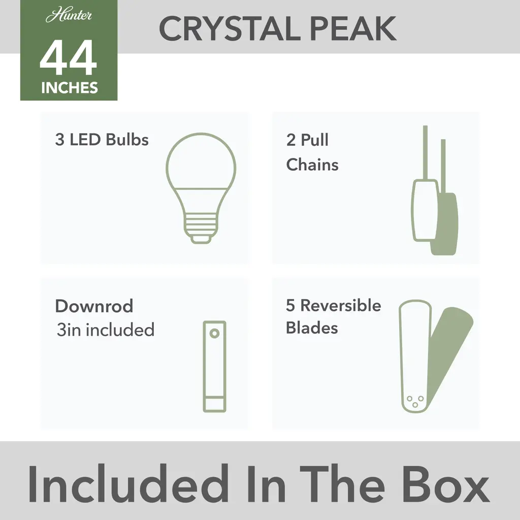The Crystal Peak ceiling fan raises the bar with distinctive styling that adds sophisticated elegance to your bedroom or office space. It's ideal for rooms where you want to create a relaxing, casual atmosphere that makes guests feel welcome and at home. With its energy-efficient LEDs, you can also add an extra touch of elegance while creating a cheerful ambiance. Mix and match with our lighting collection to finish all your spaces.